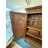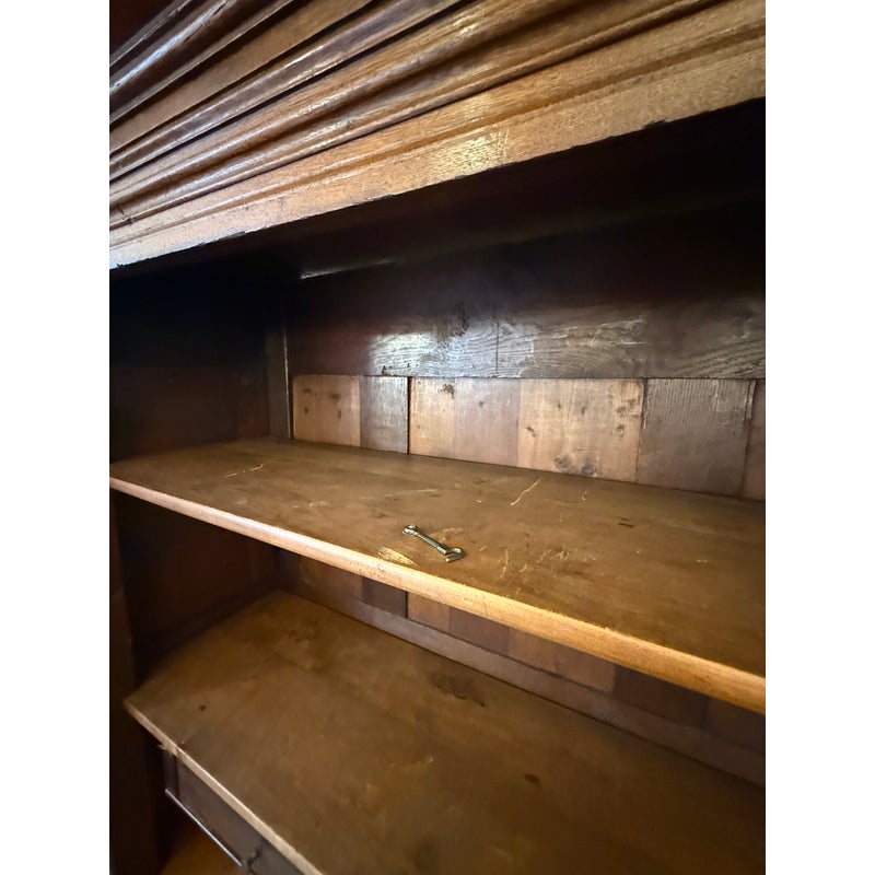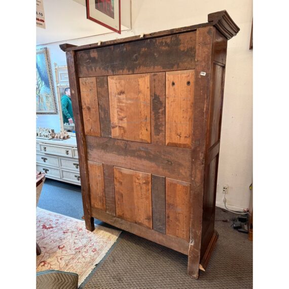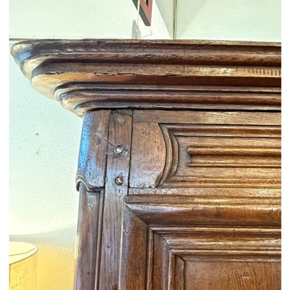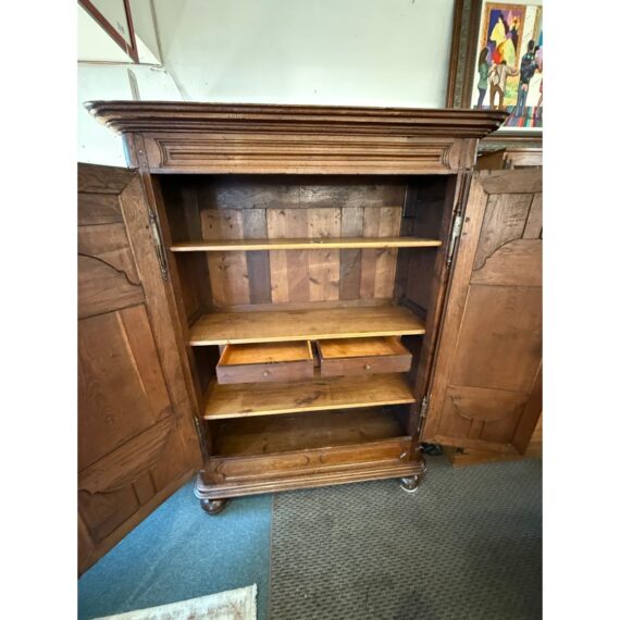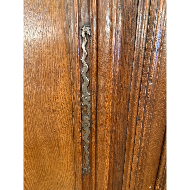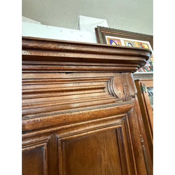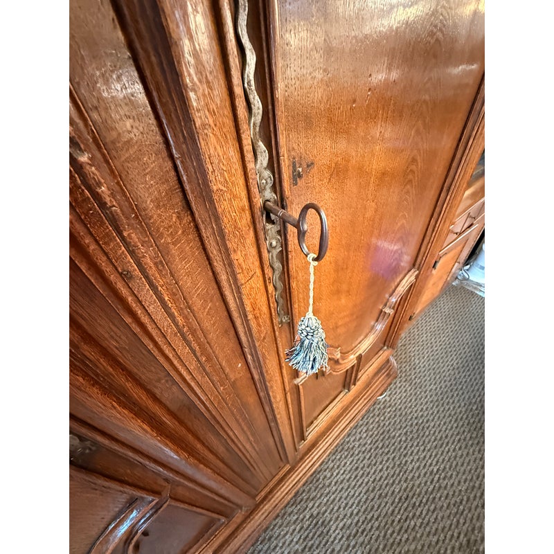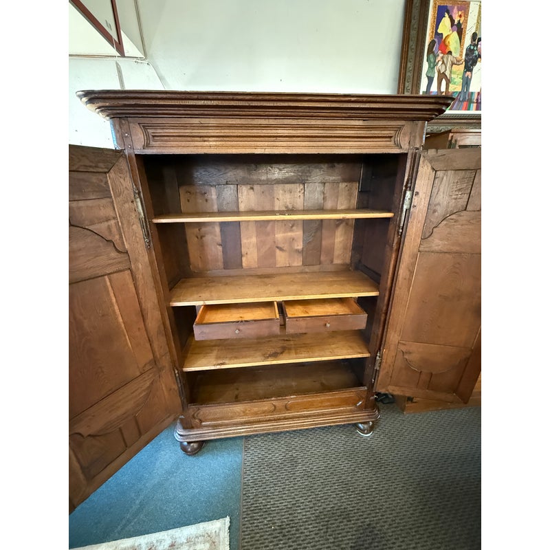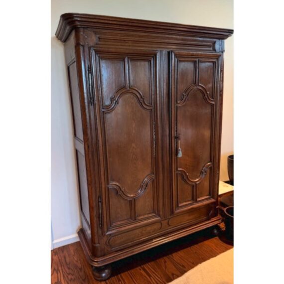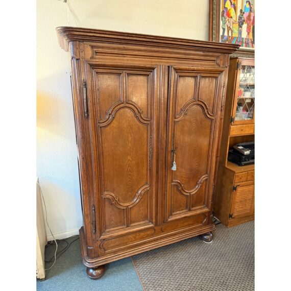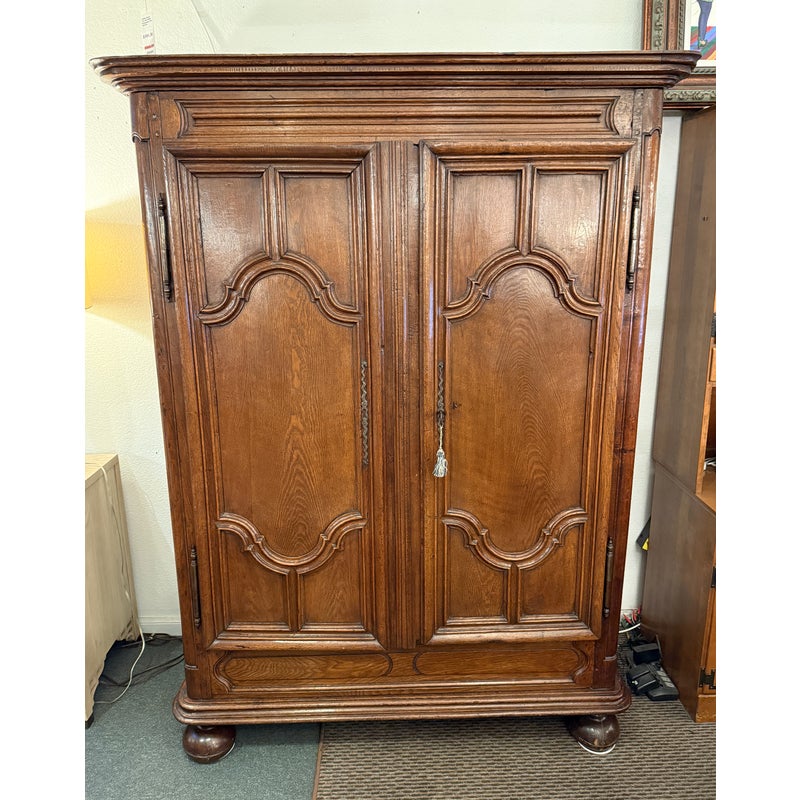 Design Plus Gallery presents an Antique Louis XIV Oak Armoire. The armoire is handcrafted of solid oak wood from France from days gone by; the stately piece that has all the charm you expect. This storage piece includes a substantial beveled crown (removable for transit), intricately carved munions, brass hardware, and includes a locking key. There are tall swinging doors that open to removable shelves and shallow drawers. The elegant and highly functional storage piece is elevated slightly on turned ball feet. Patina and surface wear is consistent with age and use. Made in France.