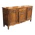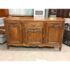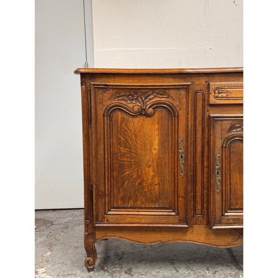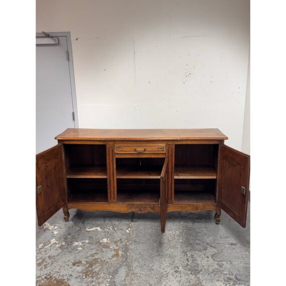 Design Plus Gallery presents an Antique French Louis XV Style Sideboard. Showcasing classic European form with ornate detailing throughout, this sideboard displays carved floral motifs across the paneled doors and apron, paired with a shaped top and gently curving legs that echo traditional Louis XV design. The central drawer provides easy access for smaller items, while the three-door cabinet opens to generous interior shelving suited for dining, living, or entryway storage. Original-style metal hardware and escutcheons are included, and the sideboard comes with keys for the cabinet doors. An elegant and functional addition suited for both traditional and transitional interiors. In good condition, visible surface wear and minimal wear from antique usage.