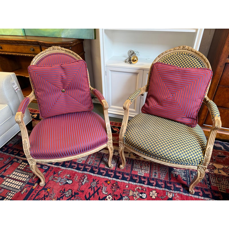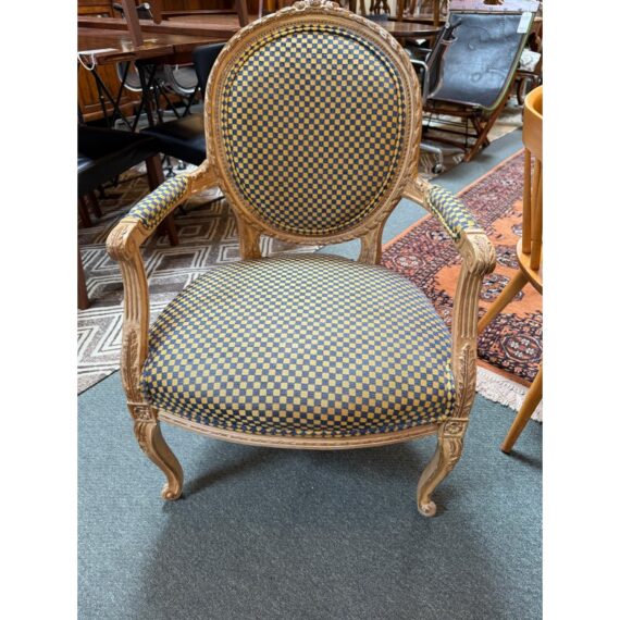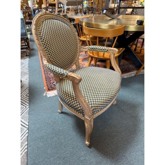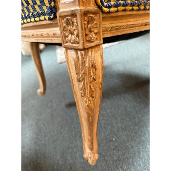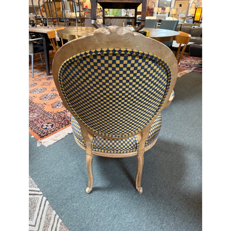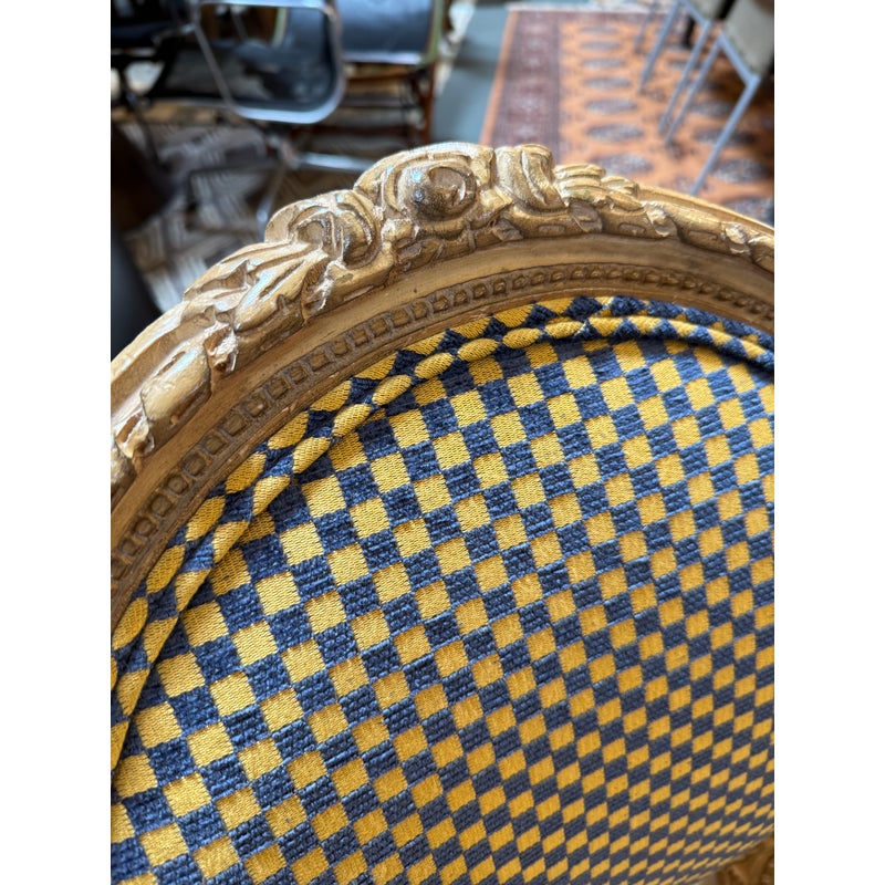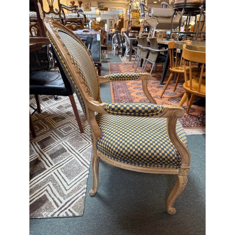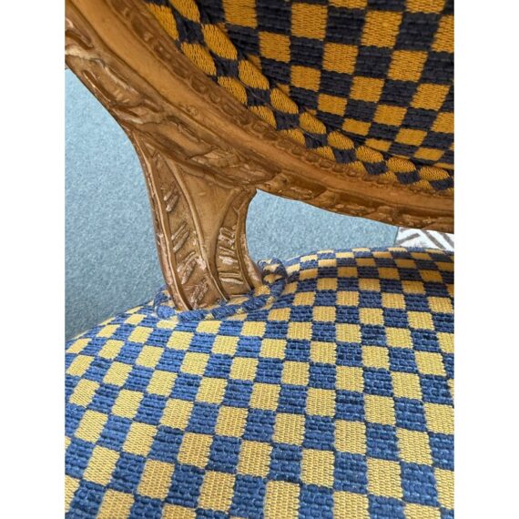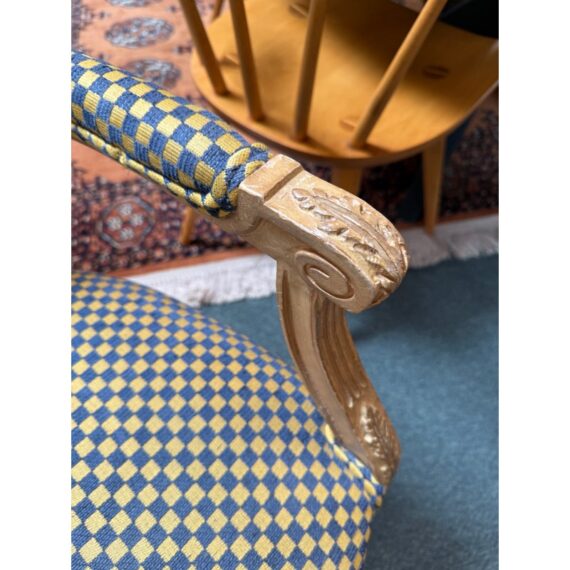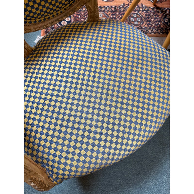 Design Plus Gallery presents a Yellow + Navy Checked Arm Chair of an Antique Age. Well known style of Louis XVI with an updated upholstery of chenille weave that has alternating squares of the same width in regal colors of navy with yellow. The Fauteuil armchair has with carved tapered legs that retains old traces of paint over exposed wood. The chair was purchased over twenty years ago from the Hills Brother Mansion in San Francisco prior to their selling of it in the mid 2000’s. The chair is in good condition for its antique age.