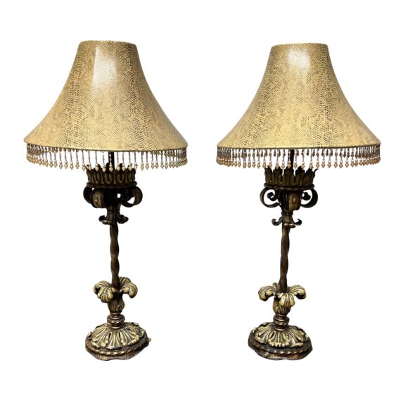 Design Plus Gallery presents a Pair of Antique French Style Table Lamps. Shades have been updated with a neutral snake skin pattern. Table lamps are missing finials. Bases are curved from metal with a paint finish of ivory and bronze. There is visible wear through out, pair is in good condition.