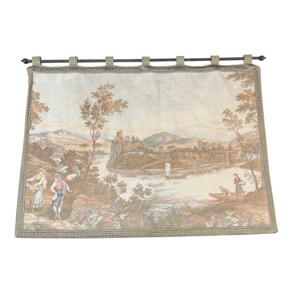 Design Plus Gallery presents Vintage French tapestry. With muted hues depicting a river overlook outside a city’s ramparts, a pair enjoy conversation in the lovely countryside. Mechanical Jaquar manufacturing in wool with cotton backing. Antiqued brass rod included for mounting and display. Antique condition with light fading; consistent with age and use.