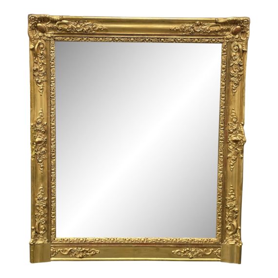 Design Plus Gallery presents an Antique Mantle Mirror. This antique gold finish mantle wall mirror is a truly exquisite piece of home decor. With its solid wood construction and intricate, ornate framing, this mirror is a stunning addition to any room. Its elegant design is specifically built to hang above a fireplace mantle, adding a touch of sophistication and grace to the space. However, this mirror is not limited to just one location. It can also be placed above a sideboard, bar, desk, or in any other area of the home where a touch of old-world charm is desired. The antique gold finish gives the mirror a sense of timeless beauty, and has aged gracefully over the years, making it a unique and one-of-a-kind piece. This mirror will not only add visual appeal to any room, but also bring a sense of history and character to your home. It is a perfect blend of functionality and elegance, making it a must-have for any antique or vintage decor lover. In good condition, with visible patina from age + usage.