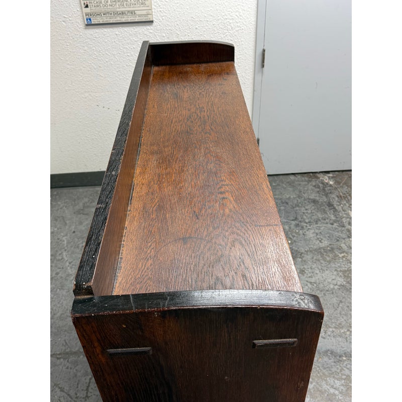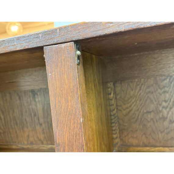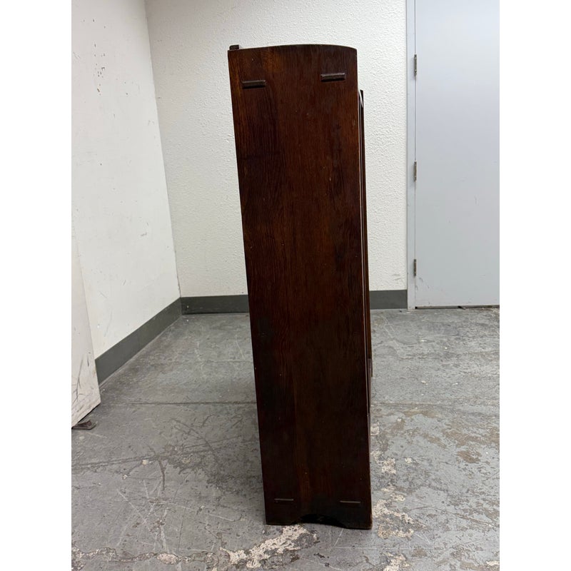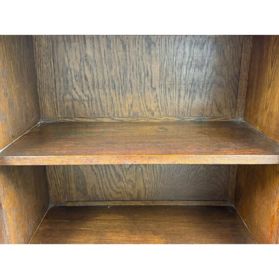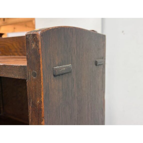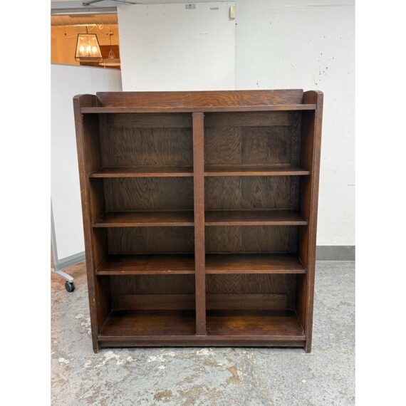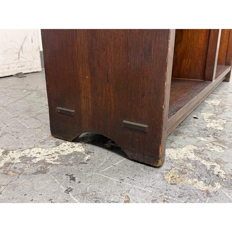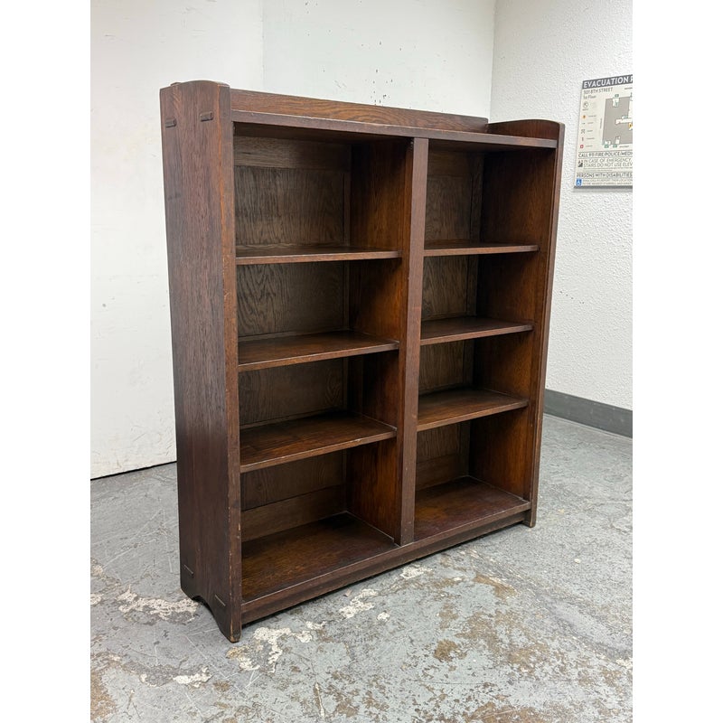 Design Plus Gallery presents Double Bookcase by Gustav Stickley. Made from solid wood by some of the finest in American Arts & Crafts, Mission style furniture. The bookshelf is double exposed with three shelves on either side that make up four placements, eight overall for storing keepsakes, books, etc. There are shaped panel supports that join the shelves. The bookcase is signed with joiner’s compass decal on the back and is no longer in production with the brand. It is in good antique condition for its age + use. Made in the USA.