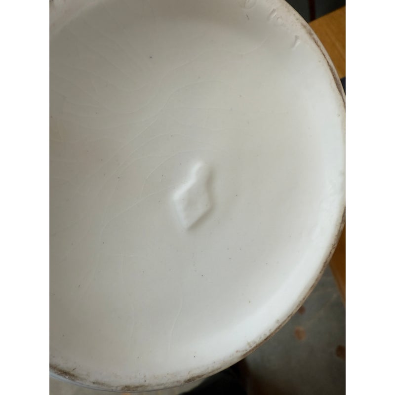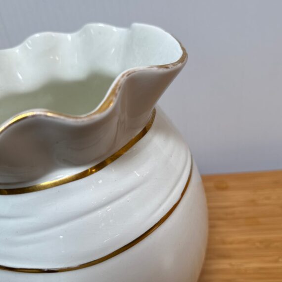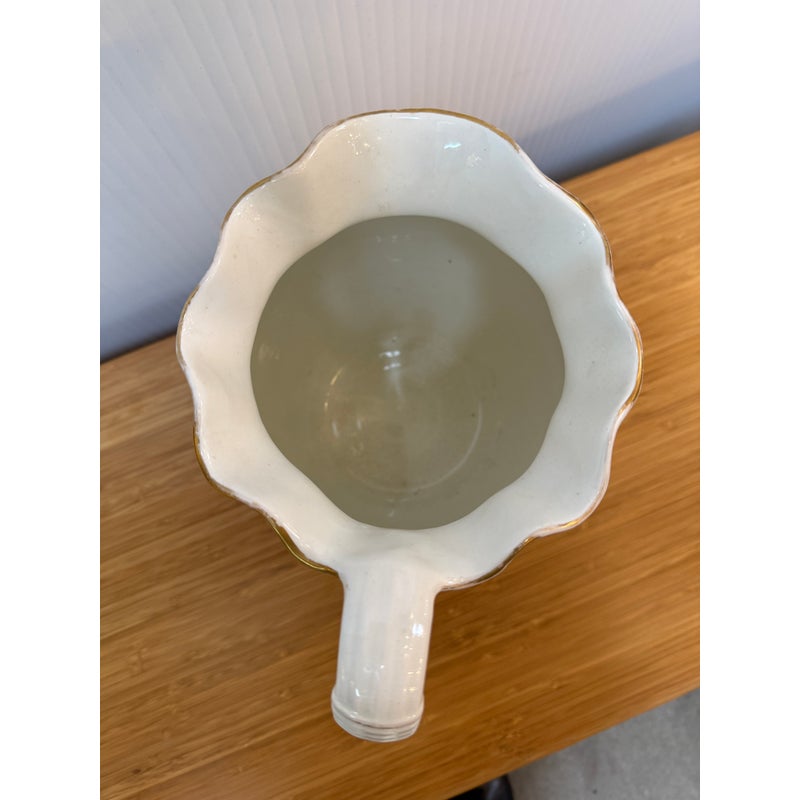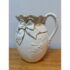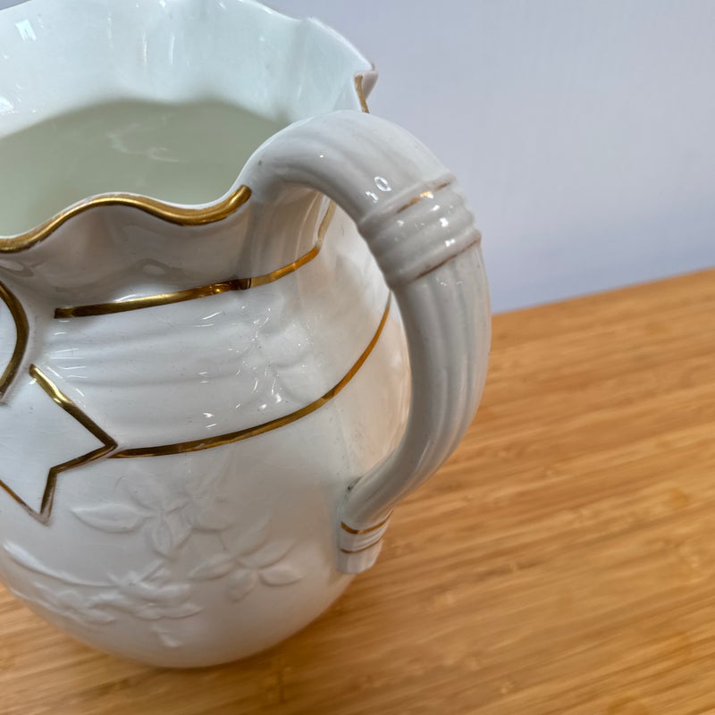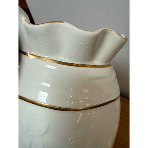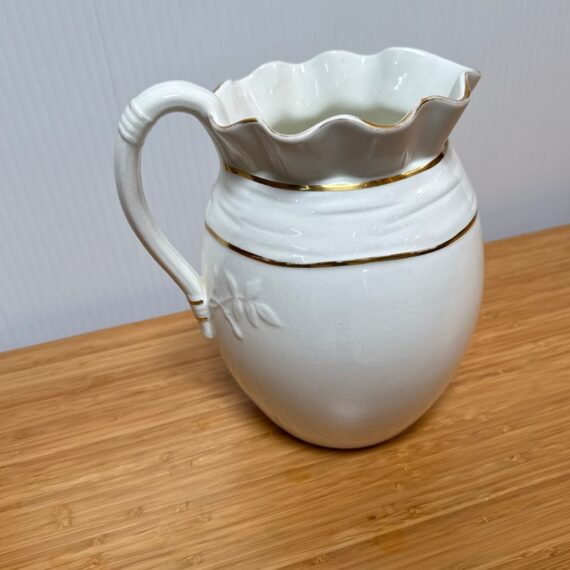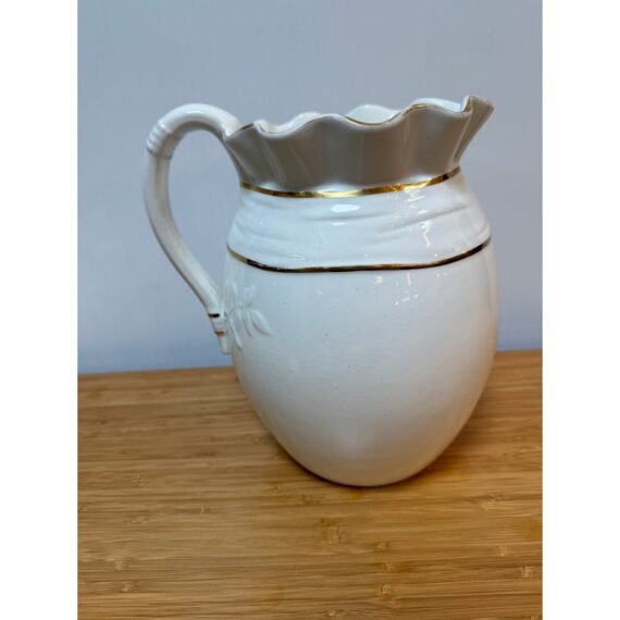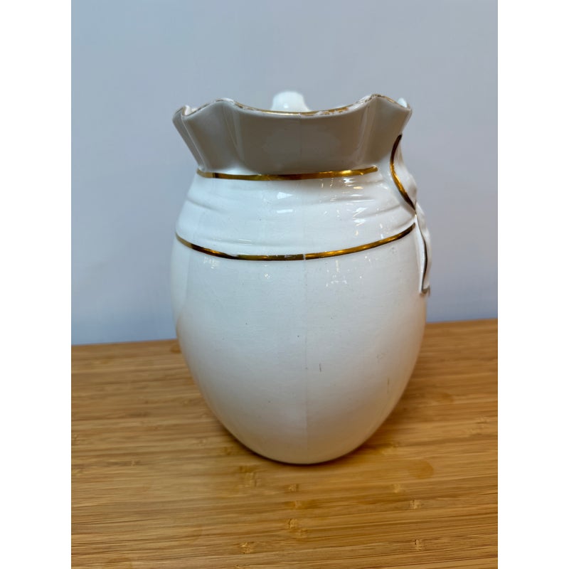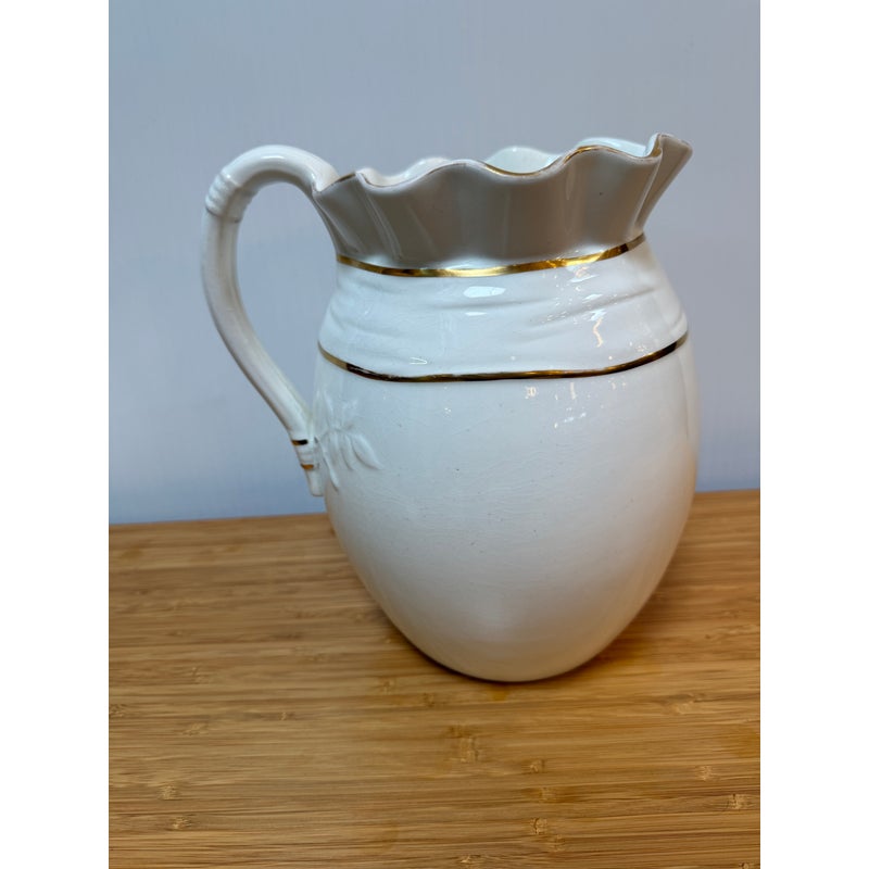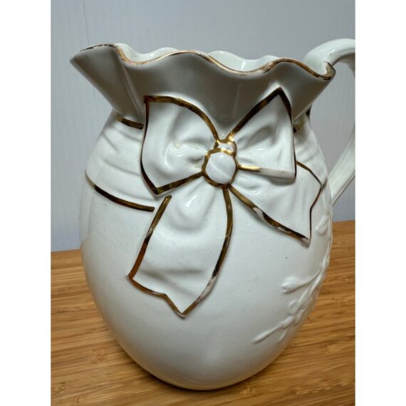 Design Plus Gallery presents an Antique Ironstone Pitcher. The large, lovely pitcher is embellished with gold banded bow and embossed with a lovely floral vine pattern. The large handle and ripple opening will make serving even water a pleasure. Light surface wear; condition is good for age and use. Maker’s mark on bottom.