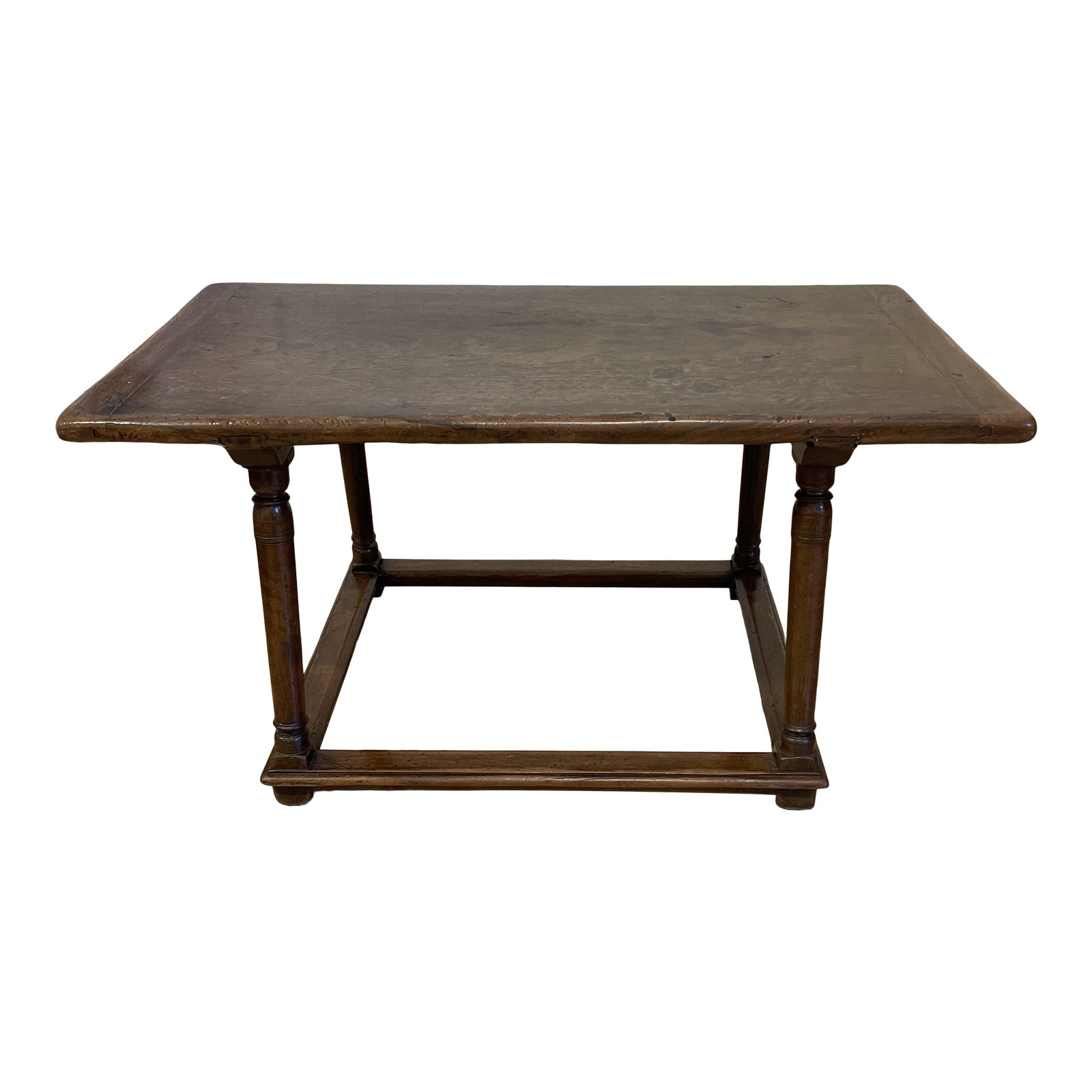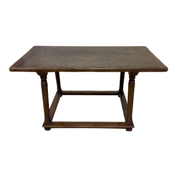 Design Plus Gallery presents a Antique Jacobean Style Coffee Table. Box trestle base utilizes trusts connecting to pillared legs. Top has a soft time worn patina with a gentle appeal. Visible wear adds to the old world charm. Coffee table is in good condition. Table height is slightly taller than standard.