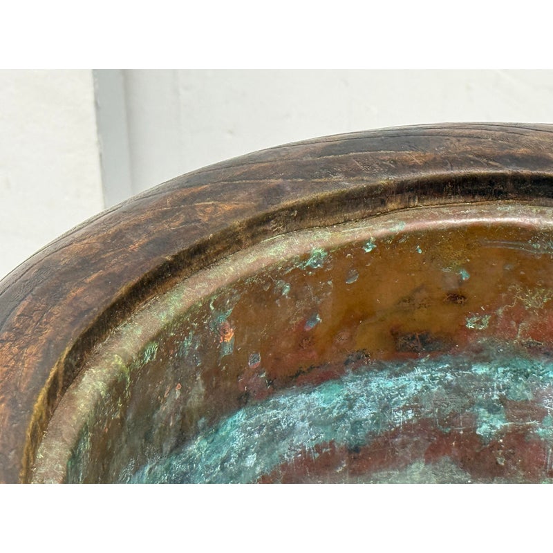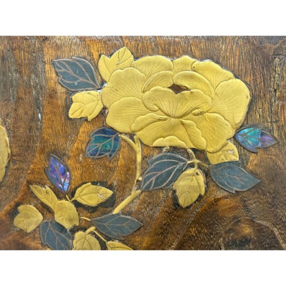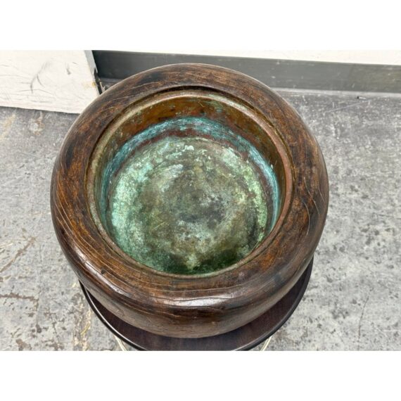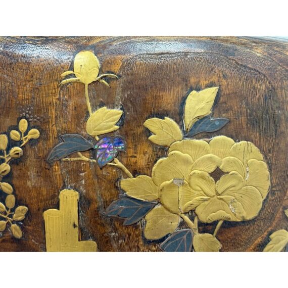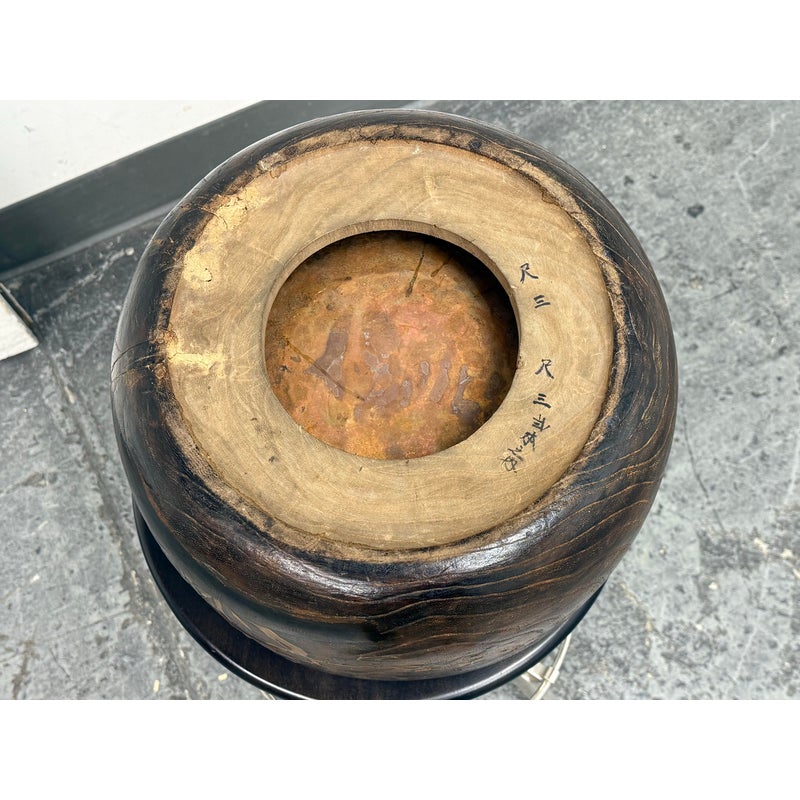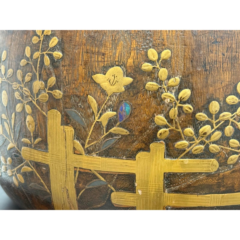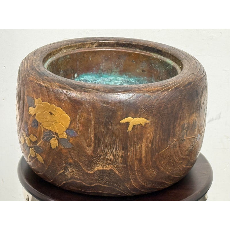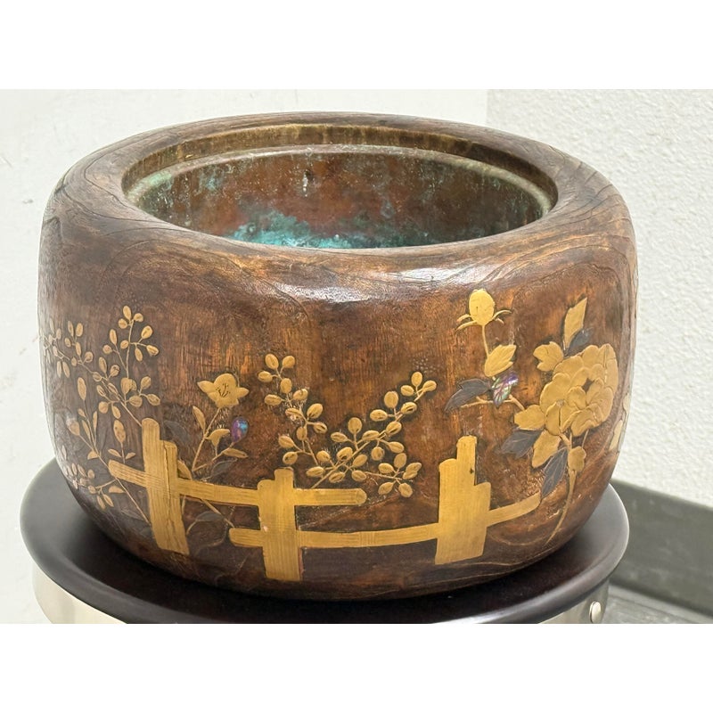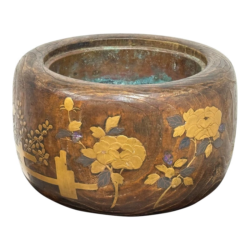 Design Plus Gallery presents an Inlaid Wood Japanese Planter/Hibachi Cachepot. This antique Hibachi, crafted during the late Meiji era in Japan, is made from turned Paulownia wood, also known as Kiri-noke. The piece is beautifully decorated with gilt, lacquer, and inlaid mother of pearl. Originally designed for home heating, hibachis are often repurposed as cachepots, planters, jardinières, ikebana vessels, or simply used as decorative objects. It includes the original copper liner. It is in very good condition, with wear to metal liner and minor imperfections as shown. Is in good condition for its antique age + use, visible distress and patina.