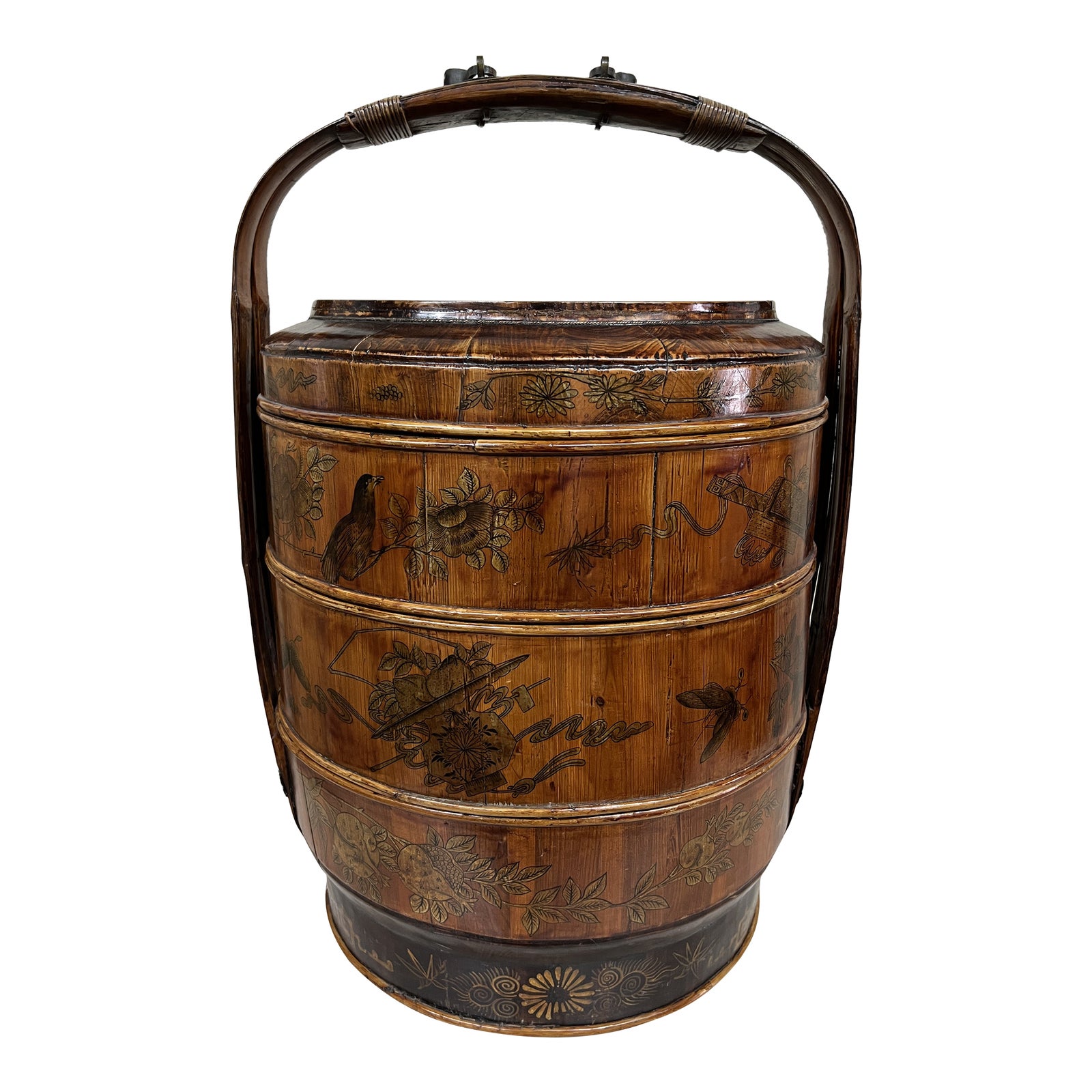 Design Plus Gallery presents an Antique Japanese Marriage Box. A Juniquely beautiful storage vessel, the japanese marriage box has three round sections of varying depths. The lacquered bos has a large fixed bamboo handle and is painted in black and gilt with birds, trees and floral sprays. Cast brass details at base and on handle. Antique condition consistent with age and use.