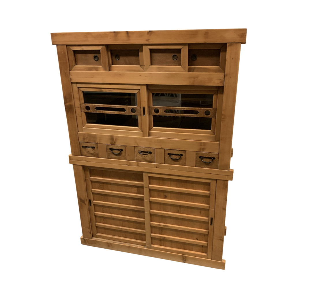 Design Plus Gallery presents an Antique Japanese Tansu with integrated lighting. Modular capability allows for side by side configurations and usage in different spaces. This item was updated with glass panels and over head lighting. Unique combination of sliding doors, drawers and glass display cabinet can be used for many applications