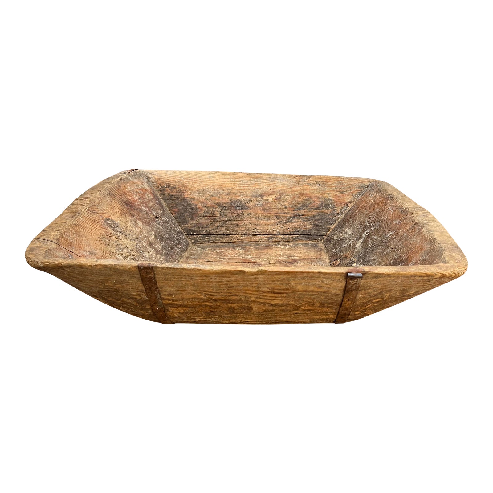 Design Plus Gallery presents the Vintage Large Banded Metal Wood Dough Bowl. This rustic heavy bowl is an authentic production from France. It was constructed with banded metal and reclaimed wood. Visible and minor wear from use and age; bowl is in good condition.