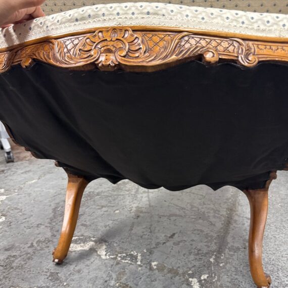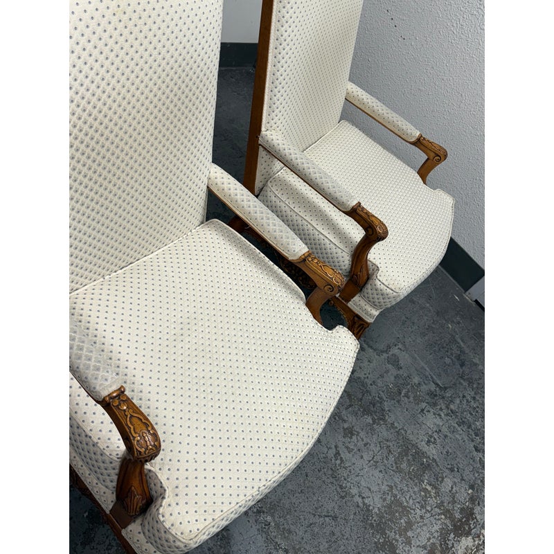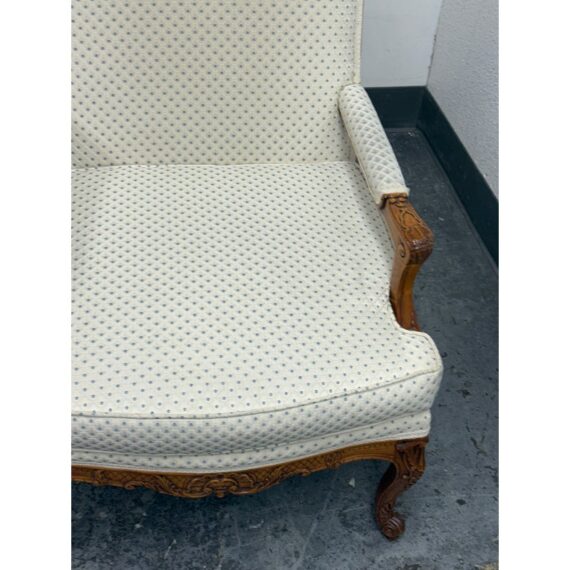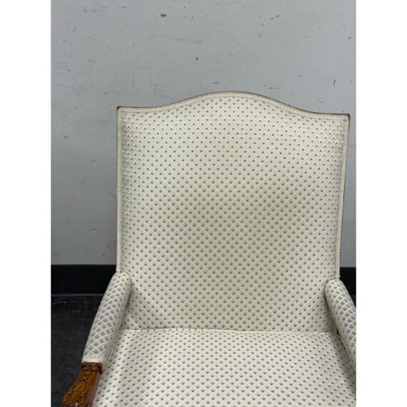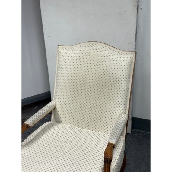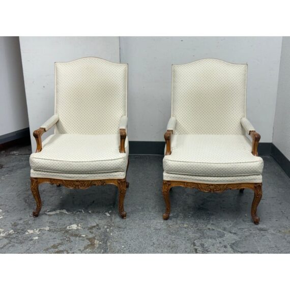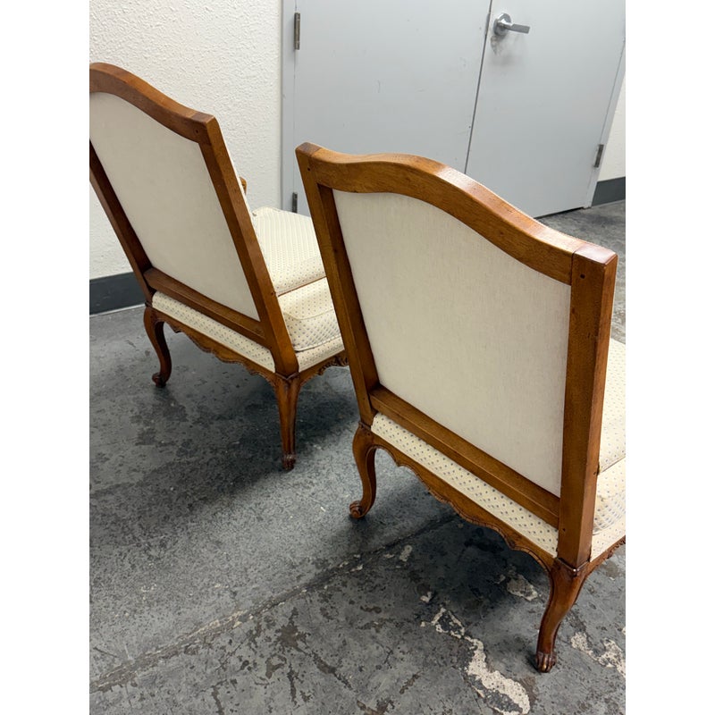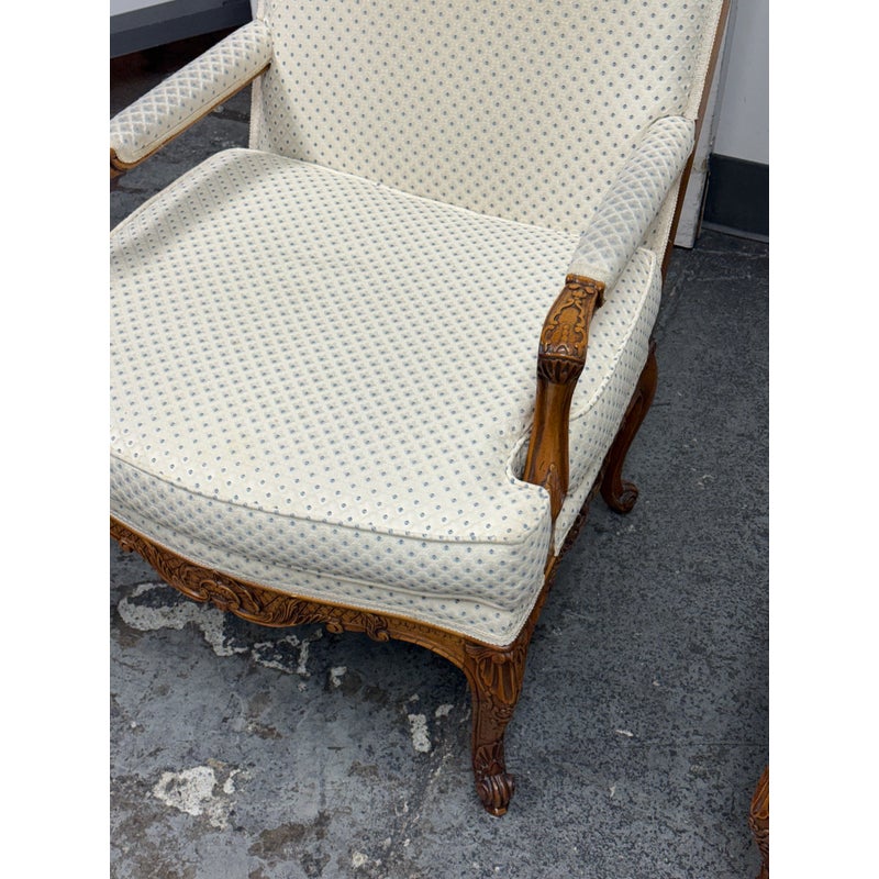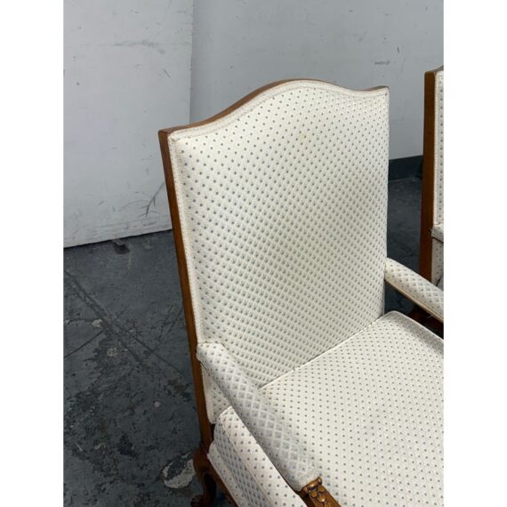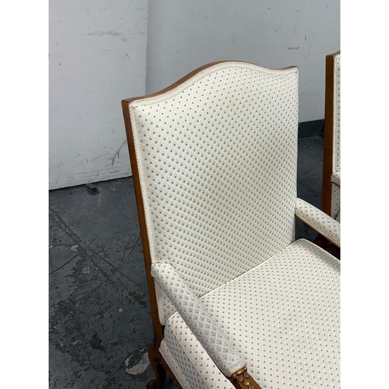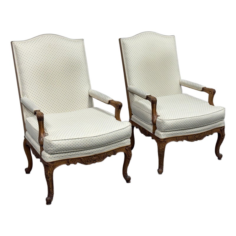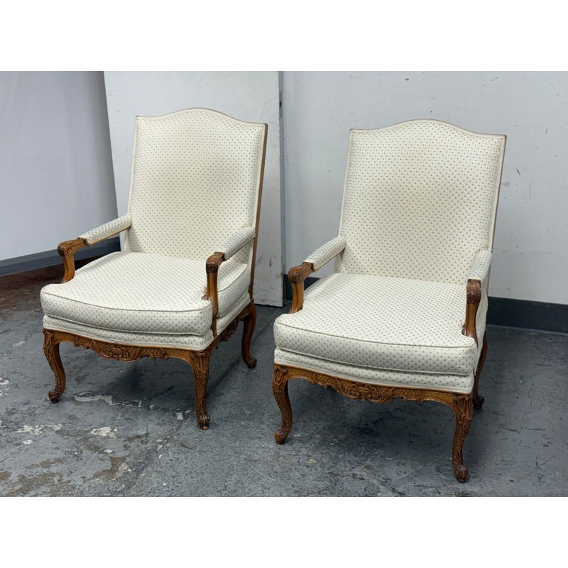Design Plus Gallery Pair of Early 20th Century Louis XIV Fruitwood Armchairs .Elevate your living space with this distinguished pair of Louis XIV fruitwood armchairs, sourced from Rue de Grenelle Antiques, San Francisco. These armchairs are expertly crafted from solid fruitwood, showcasing a rich, medium-toned finish that highlights the elegant curves and subtle ornamental detailing characteristic of the Louis XIV period. Each chair is thoughtfully upholstered in an off-white diamond-patterned fabric accented with delicate blue dots, lending a subtle pop of color and refined charm. The classic lines are complemented by gently curved armrests and an exposed back, creating an open, airy silhouette. Both chairs feature loose seat cushions for added comfort. In good condition, visible and minimal wear on frame + fabric.