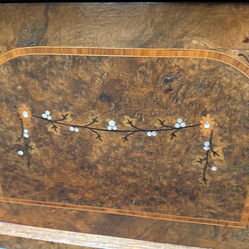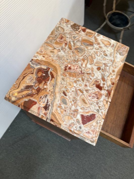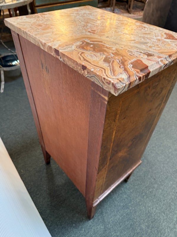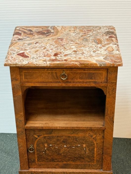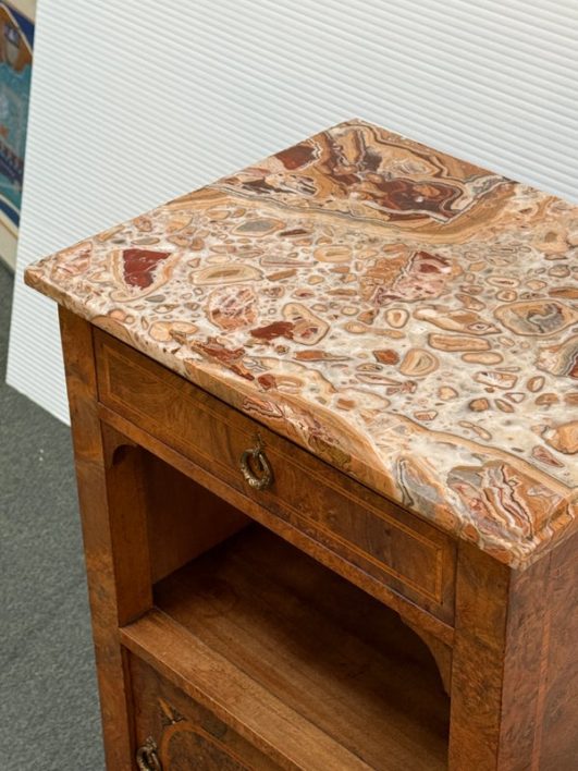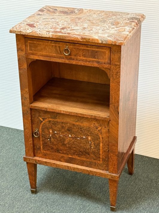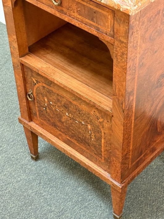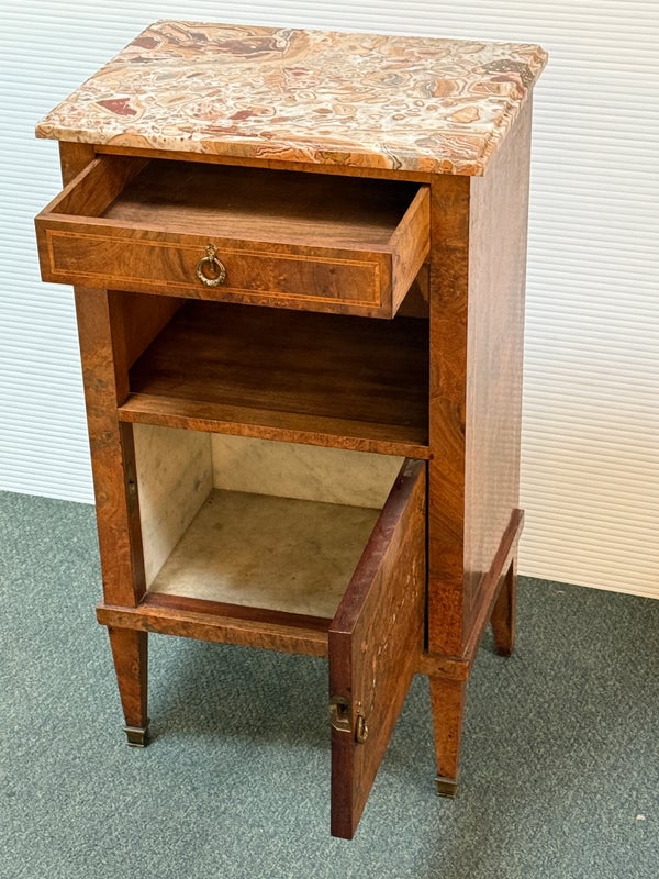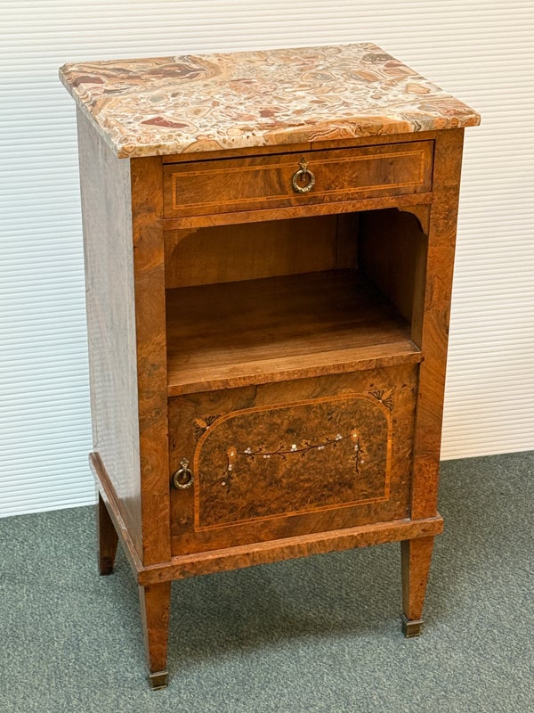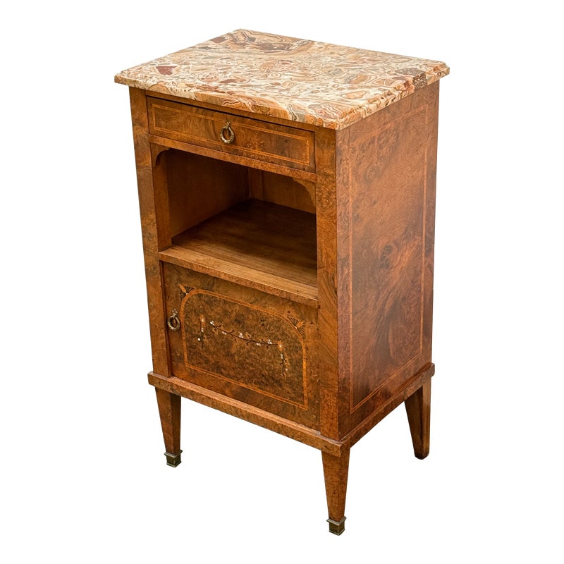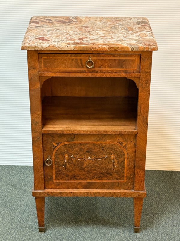 Design Plus Gallery presents a lovely Antique Louis XVI Bedside Table. Handcrafted of solid oak with burled wood insets and floral motif. The dovetailed shallow drawer combines with open and closed cubbies for ample storage. Beveled edge Palomino Quartzite topped this lovely nightstand with a rosy glow. Cast brass fittings. Light surface wear; condition is good for age and use.