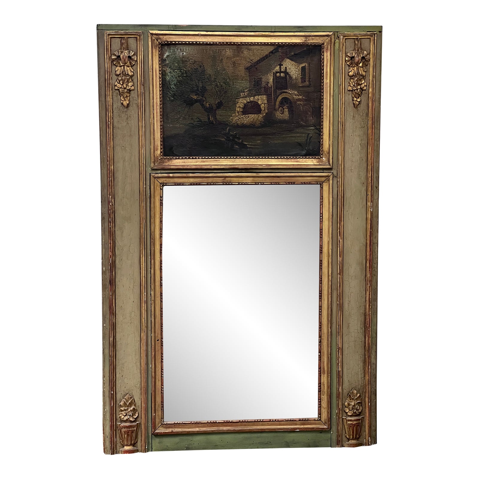 Design Plus Gallery presents an Antique Louis XVI Style Painted and Parcel Gilt Trumeau Mirror Circa 1875. Dating back to the fourth quarter of the 19th century, is a stunning piece of functional art. It is part of the estate of Katherine Elkins Boyd, and includes designs by the renowned Frances Adler Elkins. The mirror features a rectangular plate, bordered by a delicate bead and reel banding. On each side of the mirror, there are beautifully carved panels adorned with intricately detailed floral swags and baskets filled with flowers. These panels add a touch of elegance and richness to the mirror’s overall design. The highlight of this trumeau mirror is the remarkable painted oil panel that sits on top of it. This panel depicts a picturesque scene featuring figures in front of a mill house and a flowing stream. In the background, there is a stunning forest and meadow, which adds a sense of tranquility and serenity to the piece. The combination of the painted oil panel and the detailed carvings make this mirror a true work of art. Overall, this antique Louis XVI style Trumeau mirror is a rare and remarkable piece that showcases the fine craftsmanship. Visible and minor wear from usage + age. Natural distress