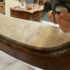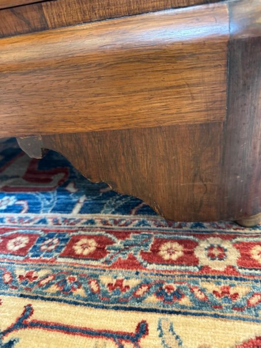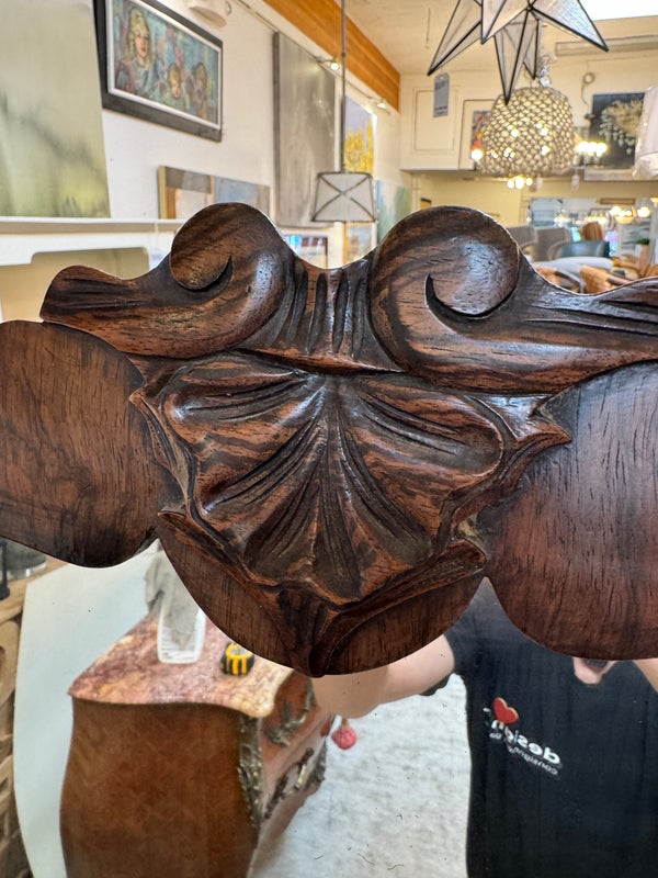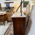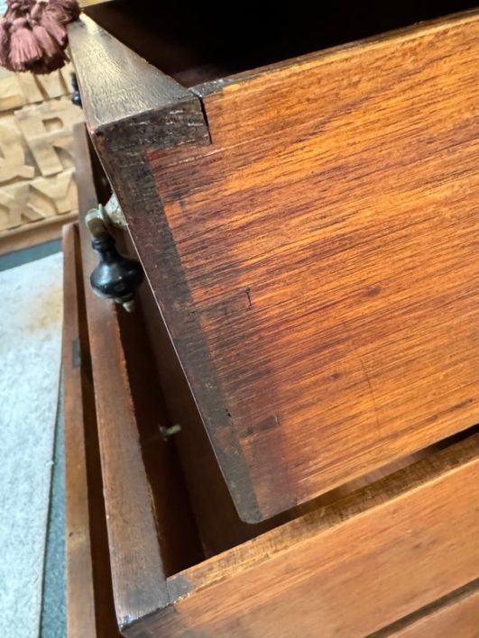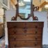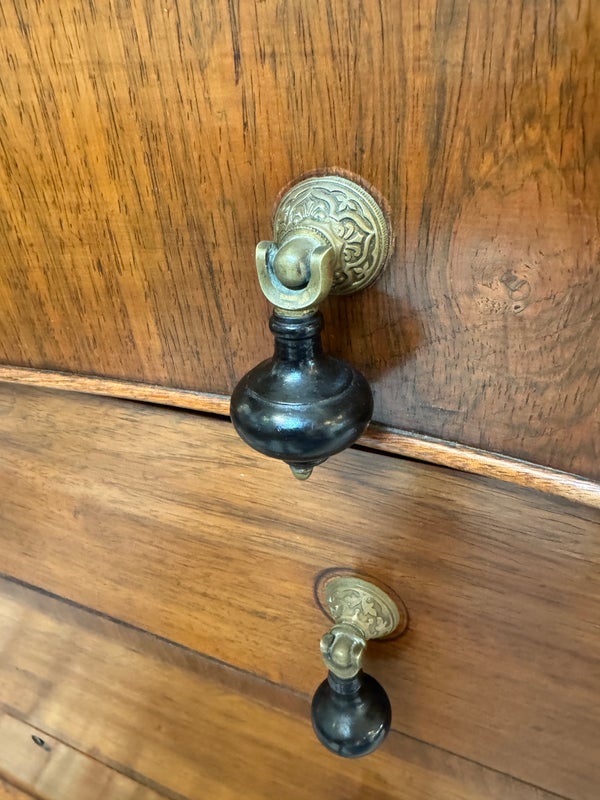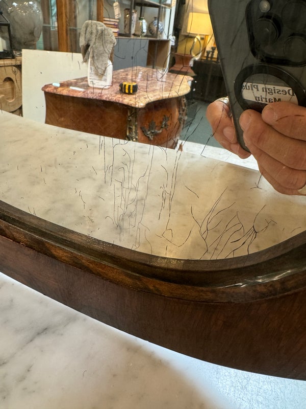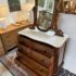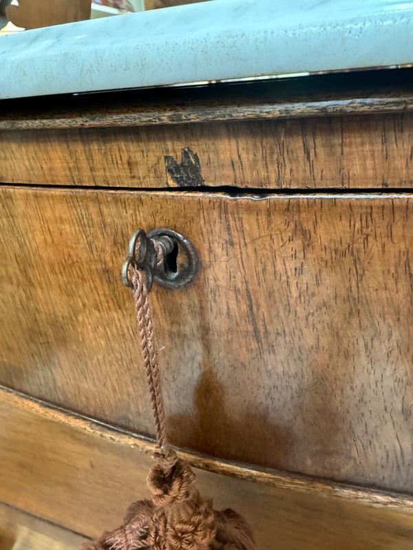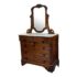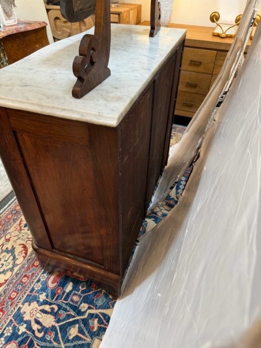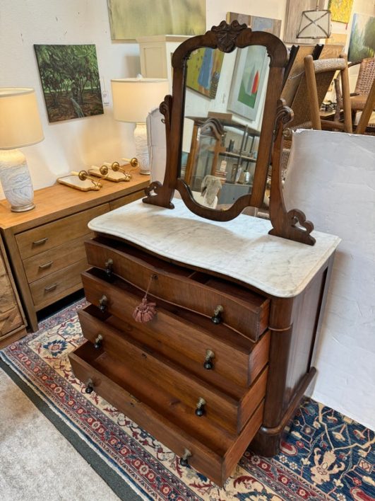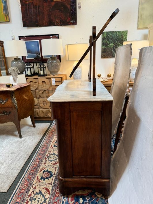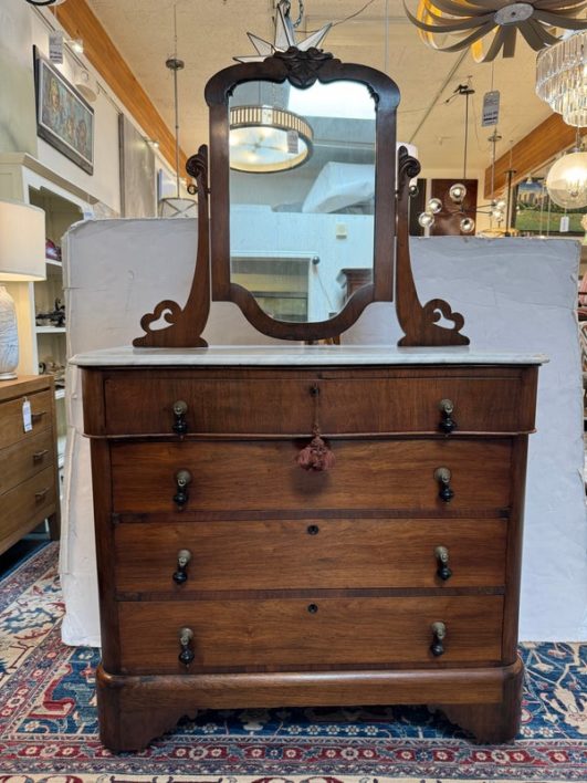 Design Plus Gallery presents an Antique Dresser with Mirror. Beautiful solid wood and veneers, handcrafted joinery and attention to detail make this storage truly special. Cast brass and turned knobs, beveled serpentine marble, and carved frame adjustable mirror make function lovely. Surface wear evident; condition is consistent with age and use.