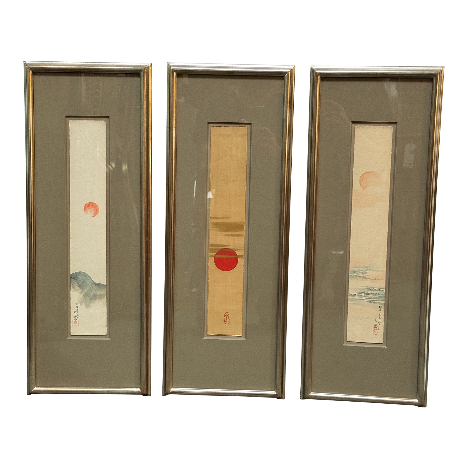 Design Plus Gallery presents an Antique Meji Triptych. Depicting phases of the sun as it progresses through New Year’s Day 1892, a lovely professionally matted and framed trio delights. Little evidence of wear; condition is good for age and use.