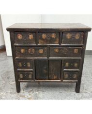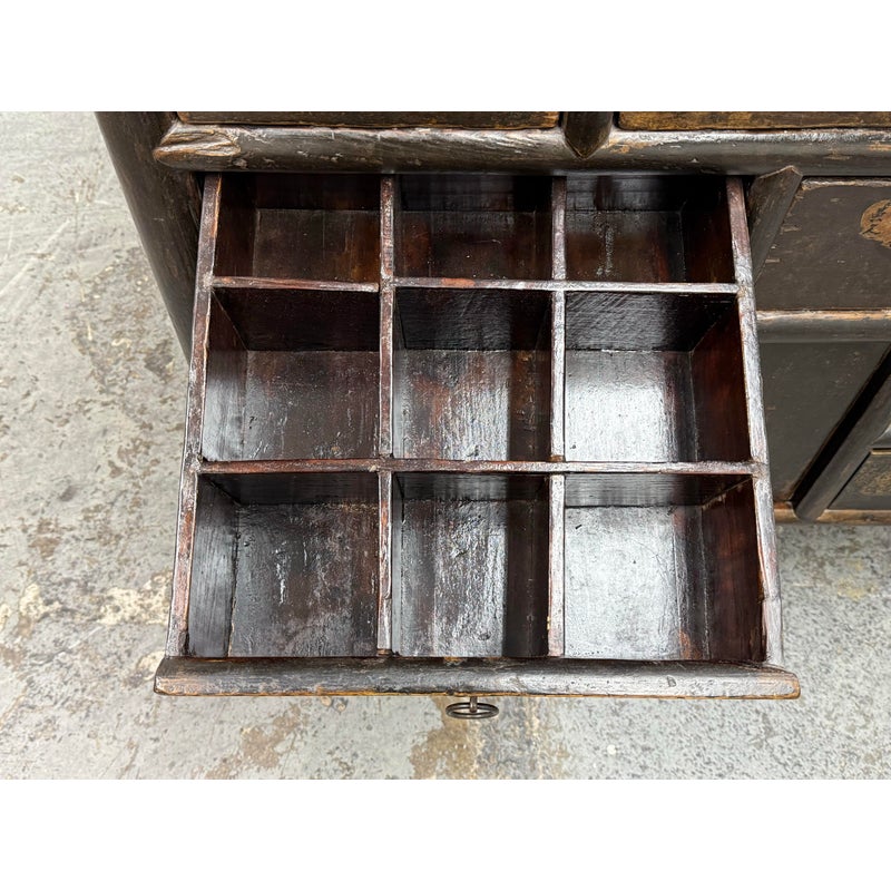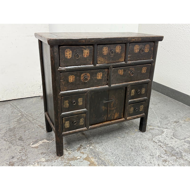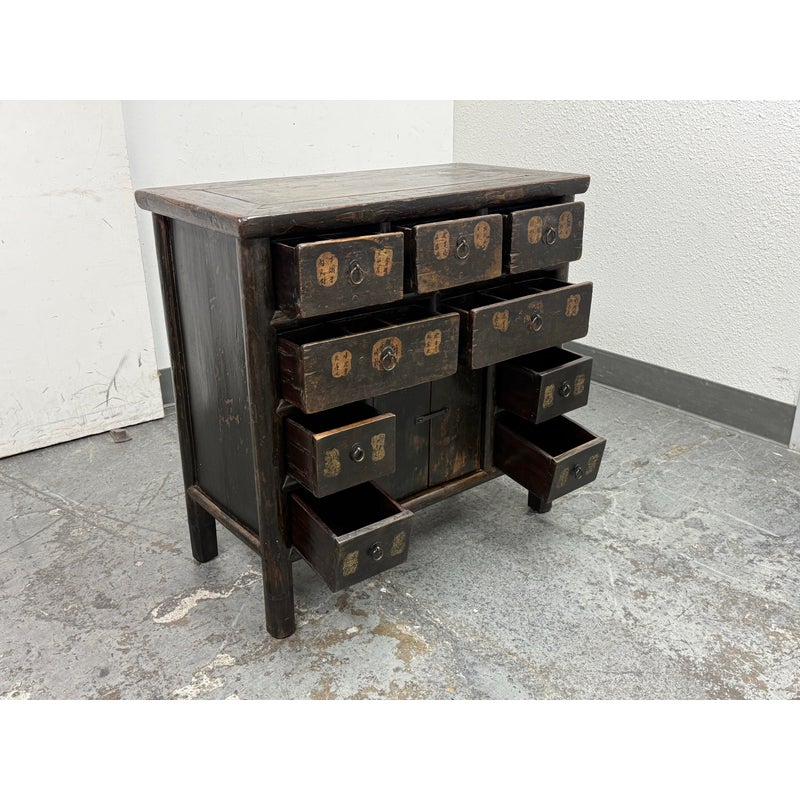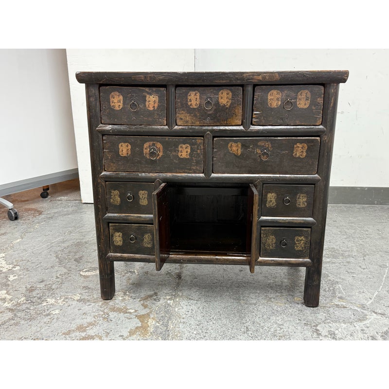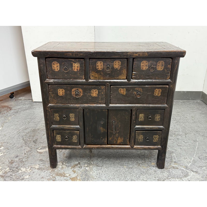 Design Plus Gallery presents an Antique Asian Cabinet from Mongolia. This free standing cabinet is composed of a dark stain rose wood with multiple drawers and even cupboard doors near its base. The top five drawers all have internal dividers; upper three have four cubbies each and the lower two drawers have nine cubby boxes each. There are two lower drawers on each side of the cabinet doors which open to reveal an open cavity. The drawers also have hand written Chinese characters beside each pull tab, its original hardware. Overall the antique piece shows signs of wear that is consistent its age + use.
