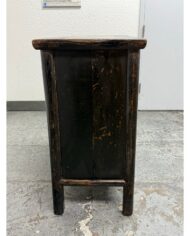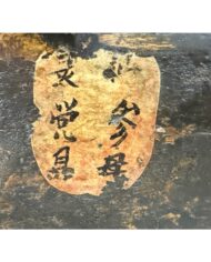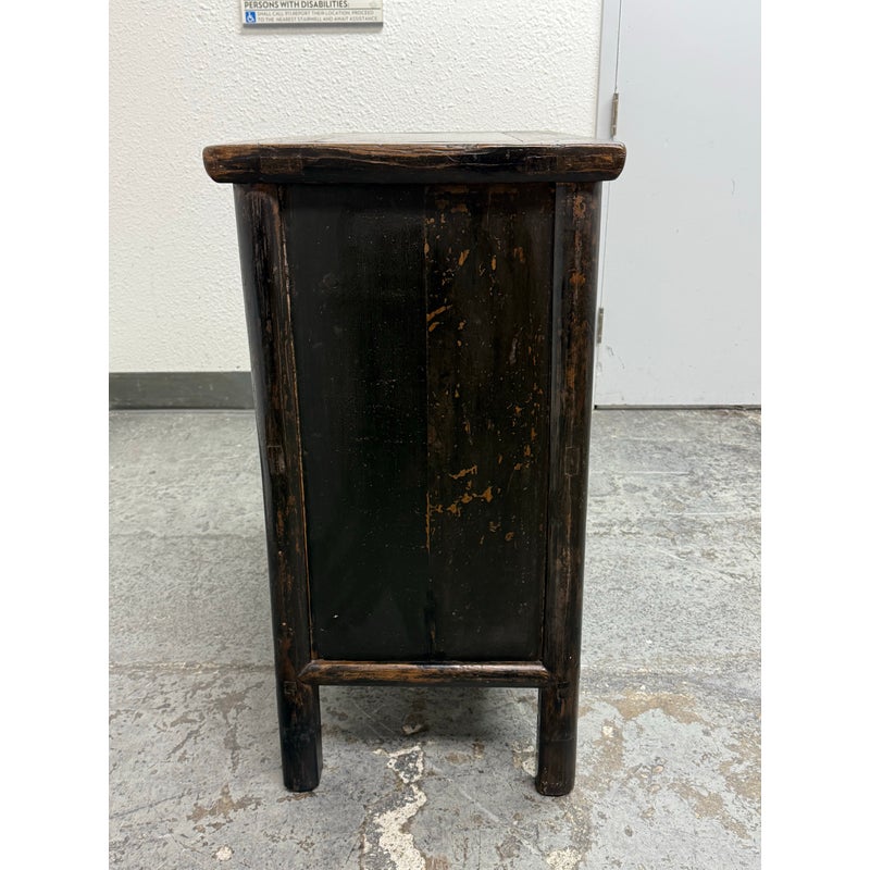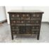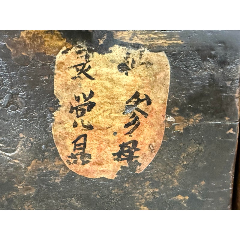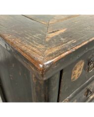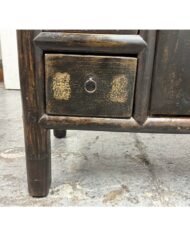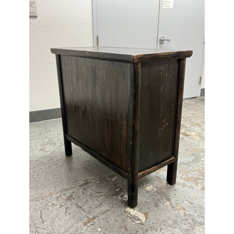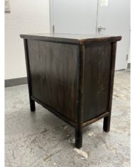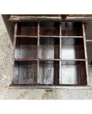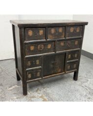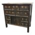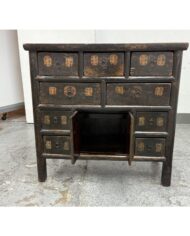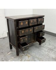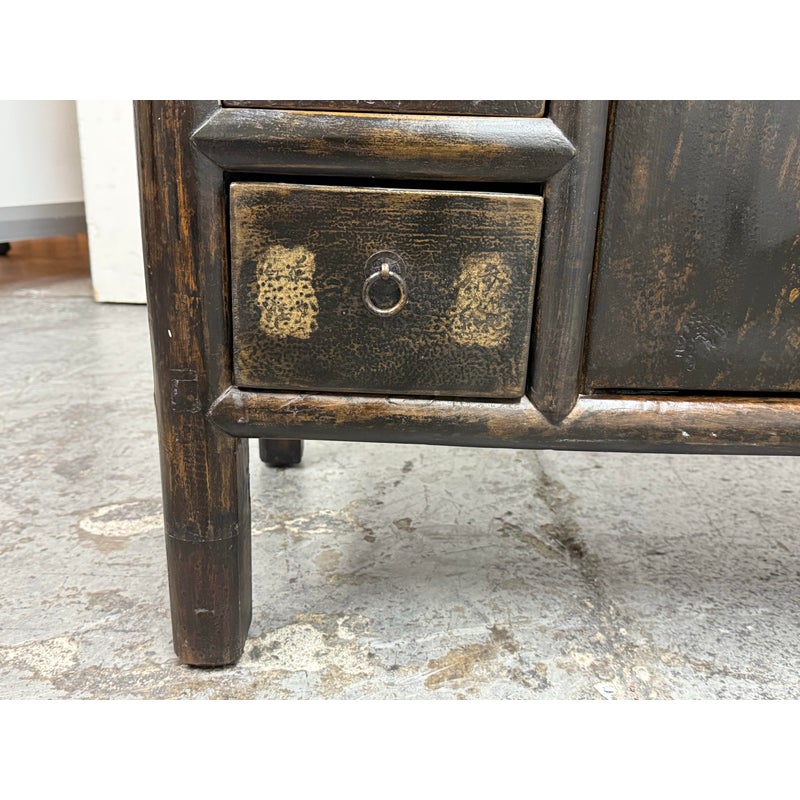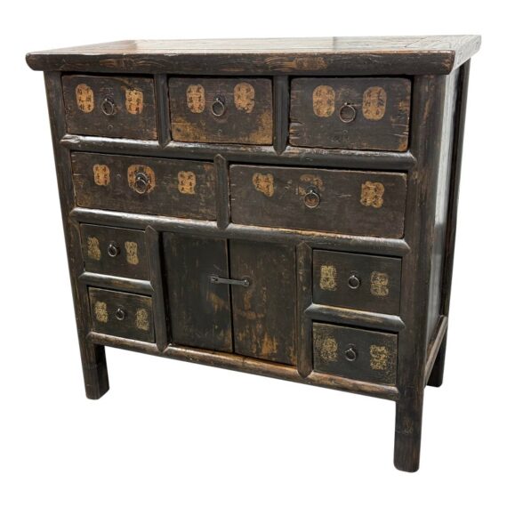 Design Plus Gallery presents an Antique Asian Cabinet from Mongolia. This free standing cabinet is composed of a dark stain rose wood with multiple drawers and even cupboard doors near its base. The top five drawers all have internal dividers; upper three have four cubbies each and the lower two drawers have nine cubby boxes each. There are two lower drawers on each side of the cabinet doors which open to reveal an open cavity. The drawers also have hand written Chinese characters beside each pull tab, its original hardware. Overall the antique piece shows signs of wear that is consistent its age + use.