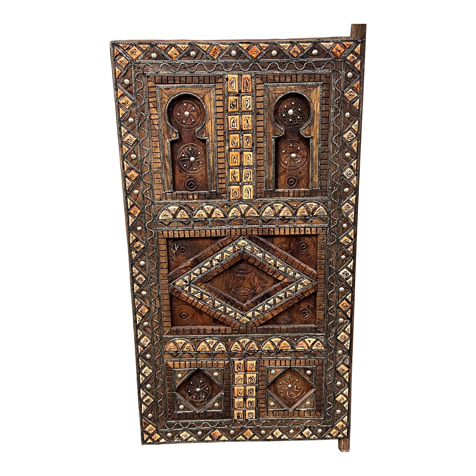 Design Plus Gallery presents an Antique Moroccan Door from the Sahara Region of Morocco. The amount of precision and detail put into this is immense. The wooden door originated from the Middle Atlas and the Rif mountain ranges. All the details are carved and show the richness of Moroccan culture. Moroccans say a beautiful house is known by its beautiful door. A real ancient treasure. This magnificent Moroccan Antique Berber door is made by Berber peasants in solid wood available from the forests of the Grand Atlas Mountains are a mountain range in the Maghreb in North Africa. It separates the Sahara Desert from the Mediterranean Sea and the Atlantic Ocean. Rich history and cultural significance. In good condition.