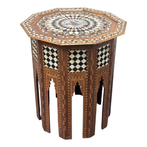 Design Plus Gallery presents an Octagonal Side Table with Mother of Pearl Inlay. It is antique Middle Eastern, Moroccan or Moorish Arabesque style octagonal side table. The beautiful table has patterns with alternating inlaid woods and mother-of-pearl in geometric patterns in every direction. Detailed and edged in camel bone. Wonderful craftmanship. Surface wear is minimal and is in good condition.