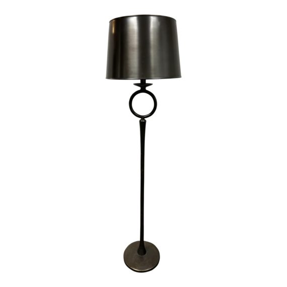 Design Plus Gallery presents an Antiqued Nickel Finish Patina Floor Lamp. This sophisticated floor lamp in with a patina antiqued finish stretches its foot from a large disk-shaped base echoing the ring that adorns the top of his foot. Its wide matching pewter toned lampshade balances the floor lamp by enhancing its antiqued elements. The elegant design of this floor lamp associated with the nobility of monochrome, gives it an exceptional aesthetic. Patina and wear but overall good condition.