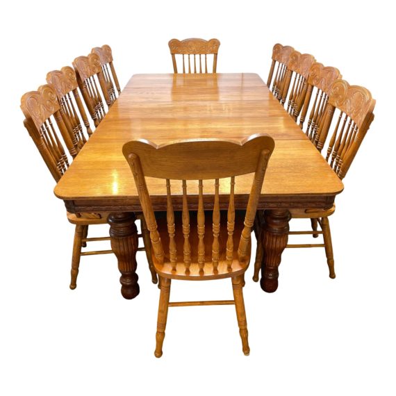 Design Plus Gallery presents an Antique Oak Dining Set, c.1900. A lovely wide-plank table with rounded corners and robust turned legs, that expands with three 17.5″ leaves for dining space to include all. A set of Ten pressed back chairs, with an elegant scroll pattern, completes the set, though not original.