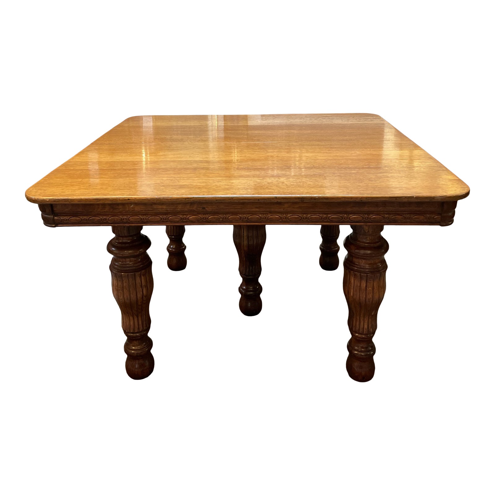 Design Plus Gallery presents an Antique Oak Dining Table, circa .1900. A lovely wide-plank table with rounded corners and robust turned legs, that expands with three 17.5″ leaves for dining space to include all.