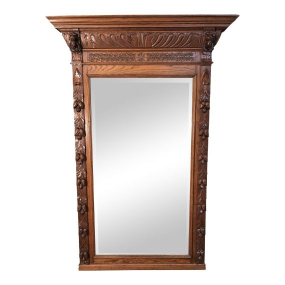 Antique wall mirror. This gorgeous mirror has been elaborately carved. It starts at the top with a beautiful crown which is flanked by two Lion heads with Brass rings in their mouths, followed by acorn garlands running the length of of the frame. It is quite stunning!