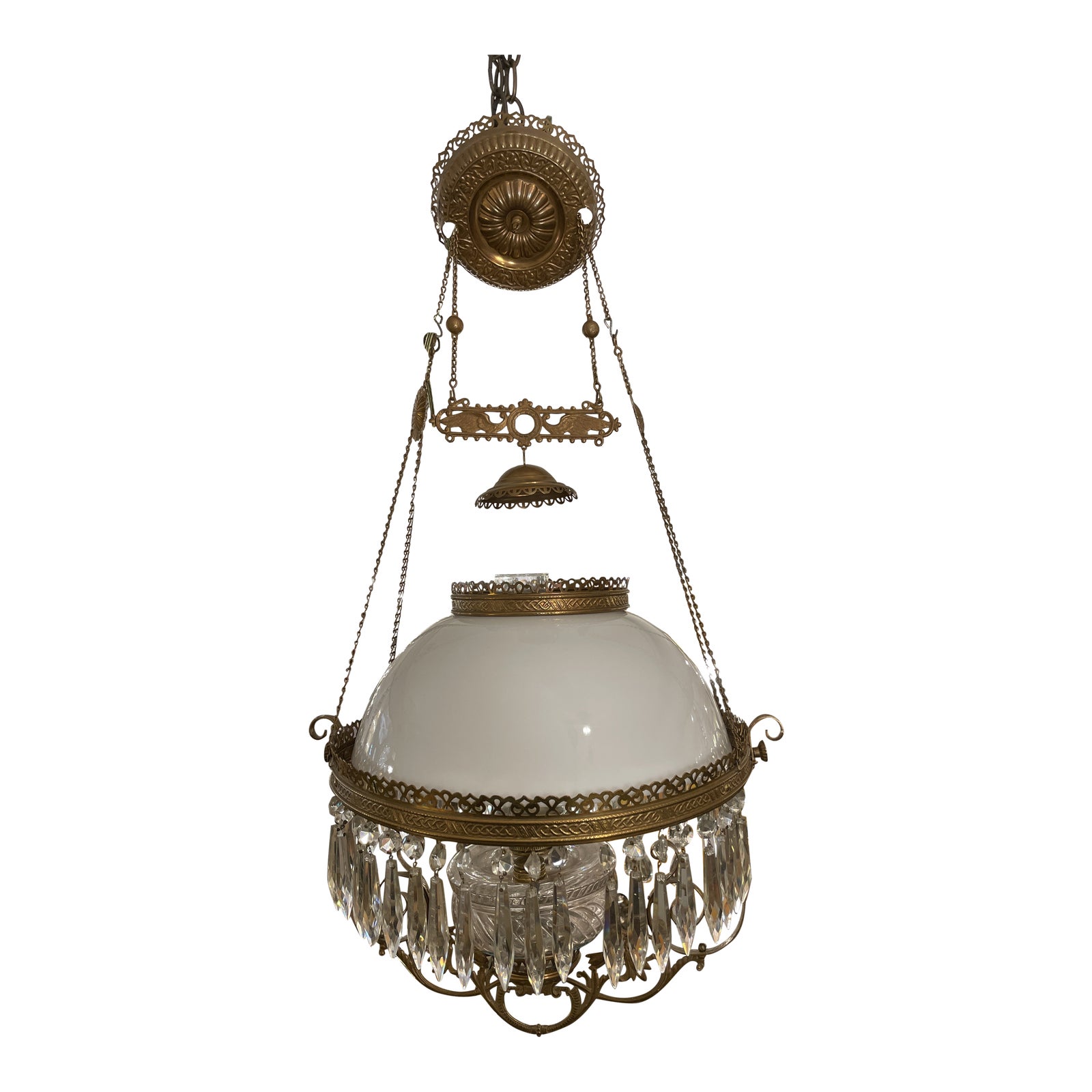 Design Plus Gallery presents an Antique Oil Lamp that was converted into a Crystal Chandelier. White glass dome is accented with brass fittings + intricate fretwork. Rim is adorned with cut crystals. Various fittings from the original oil lamp have been preserved. Visible wear through out, chandelier is in good condition.