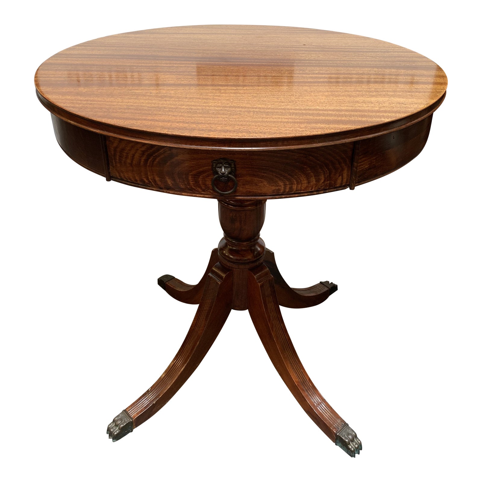 Design Plus Gallery presents a lovely classic center or side table. The turned pedestal and brass clawed feet are just a few of the traditional details. The shallow storage door is embellished with antiqued metal lion pull.