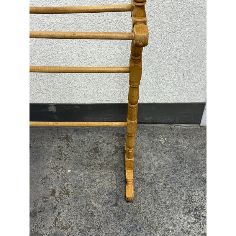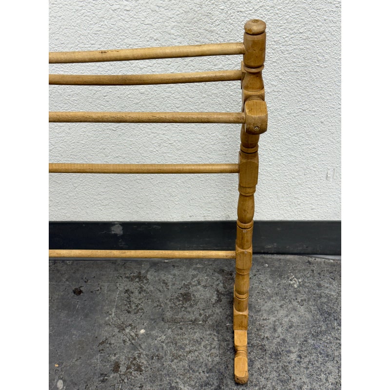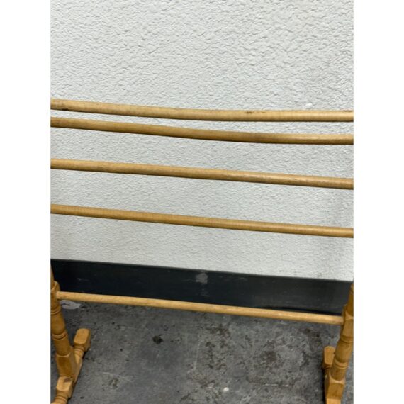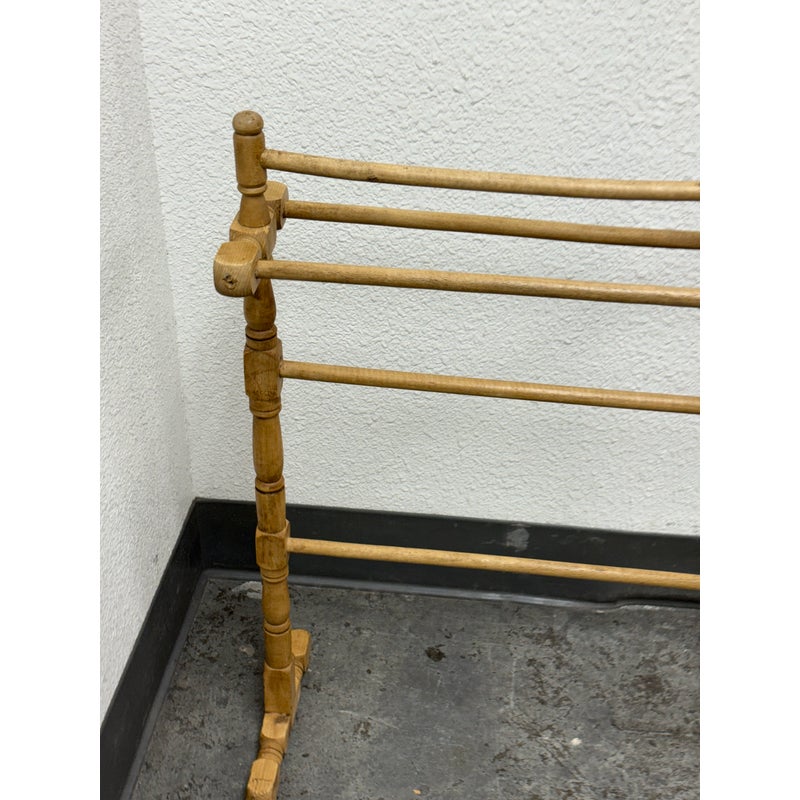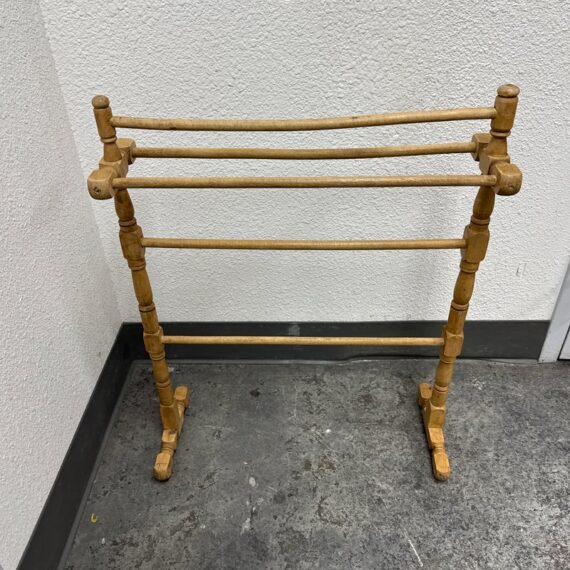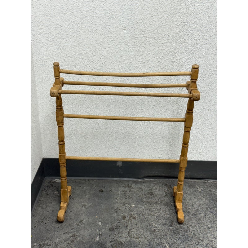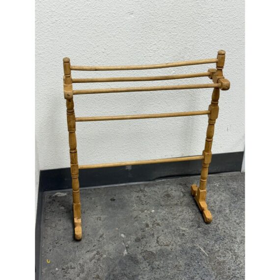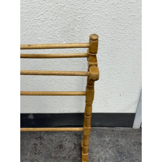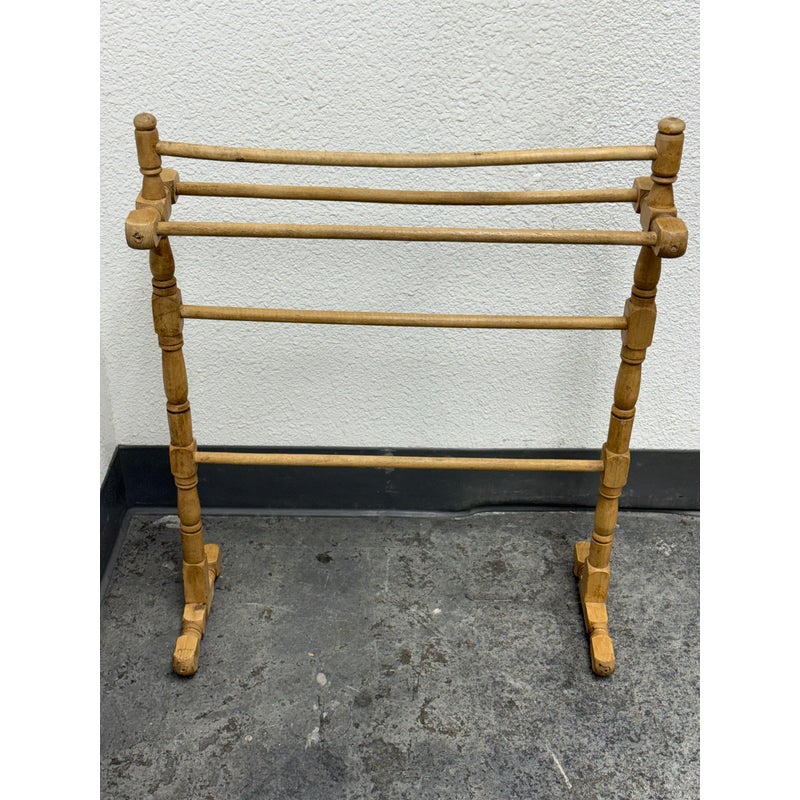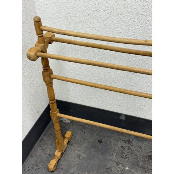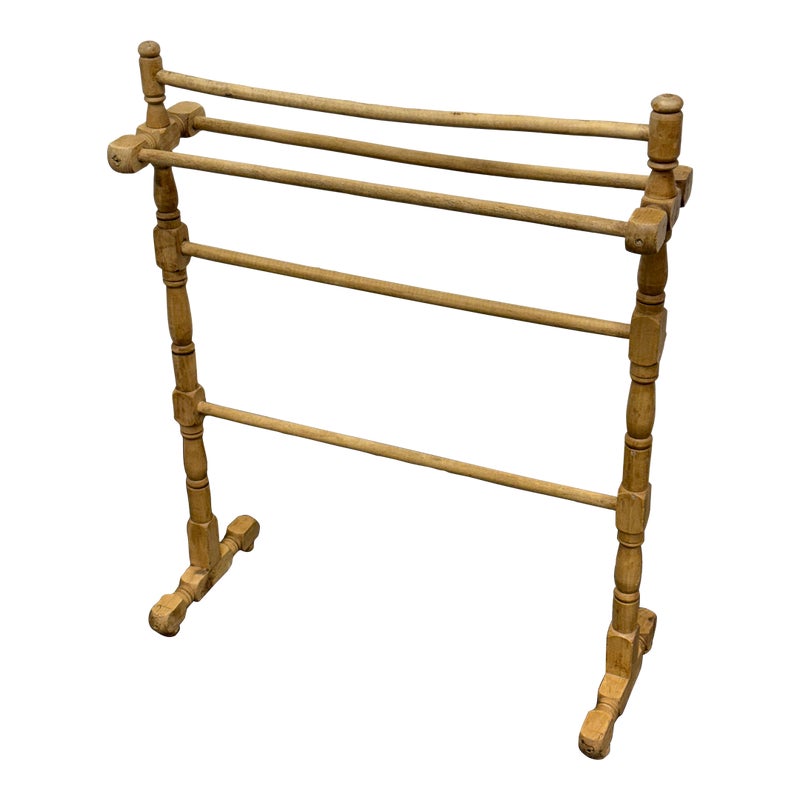 Design Plus Gallery presents an Antique Towel Rack. A charming and functional piece that captures the essence of rustic elegance and practicality. Crafted from durable pine wood, known for its warm and inviting hues. The design features a unique combination of a towel-horse or clothes stand, embodied in a structured form with five spaced rails. These rails provide ample space and convenient access for hanging tools, towels, clothes, or other items, making it highly versatile for various uses around the home or workshop. It is raised on sturdy square and finely turned supports. These supports exhibit a wonderful blend of straight, clean lines and elegantly curved details, a testament to the skilled craftsmanship of the era. The aged patina of the pine wood adds to its antique charm, with subtle variations in tone and texture that tell a story of years gone by. This piece would seamlessly fit into any country-style or vintage-inspired interior, providing both functionality and a touch of history. Overall, is more than just a storage solution; it is a beautiful piece of history that adds character and warmth to any space it inhabits. In good condition, visible and minimal wear from usage.