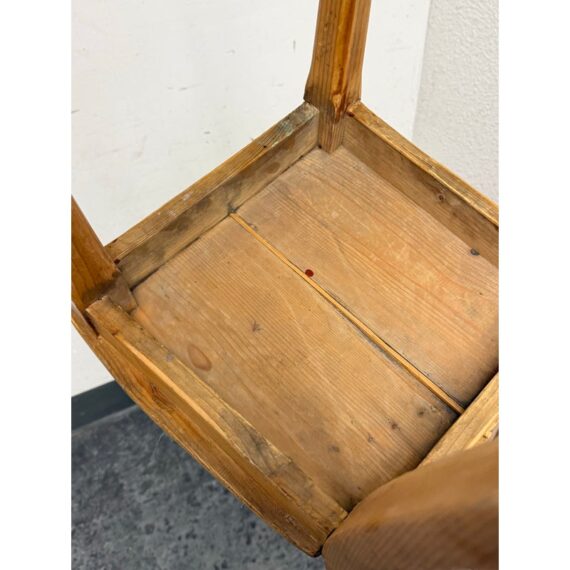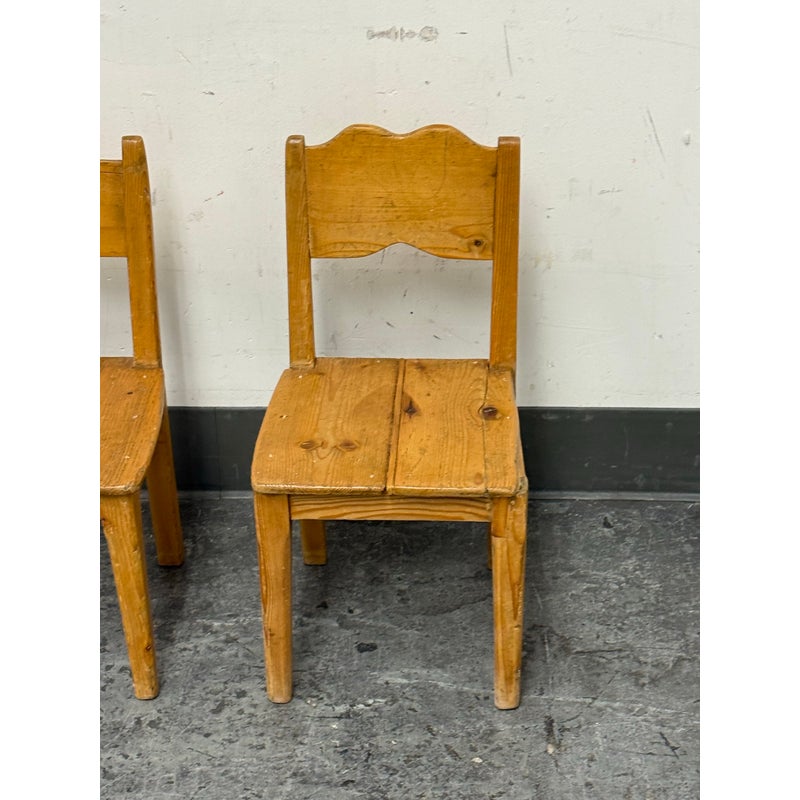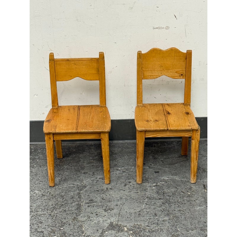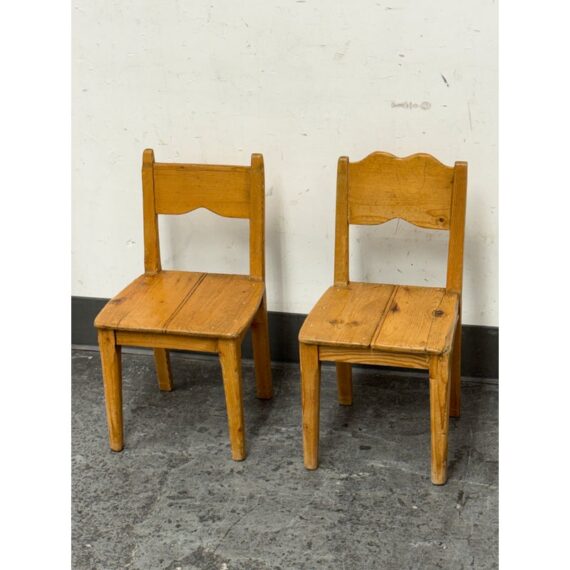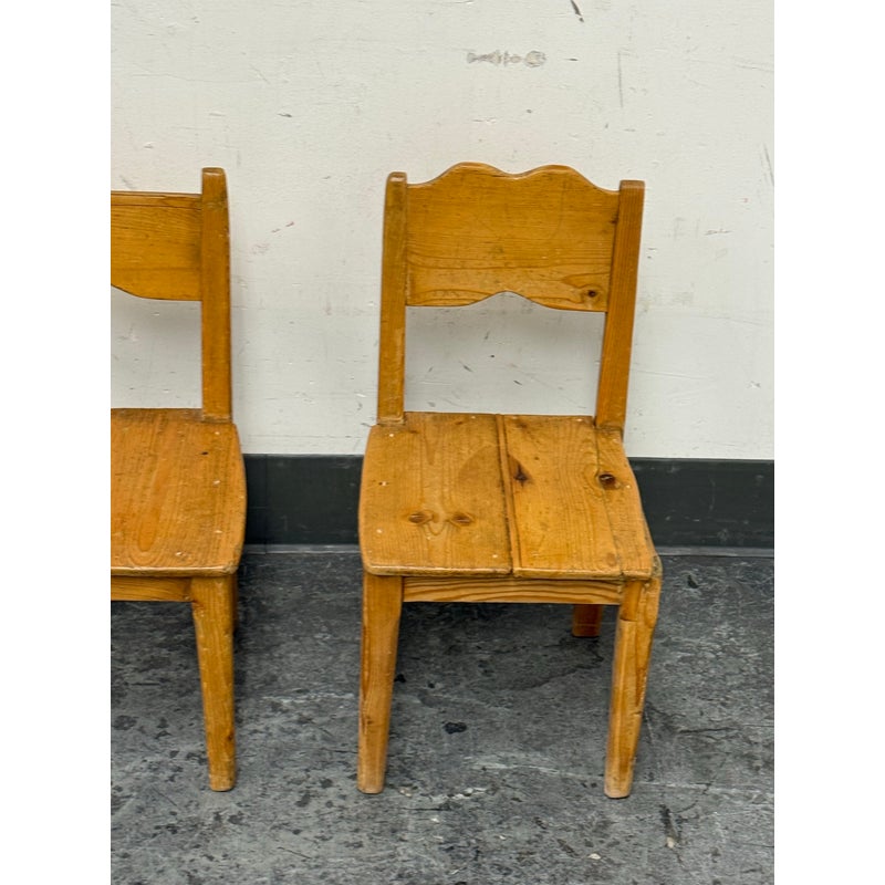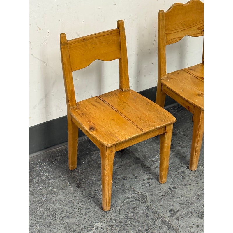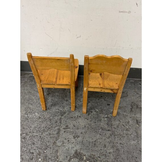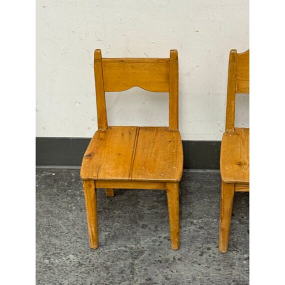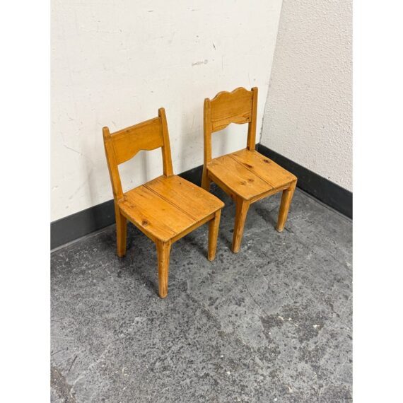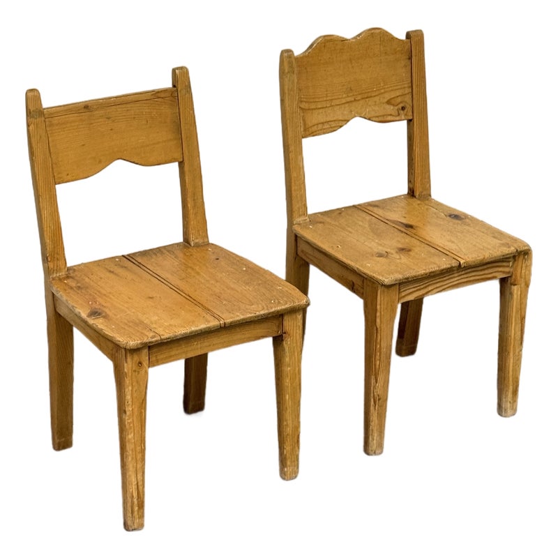 Design Plus Gallery presents a Pair of Pine Wood Children’s Chairs that are Likely Antiques. The cute little chairs are made from wood solids with details that make them appear to be masculine and feminine with their back seat design slightly different than each other. The pair of chairs will be a great, small addition to your dining room area for the holidays or just around the house as useful footstools, with a twist. Overall they are in good condition with visible wear that is consistent with their age + use.