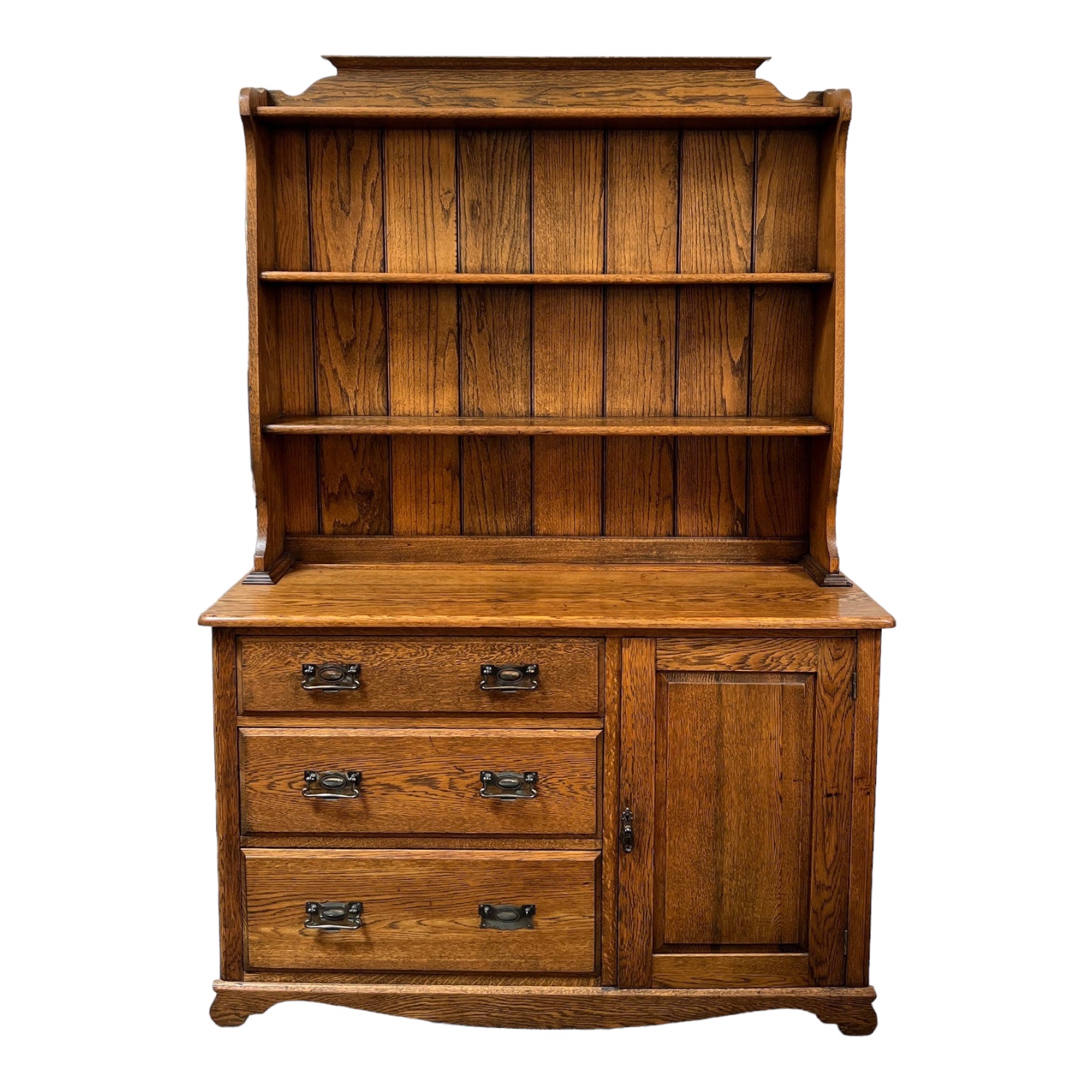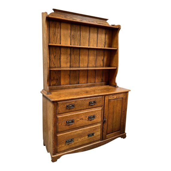 Design Plus Gallery presents a Primitive Oak Hutch. This lovely antique Two piece features all the traditional details, but understated. The upper unit has subtle curving crown that tops three shallow shelves with plate slots, for display. Below, three deep drawers and locking cubby with removable shelf provides storage. Two pieces are attached for stability, but could be separated for transport. Antique brass hardware. Light surface wear, overall good condition.