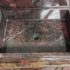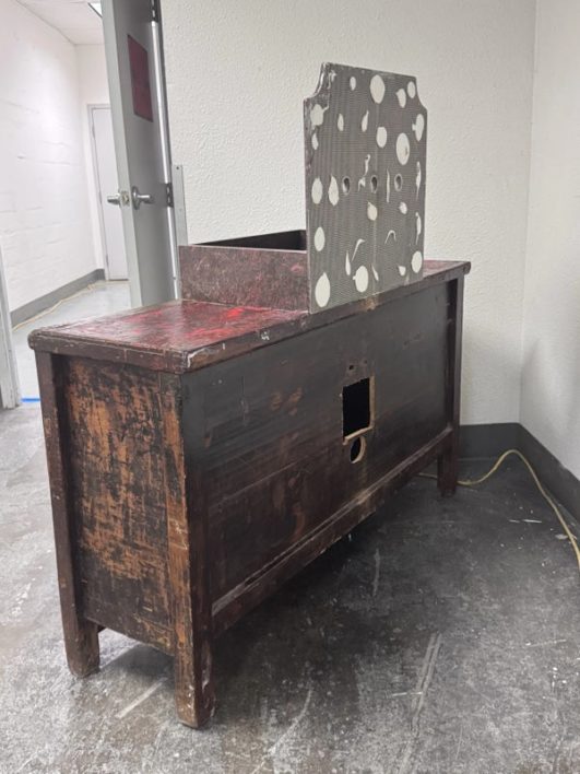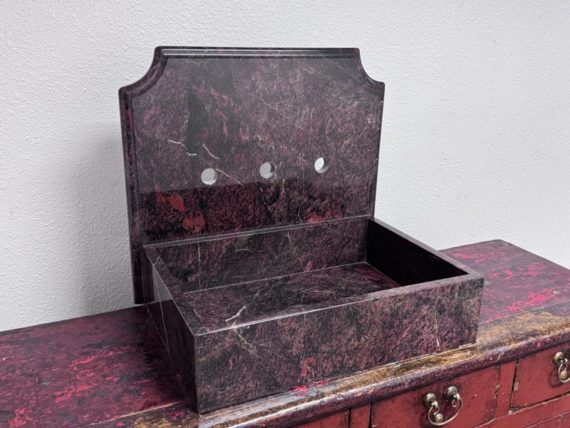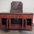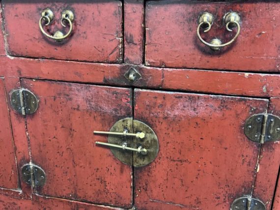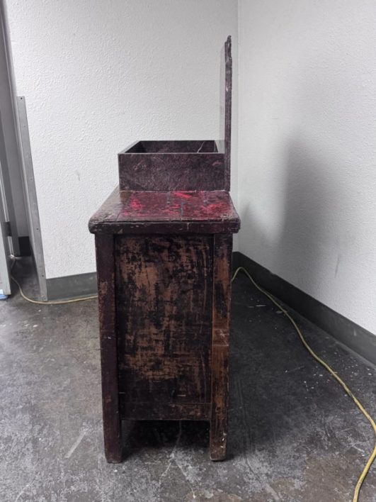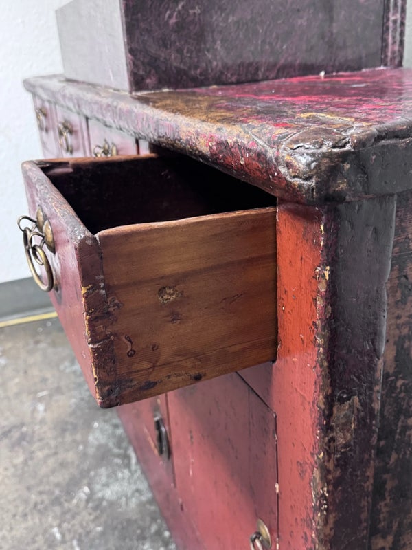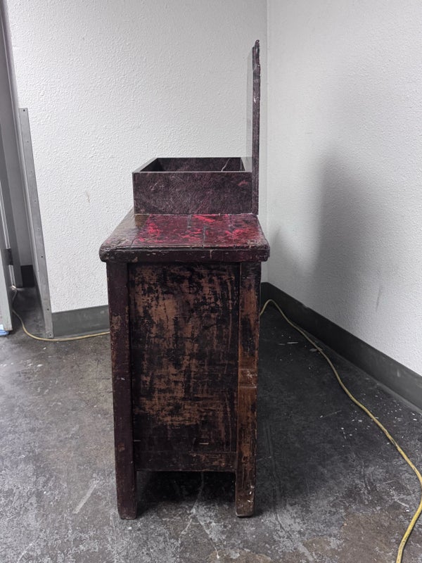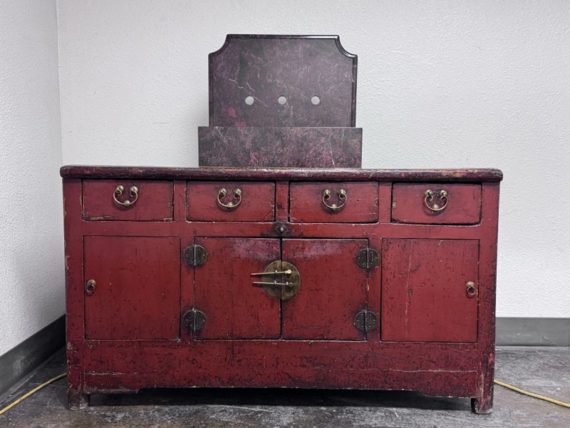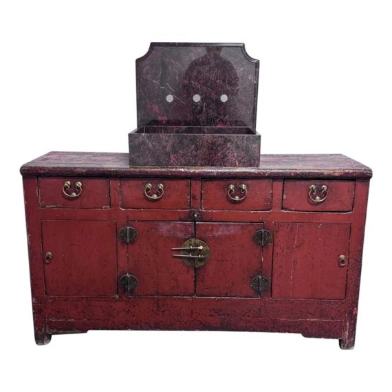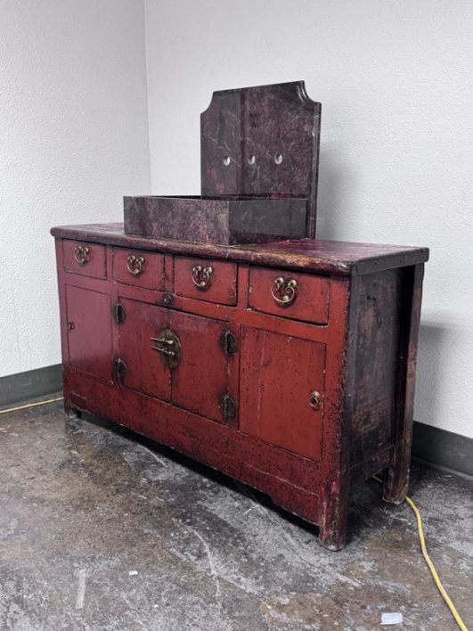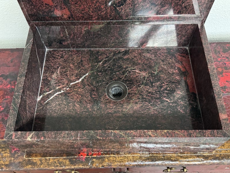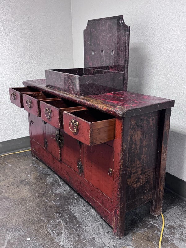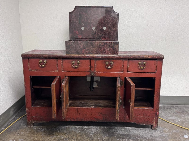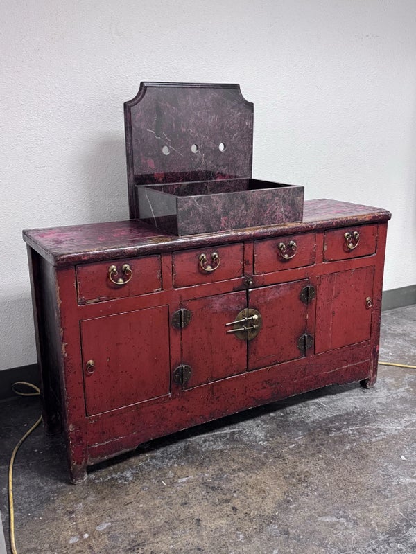 Design Plus Gallery presents a Modified Side/Washboard of Antique Age. The cabinet was crafted in the mid 19th century; offers four top equal sized drawers, a middle pair of door that lock with pin to open to open cavity, and two separate side doors on either side with an inner shelf each. All hardware is original and brass. The top has been fitted with a deep red + black marble sink. The back of the sideboard has been cut to create space for water hook up, allowing for a functioning sink of antique age in your home. Is in good condition with noticeable wear that is consistent with its antique age + use.