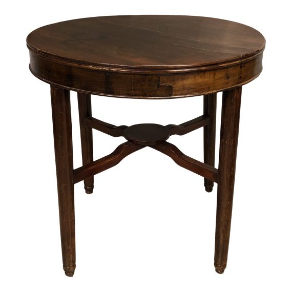 Design Plus Gallery presents an antique round occasional table. Constructed of solid woods crafted by skilled craftsman. Four tapered legs with a cross base joinery. Visible aging and natural distressing.