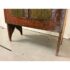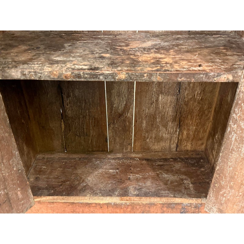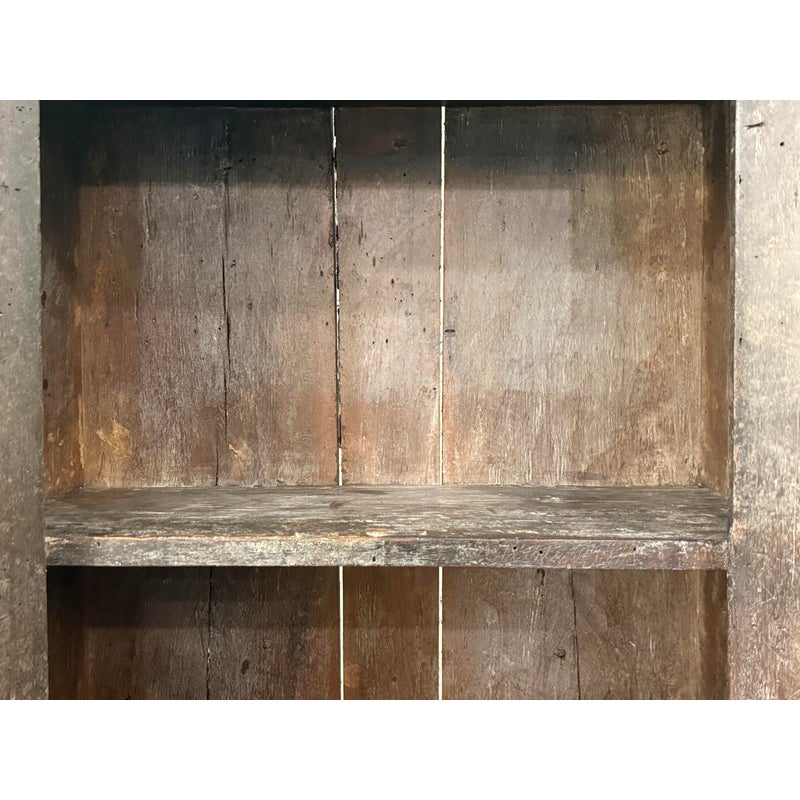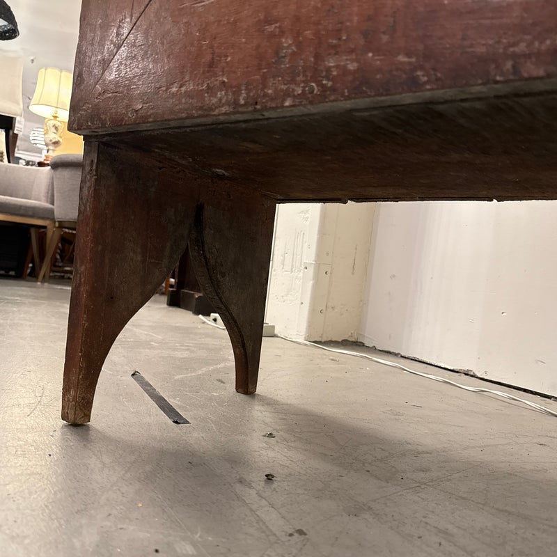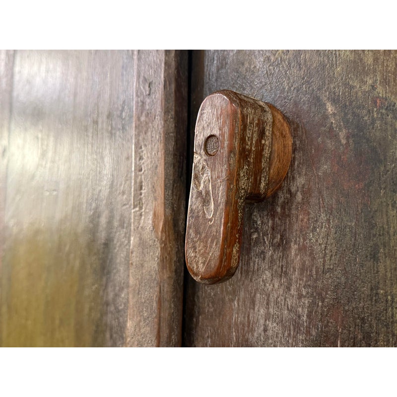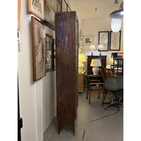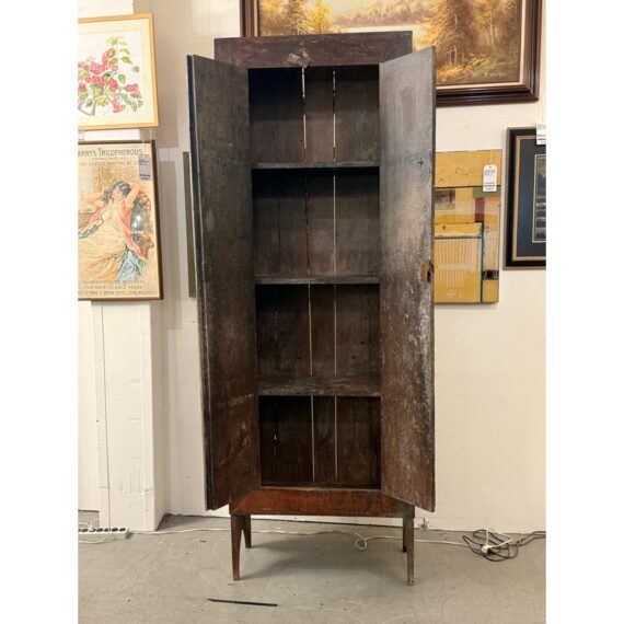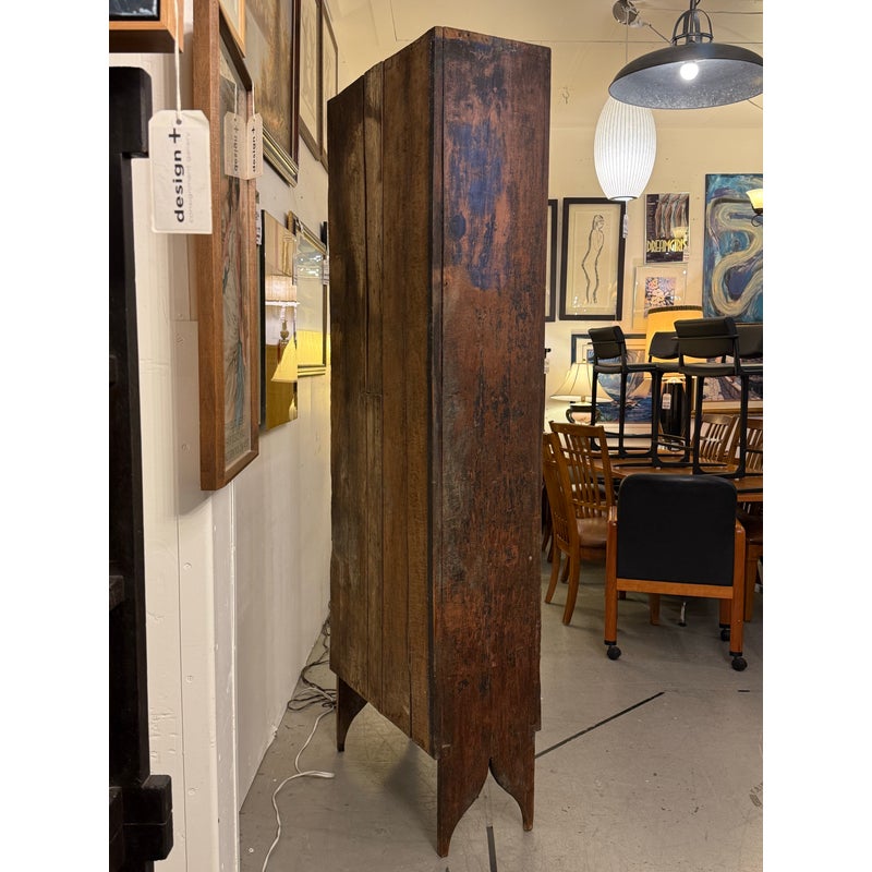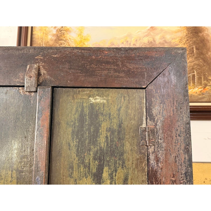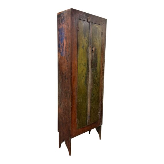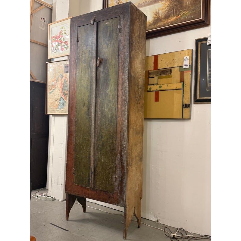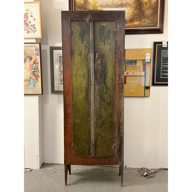 Design Plus Gallery presents an Antique Cupboard with Rustic Charm. This tall cupboard is aged with a weathered appearance and of solid wood. The piece has a two tone finish of green on the doors and an auburn tone to the outer frame. The legs are arched in their center and taper down for an even more interesting, charming look. Per its age and style the cupboard is in fair condition.