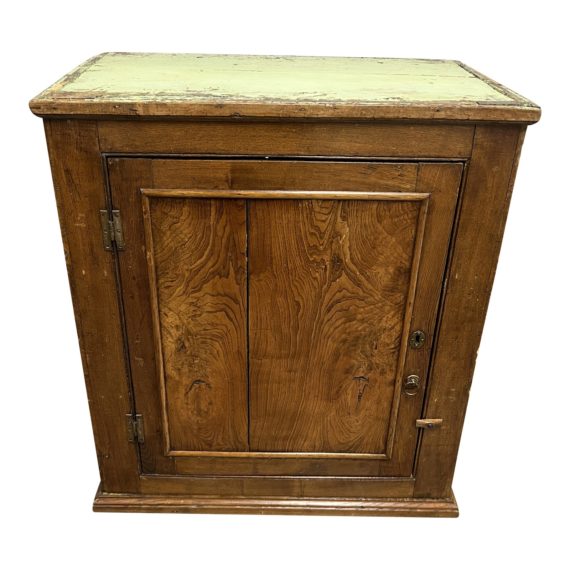 Design Plus Gallery presents an Antique Wood “Milk Chest”. Crafted from solid woods. Visible and natural distress from age. The backing and top surface has visible aged paint. One single cabinet with two inner shelves. Visible wear and cracking from age. Does not come with original key.