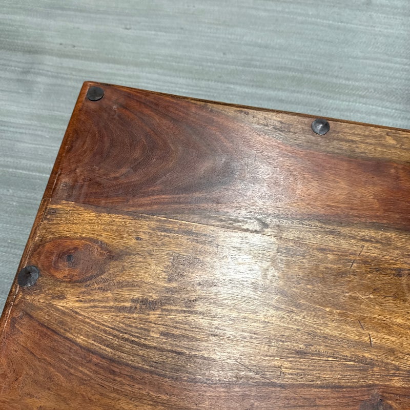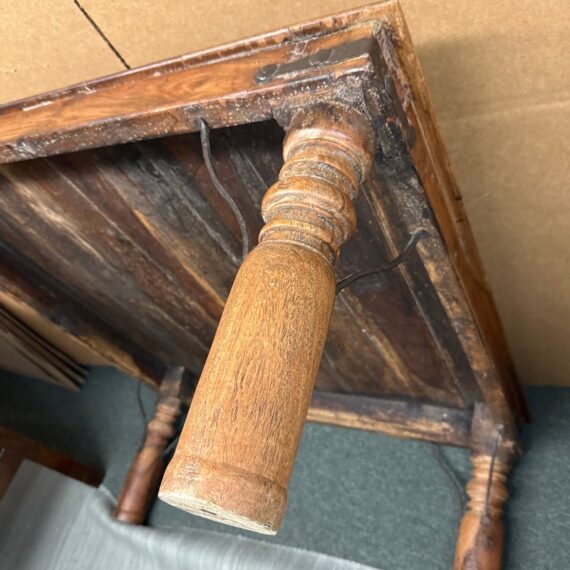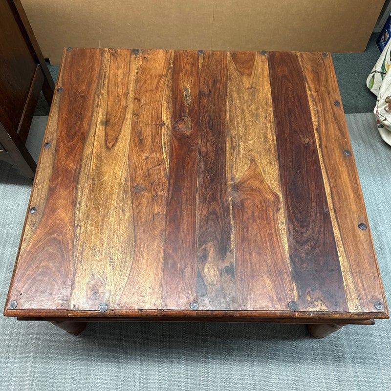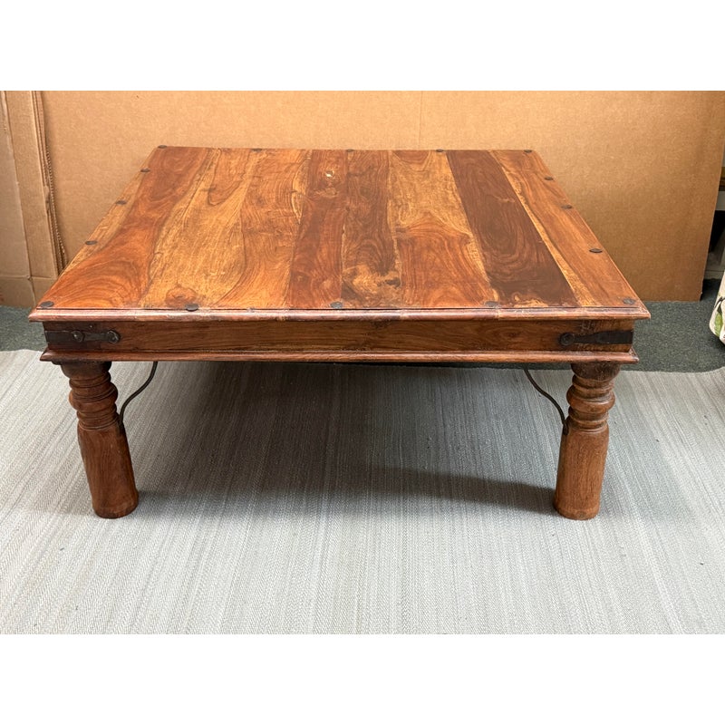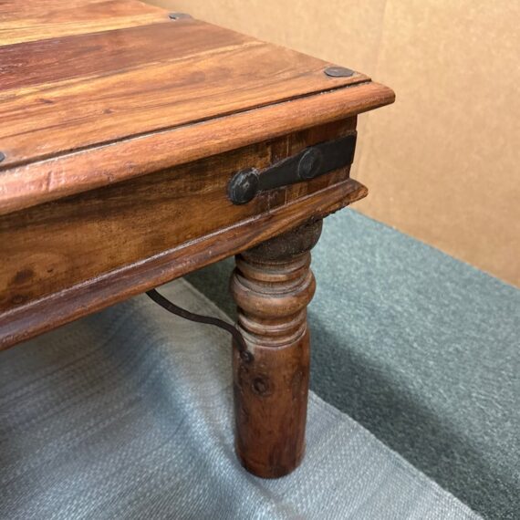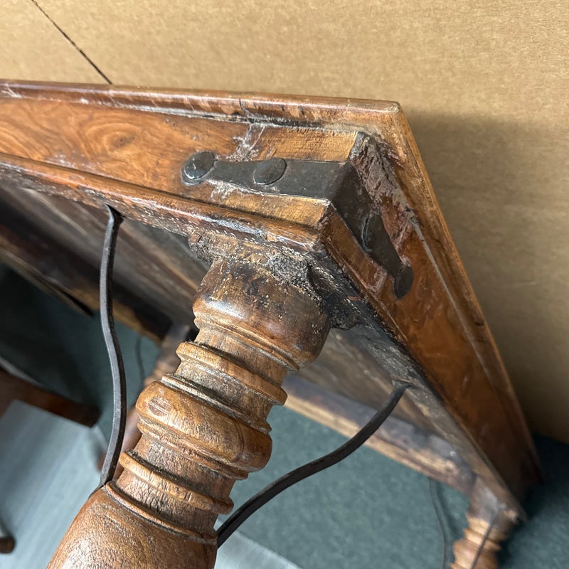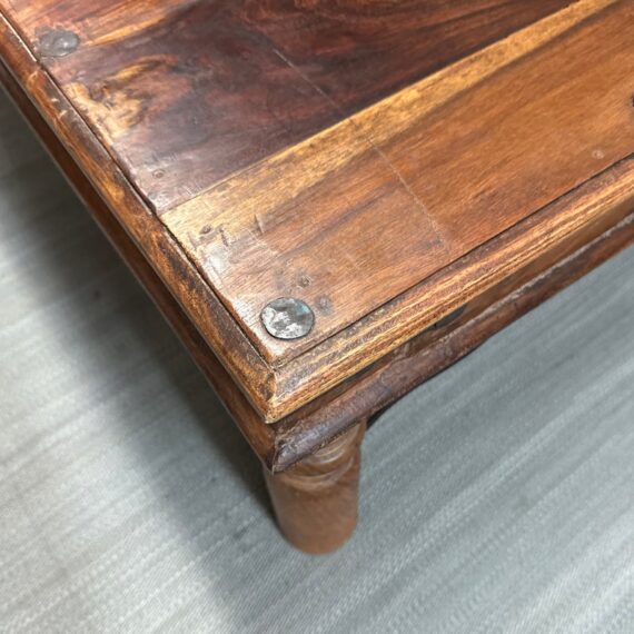 Design Plus Gallery presents a Spaniel Revival Coffee Table from the Early 20th Century. The table has definitive proportions that are low and stocky. The legs are rounded with carved turns in their thick circumference. The table top has thick planks in the surface that are fastened with iron nails and supports. A cool, rustic find that maintains its age well. Naturally occurring patina is present but overall is in good structural condition for its antique age.