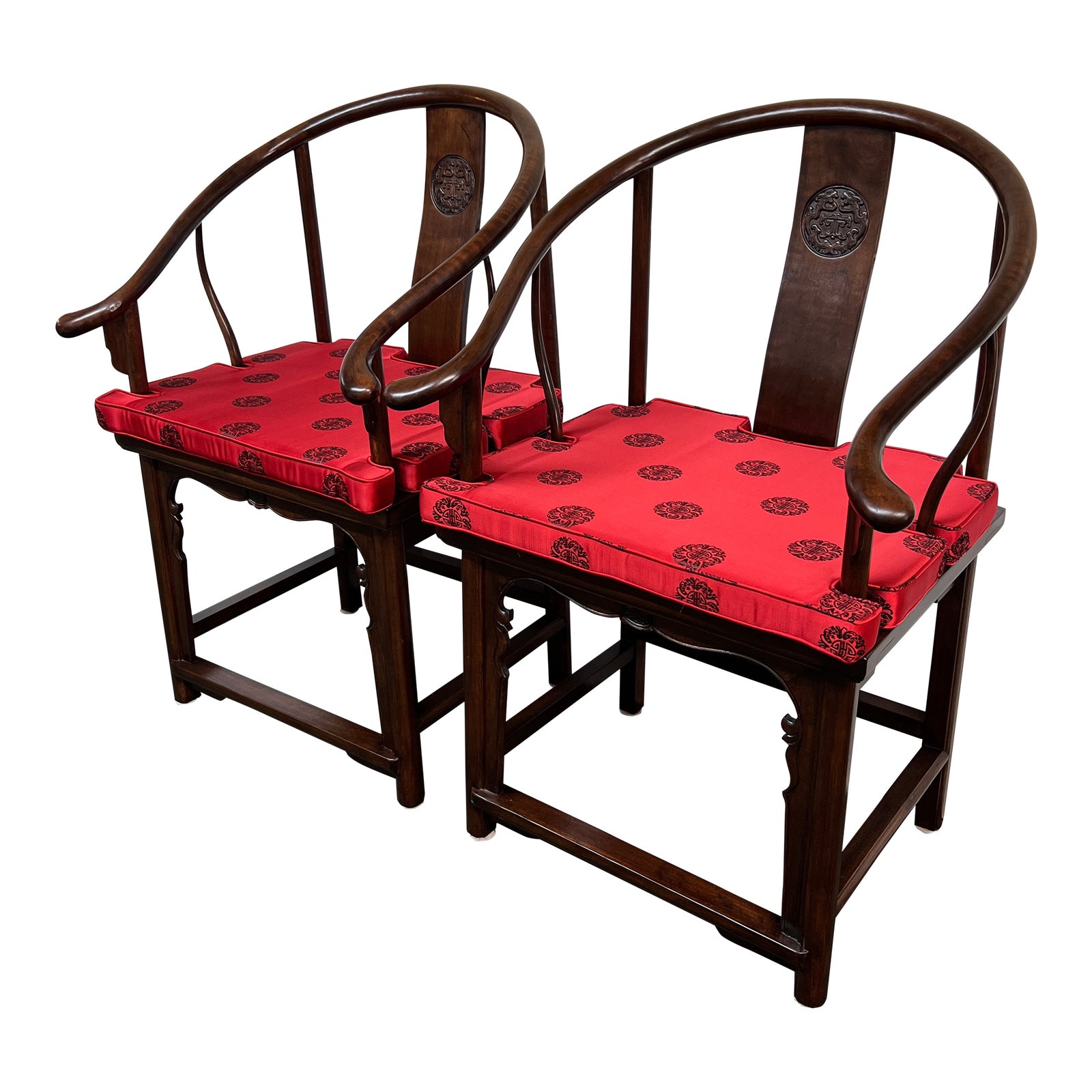 Design Plus Gallery presents a Pair of Antique Style Chinese Monk Chairs. Handcrafted in Shanghai using old world techniques, the chairs are made with dovetailed joints and without nails. The solid elm set are have carved symbols, simple Ming feet and the Ox Horn silhouette. Custom silk cushions provide comfort and drama. Light surface wear on arms (table bumps); set is in good condition.