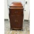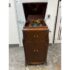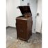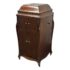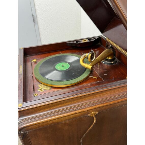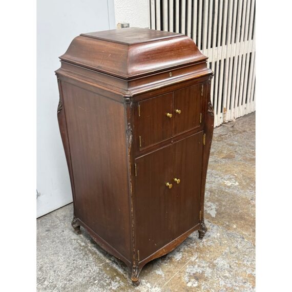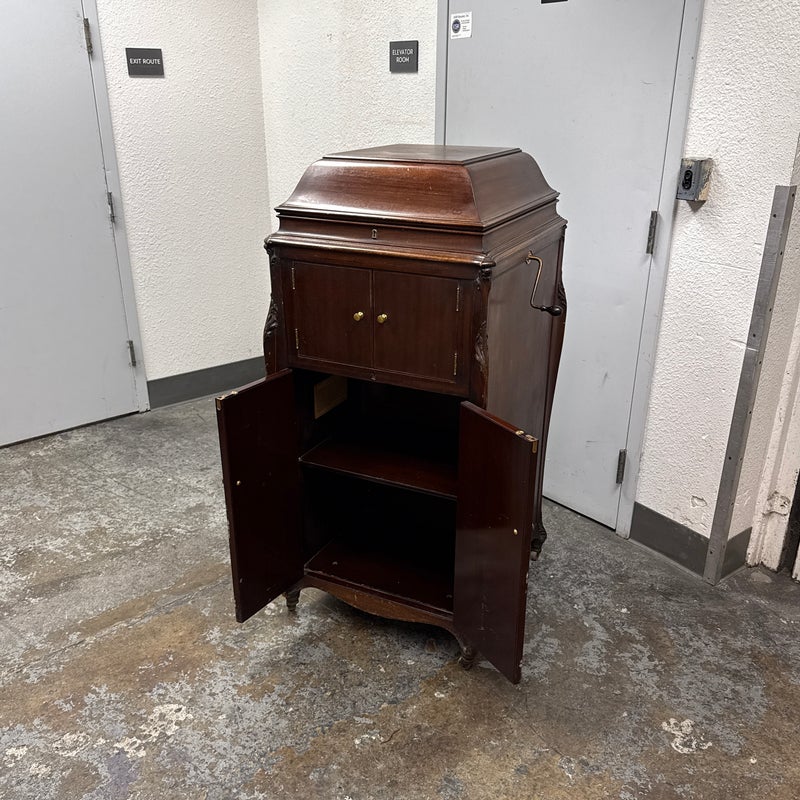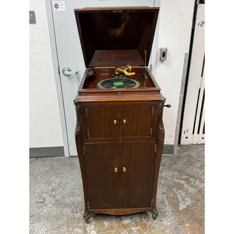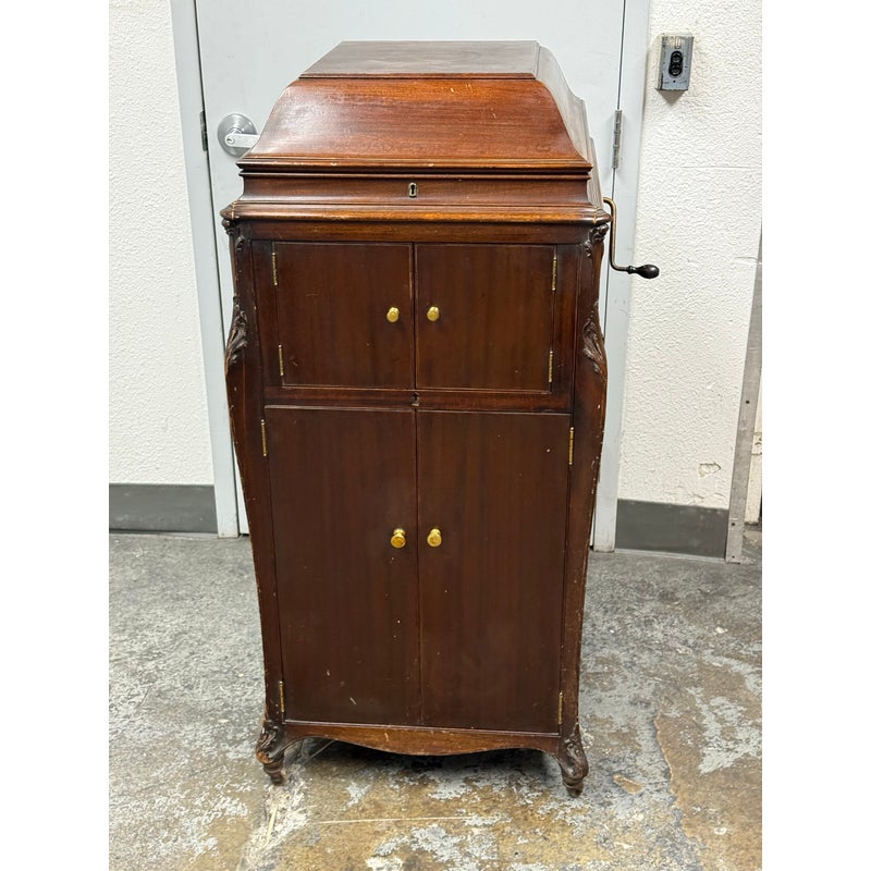 Design Plus Gallery presents a Mahogany Phonograph from Victor Victrola. This floor-standing cabinet is made in mahogany with a molded, hinged lid that opens to reveal the turntable deck and tonearm assembly. The interior shows a green felt platter, a brass tonearm with reproducer head, and the original Victrola marking inside the lid. A hand-crank winder is mounted on the side, and the case is detailed with curved side panels, carved corner accents, and cabriole legs. The front cabinet offers two upper doors with round brass pulls and two lower doors with matching hardware, with multiple hinges and a shaped apron at the base. Brass trim and small hardware details add period character, and the top retains a classic stepped profile with a centered keyhole at the front edge. It is in good condition with visible distress on finish and minimal wear from usage.