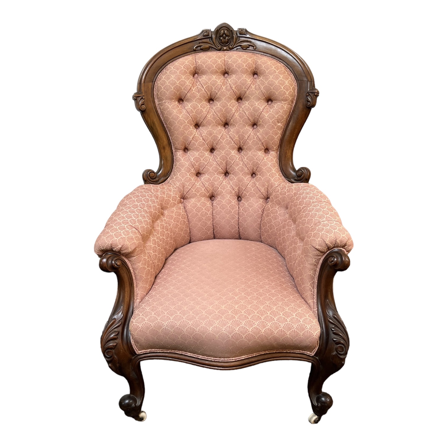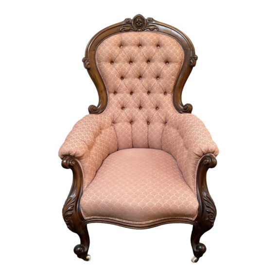 Design Plus Gallery presents an Antique Eastland Balloon Back Parlor Carved Walnut Armchair. The parlor chair has a soft rose colored fabric with fan embroidery that is tufted in the seat and back rest, and smoothly wrapped along the back side. It perfectly hugs the carved wooden frame and even the arms partially. The two front legs are on casters making it easy to maneuver on your wood floors. This chair is a relic and is in good condition considering, just some minor wear on wood + underside of seat has been torn.