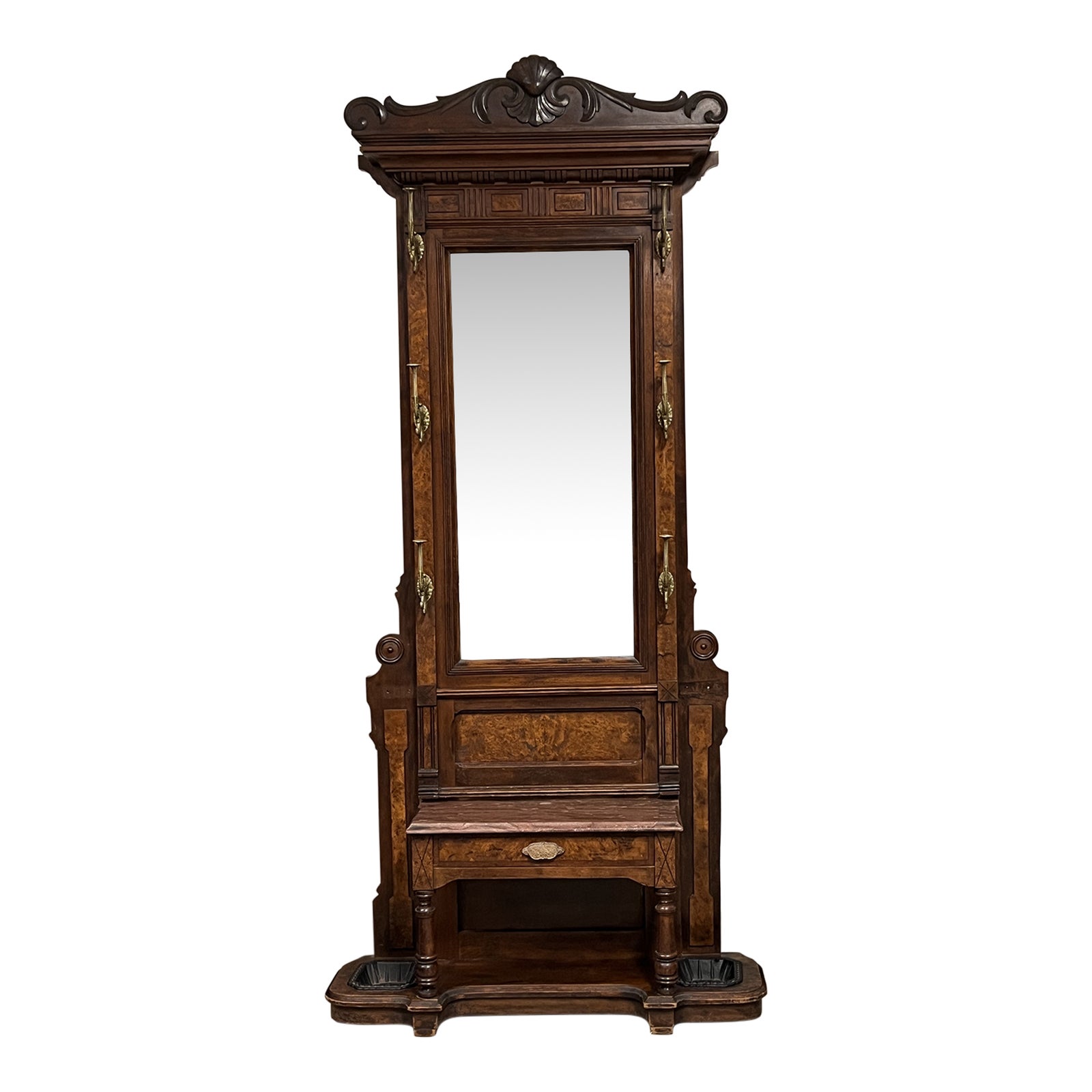 Antique Victorian Carved Walnut + Burl + Marble + Mirrored Renaissance Revival Hall Tree