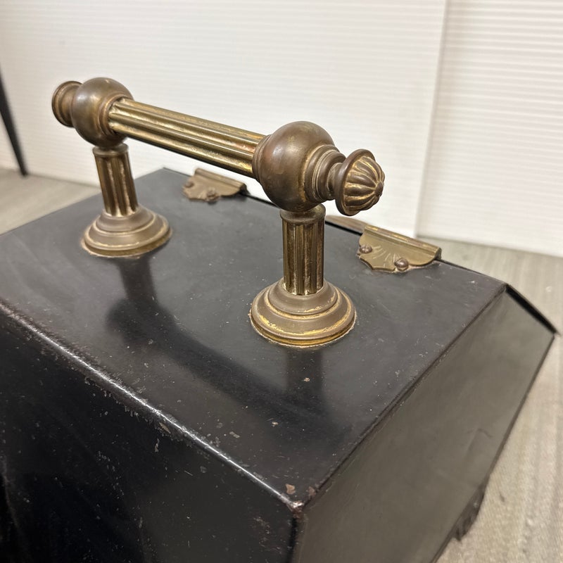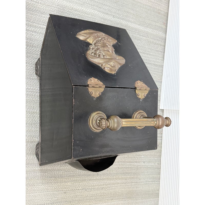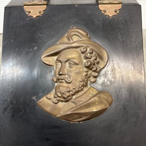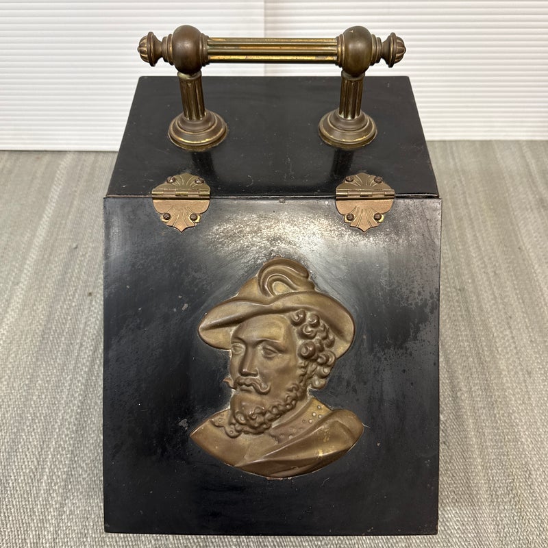 Design Plus Gallery presents a Victorian Coal Scuttle or Hod. Traditional styling in black Tole with brass plaque and handle. A medallion features Flemish Artist Peter Paul Rubens (Musketeer). An interior liner transports coal or kindling to the scuttle to keep the fuel at the ready. Beautiful and functional tool to warm you and yours by the hearth. Visible wear and condition that is consistent with age and use.
