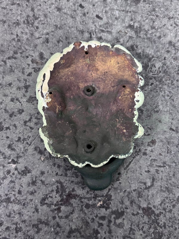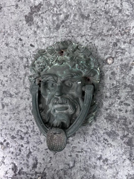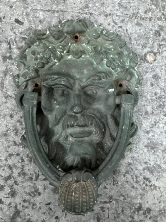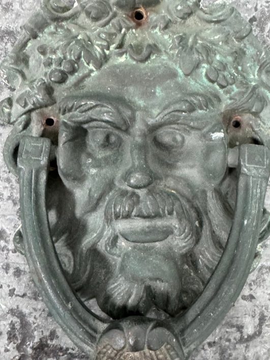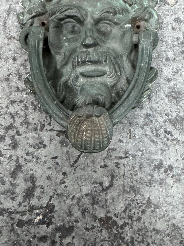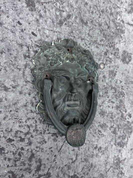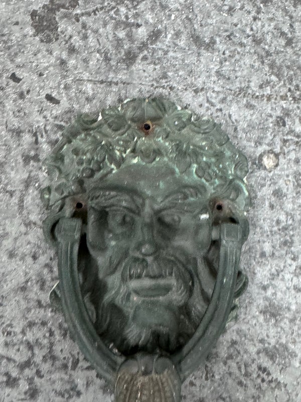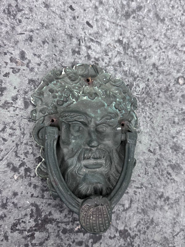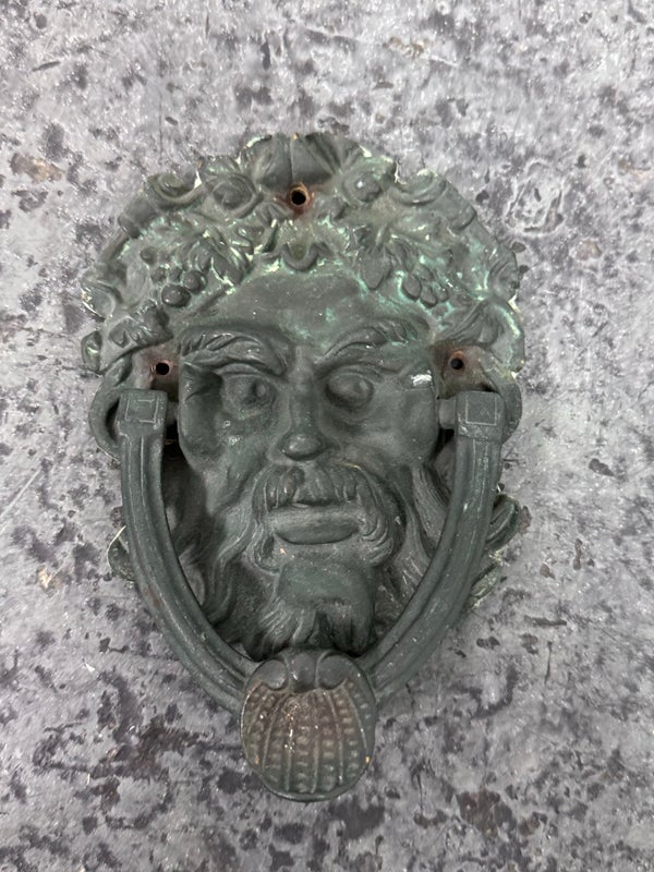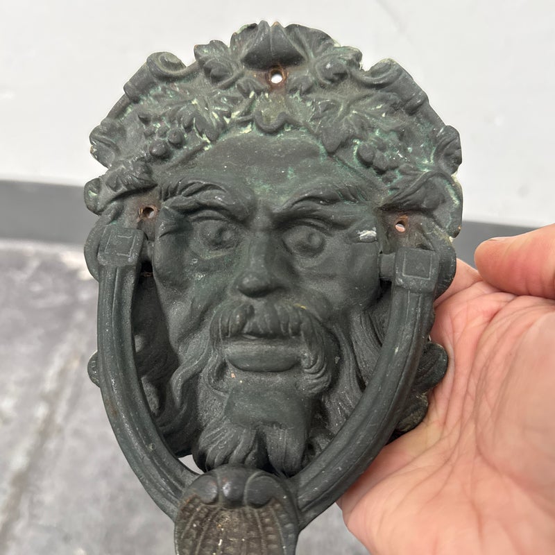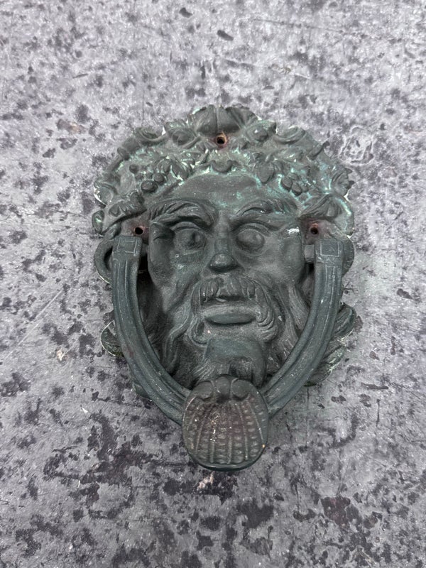 Design Plus Gallery presents an Aged Bronze Face of Bacchus Door Knocker of Antique Victorian Age. Exquisitely detailed in the Victorian gothic taws. A timeless architectural design that is reminiscent of a bygone era. Classic visage of the roman mythological diety Bacchus (God of fertility, agriculture and the theater). Does have patina from it age but still in good condition for its usage.