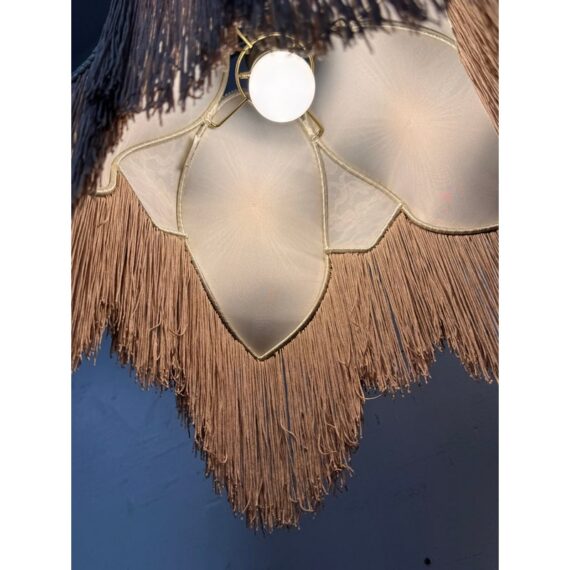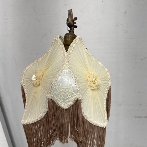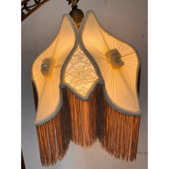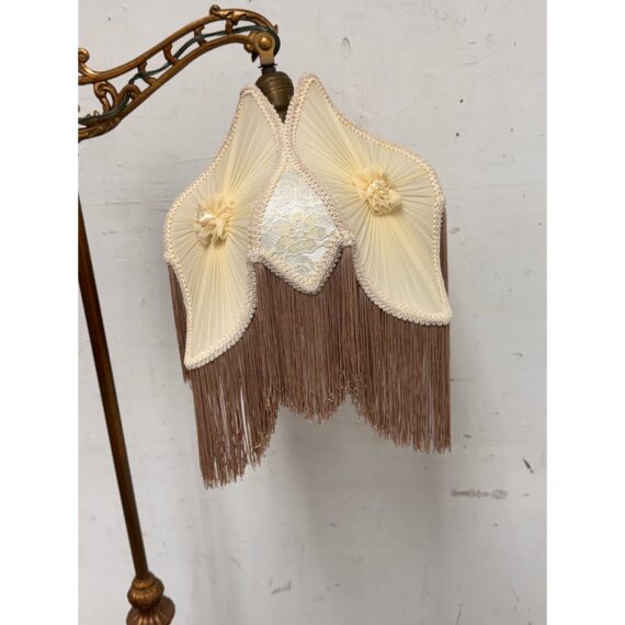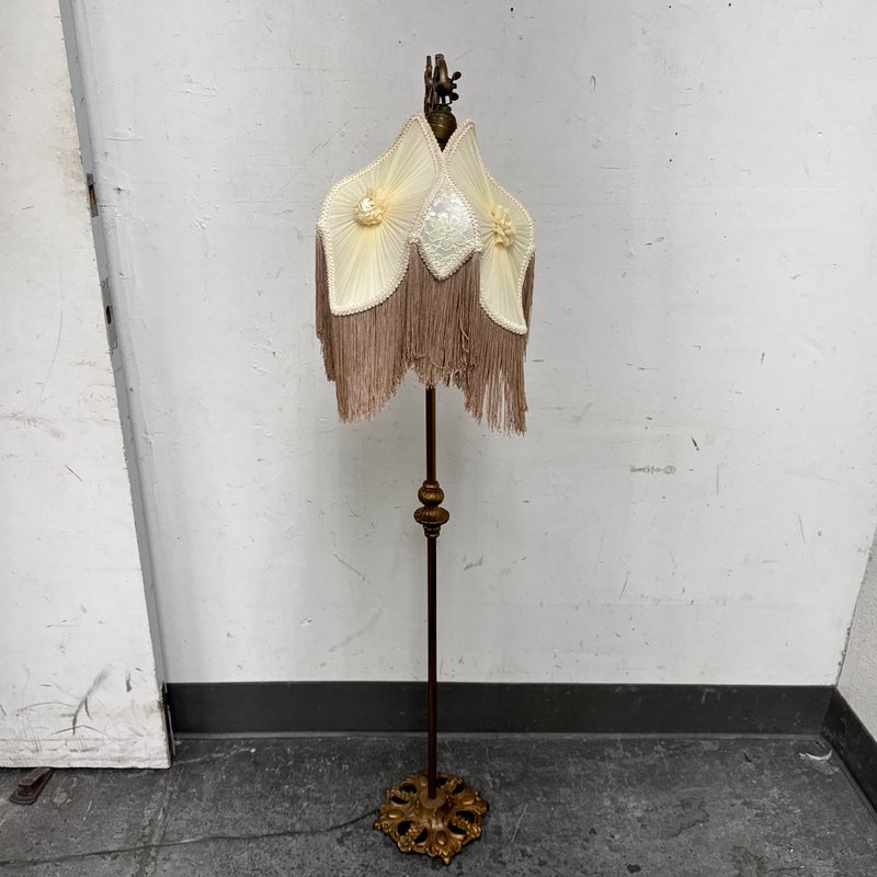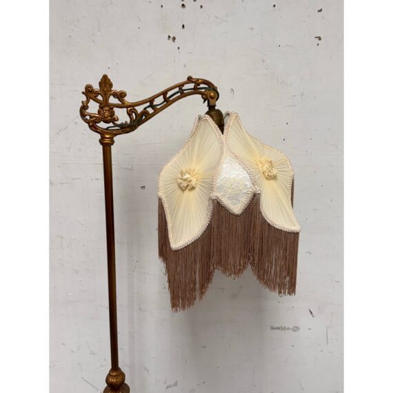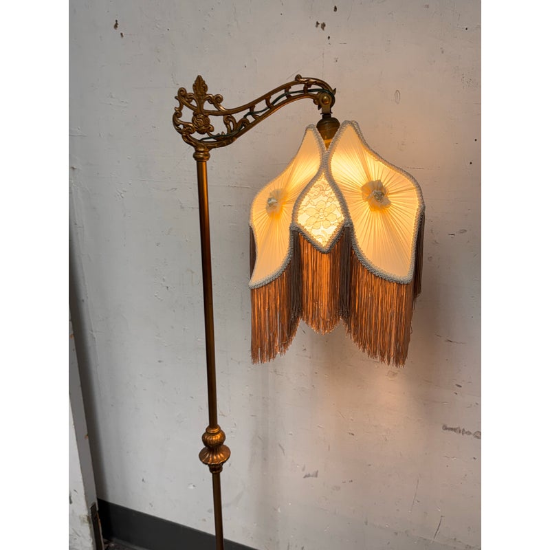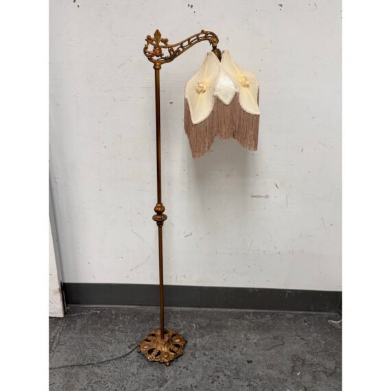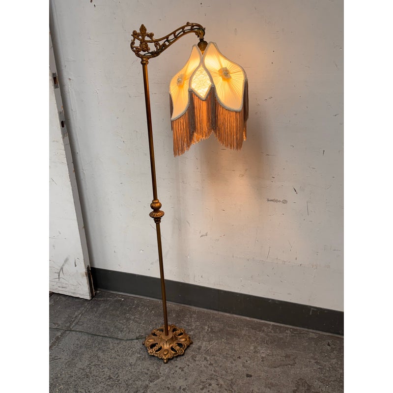 Design Plus Gallery presents a Victorian Floor Lamp of Antique Age. The sculptural lighting piece brings period character with decorative detail into any interior. It showcases a slender metal column rising from an ornate weighted base with scrolling motifs. The curved arm extends outward to support a pleated silk shade that is adorned with delicate trim, floral accents, and cascading fringe. When illuminated, the shade casts a soft ambient glow that will stop people in their tracks with its glamorous design. The overall silhouette reflects classic Victorian styling, blending ornamental metalwork with textile detailing for a distinctive presence. It is in good condition with visible and minimal wear from usage.