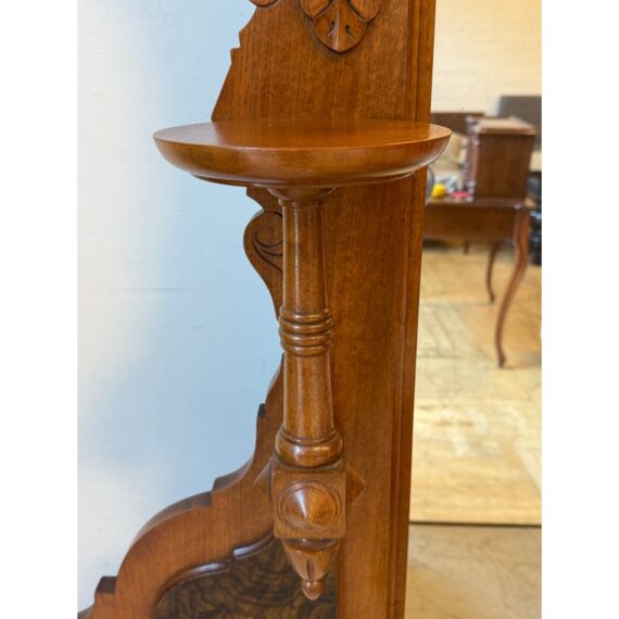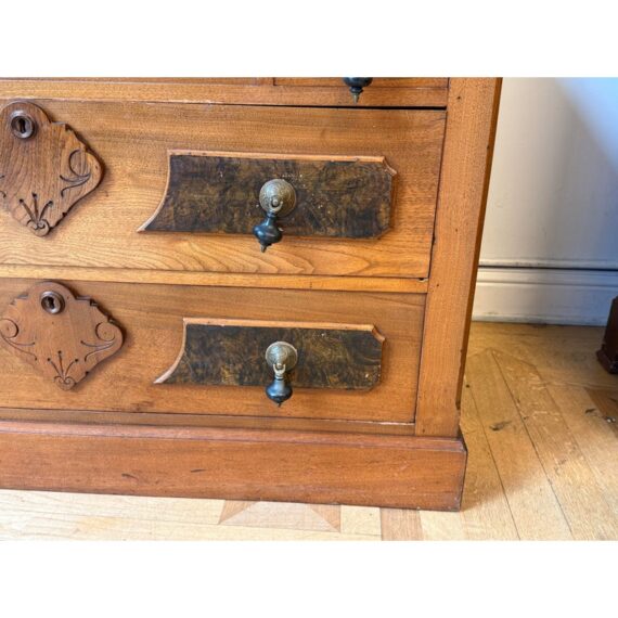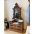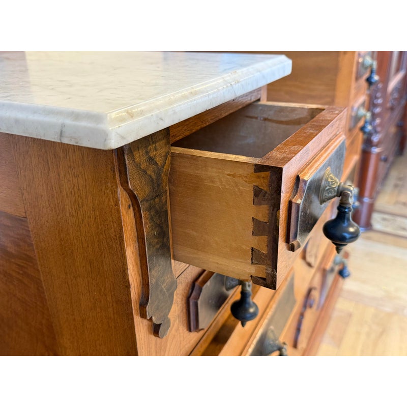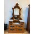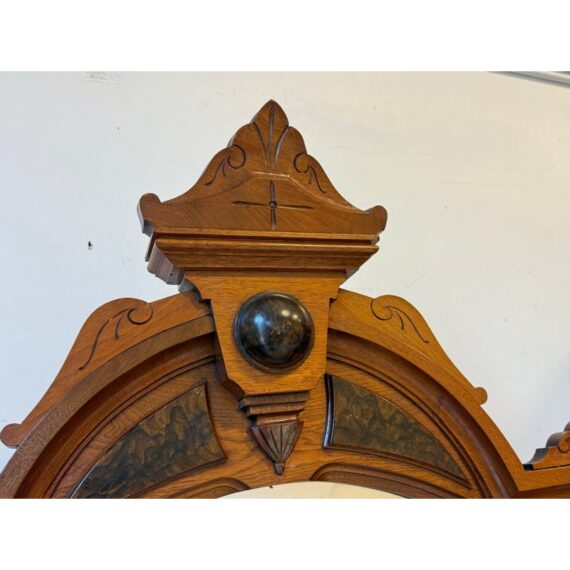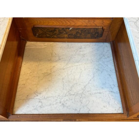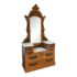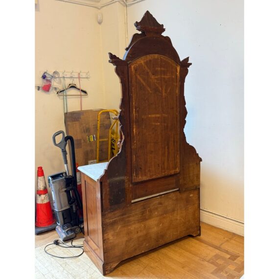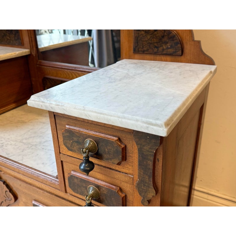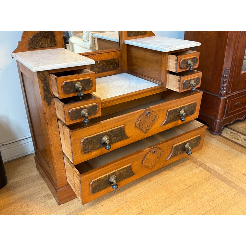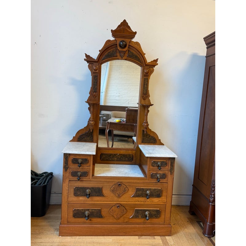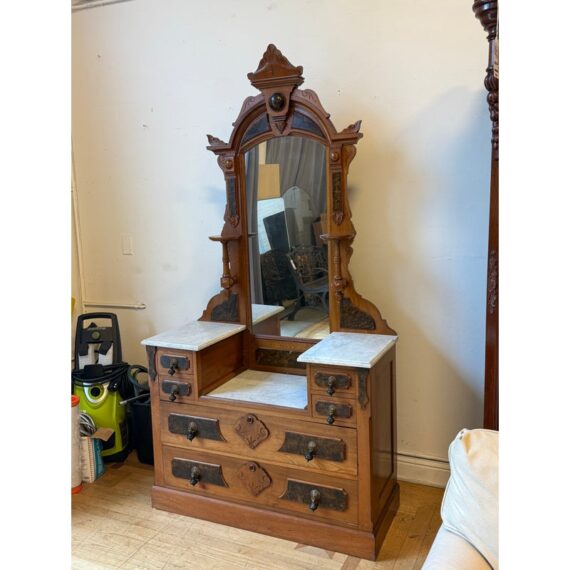 Design Plus Gallery presents a Vanity + Mirror from the Victorian Era, an Antique through + through. The vanity has a tall mirror in the center with crown molding + two side ledges that were meant to place candles at. The base piece offers two surfaces with marble tops that are raised and a middle lower marble surface with six drawers total. All original moldings, marble, and hardware. A highly functioning timepiece. In good condition for its antique age + use.