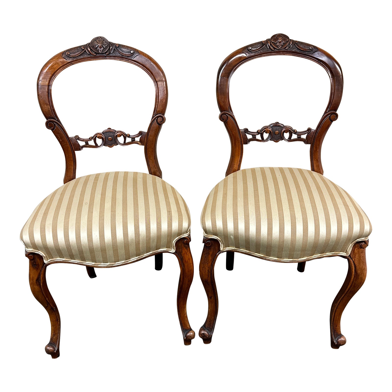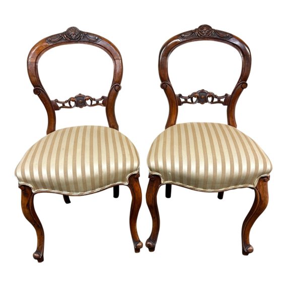 Design Plus Gallery presents a Pair of Antique Side Chairs. A pair of late-Victorian antique chairs exudes elegance and charm. Each chair features a spoon-shaped backrest that curves gently to provide both style and comfort. The chairs are expertly crafted from solid woods. They stand on Queen Anne legs, known for their graceful and slender design that adds a touch of sophistication to the overall look. The warm brown and cream striped satin upholstery adds a luxurious touch to the chairs, while the double piping detail highlights the craftsmanship and attention to detail that went into their creation. Visible and minor wear. In good condition. This is a discontinued model.