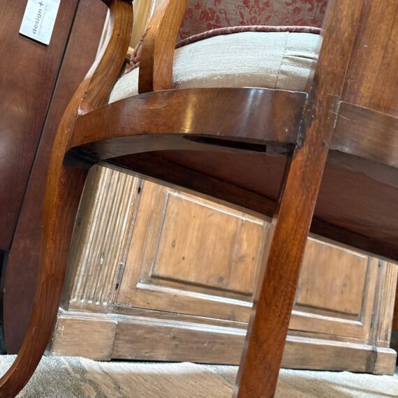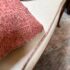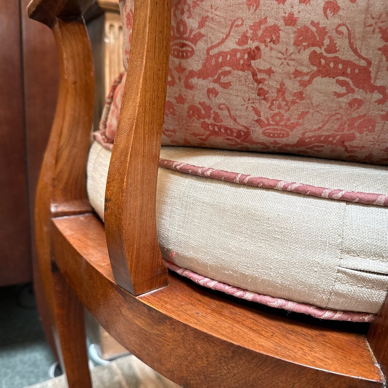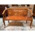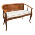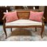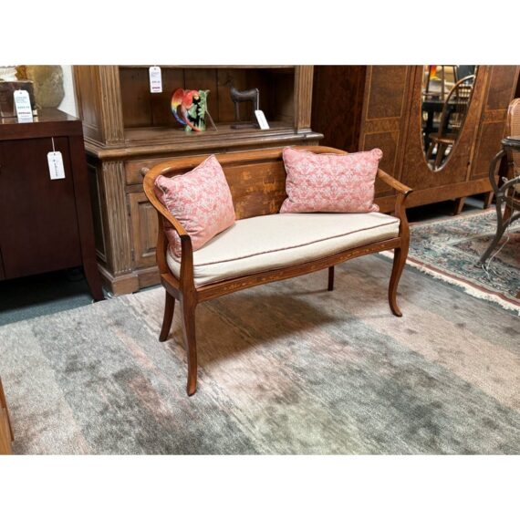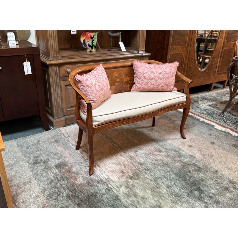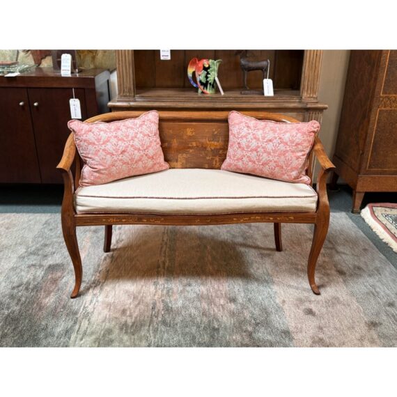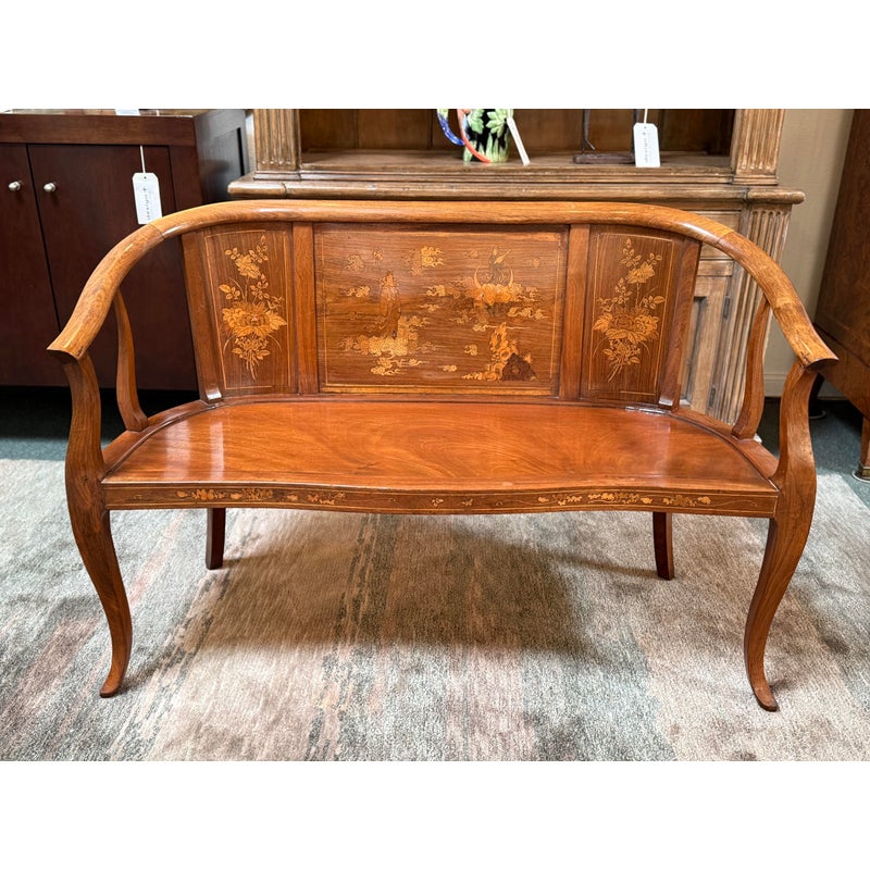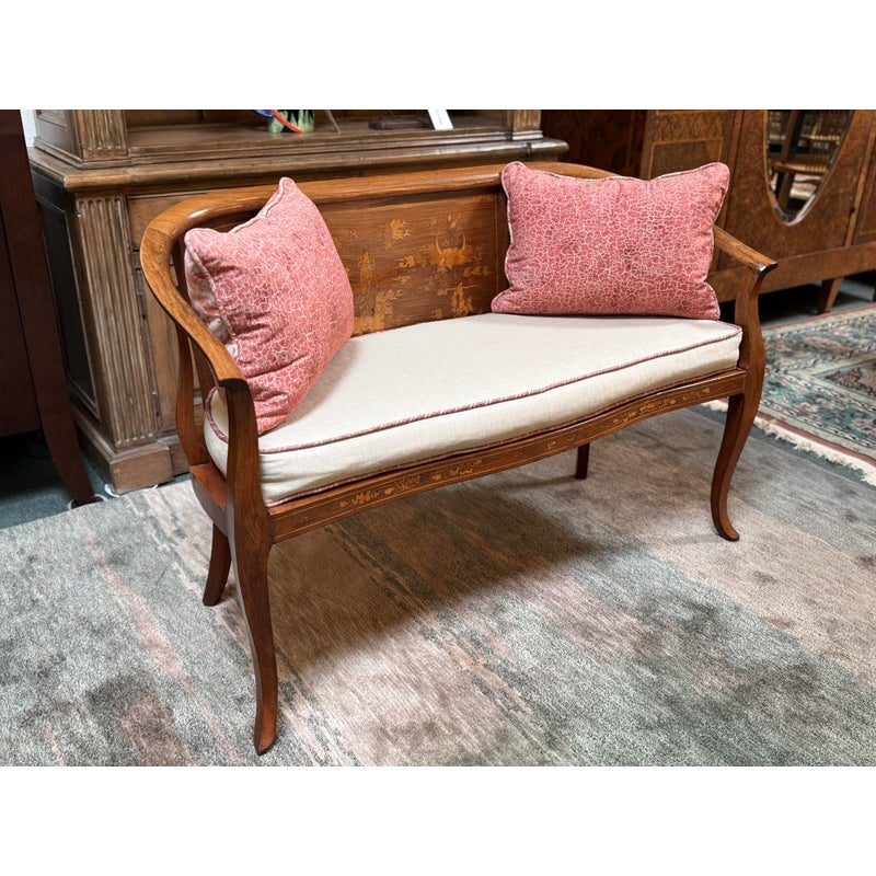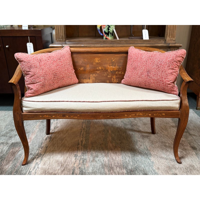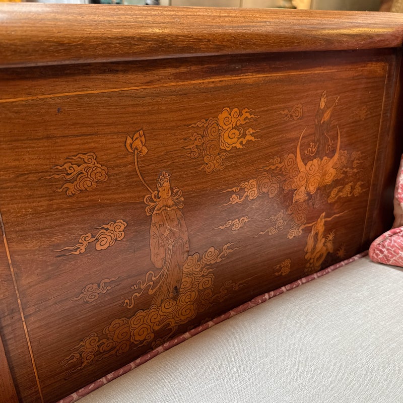 Design Plus Gallery presents an Antique Rosewood Settee from Vietnam. Beautifully inlaid with Boxwood in intricate flora patterns, the settee invites genteel comfort with Fortuny trimmed seat cushion and decor pillow pair. Do you know any gossip? Good, come sit here next to me! Light surface wear; condition is good for age and use.