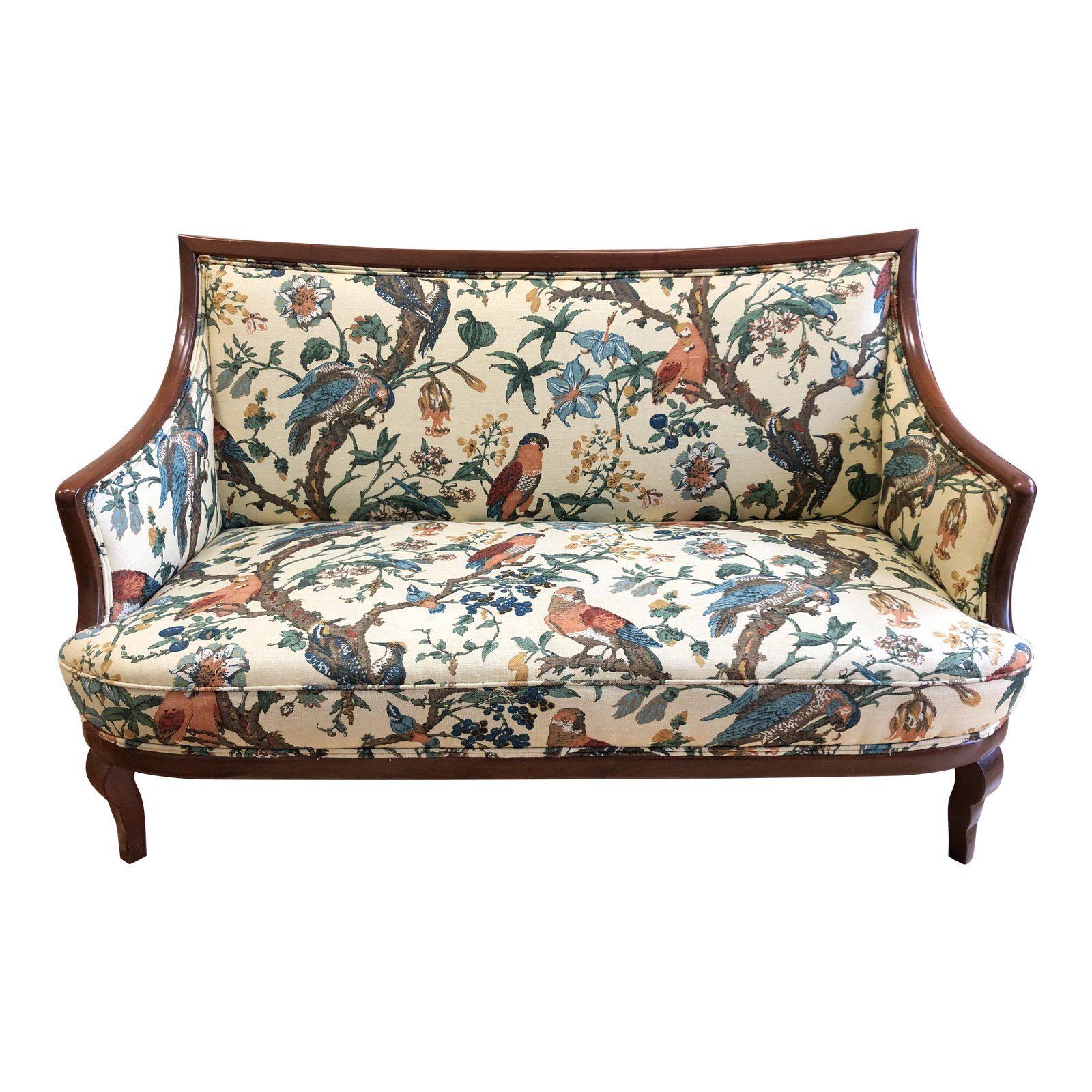 Design Plus Gallery presents an Elegant Antique Settee. Constructed of solid walnut wood with sleek curved and flared arms. In the 1970’s, the front, back and sides were upholstered in a bird motif design fabric. Two smoothed cabriole legs in the front with two saber legs on the back. Tight seat and backing, the seat springs show wear usage. Minor wear on fabric. Arm Height: 22 inches, Seat Height: 14 inches.