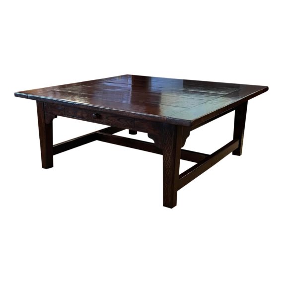 Design Plus Gallery presents an Antique Coffee Table. With a finish that has darkened with time, the wide pecan wood plank coffee table centers your seating area with a square expanse for display, games or entertaining. The solid wood construction that is simple elegance and timeless function, has a shallow drawer for remotes, etc. Vintage condition; consistent with age and use.