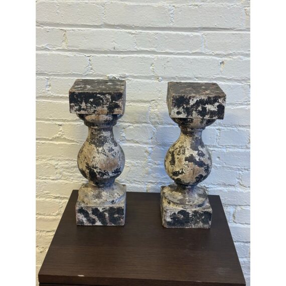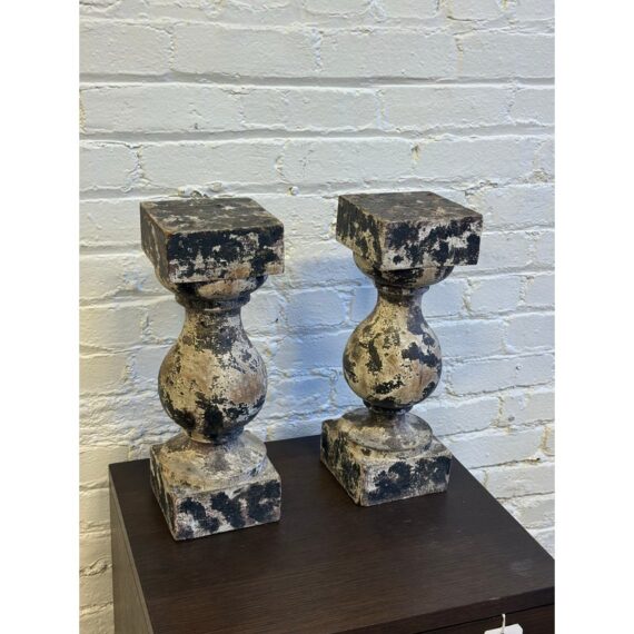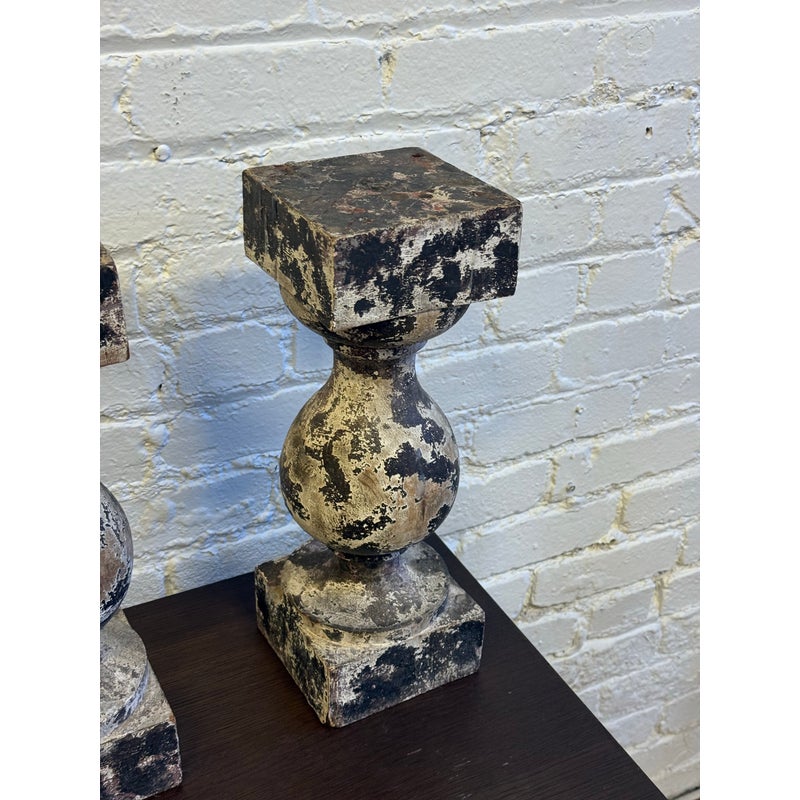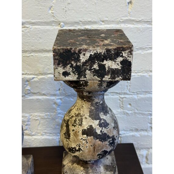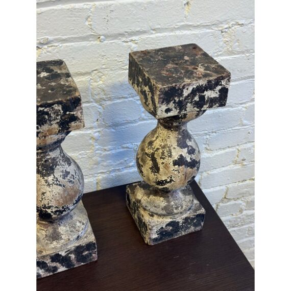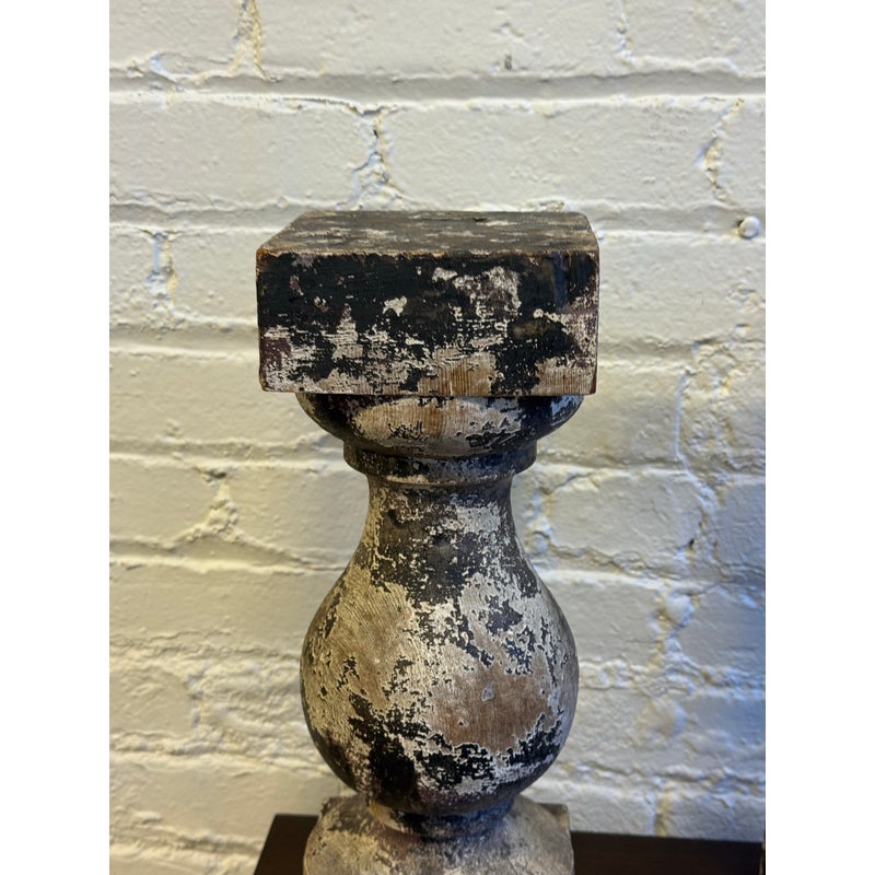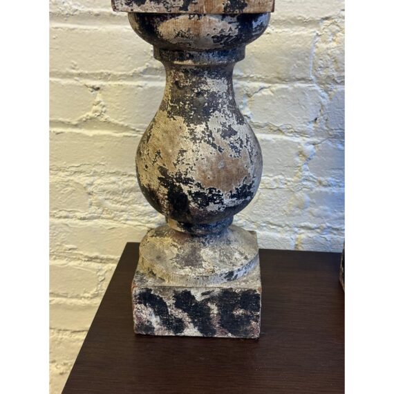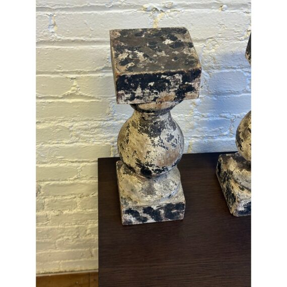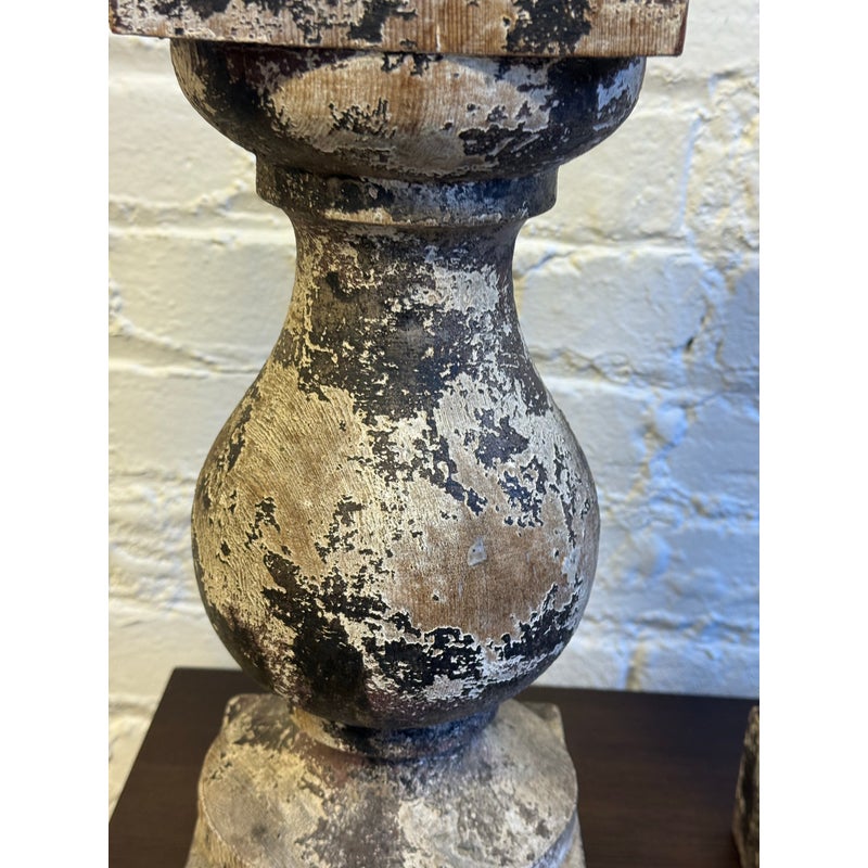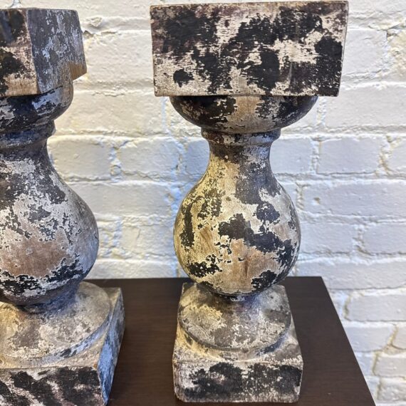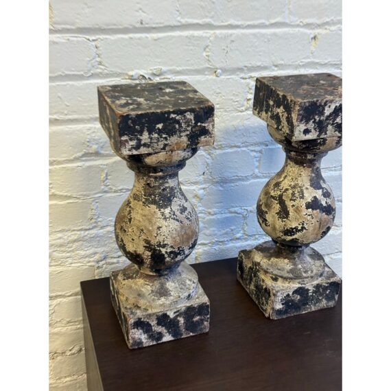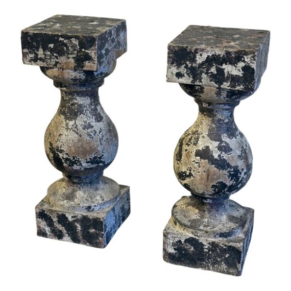 Design Plus Gallery presents a Pair of Wood Distressed Balustrades of Antique Age. These were part of architectural elements once used as upright supports for an elaborate railing and have been readily repurposed for decorative purposes. Made from wood, they show natural characteristics of age with wear. The visibly worn and chipped paint and wood surface indicate a “distressed” finish, which is from natural aging. In good condition, visible and minimal wear.