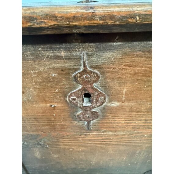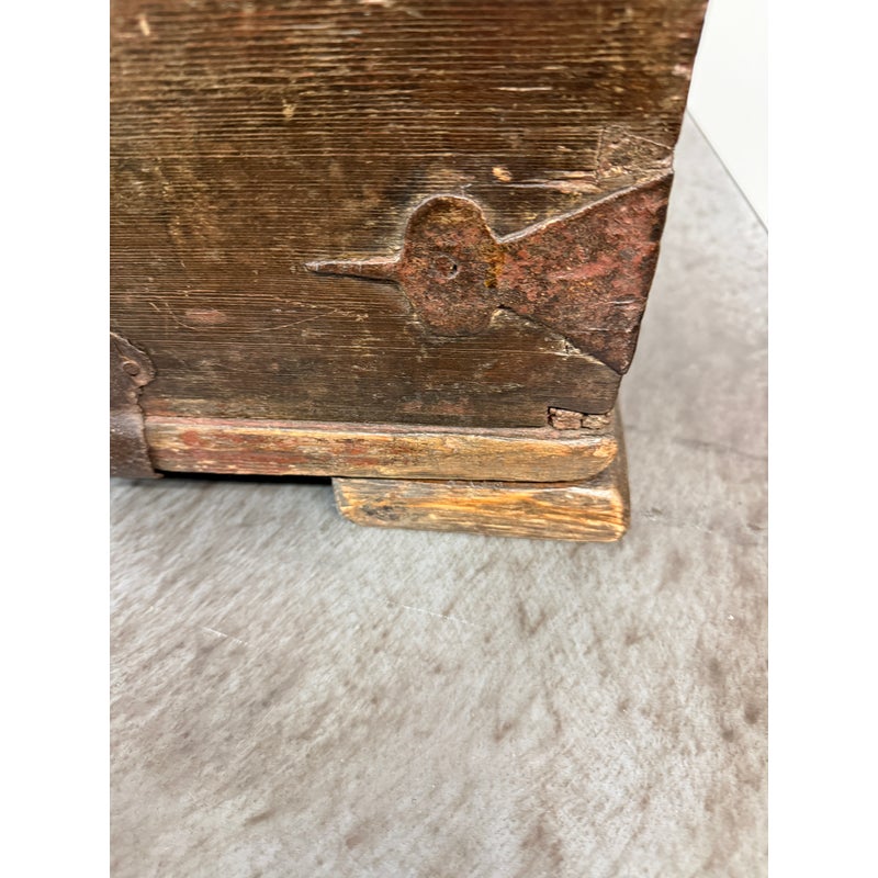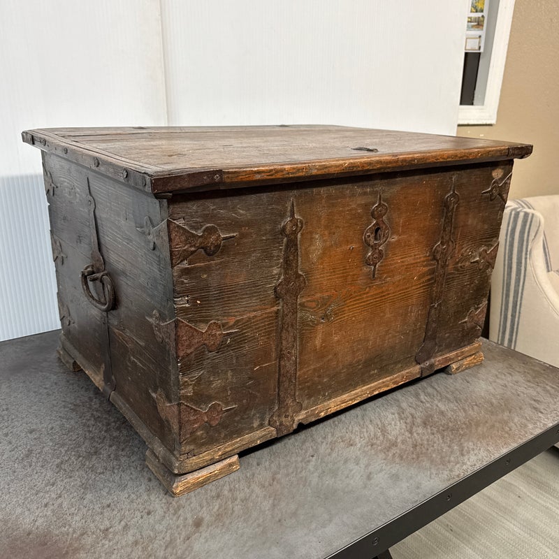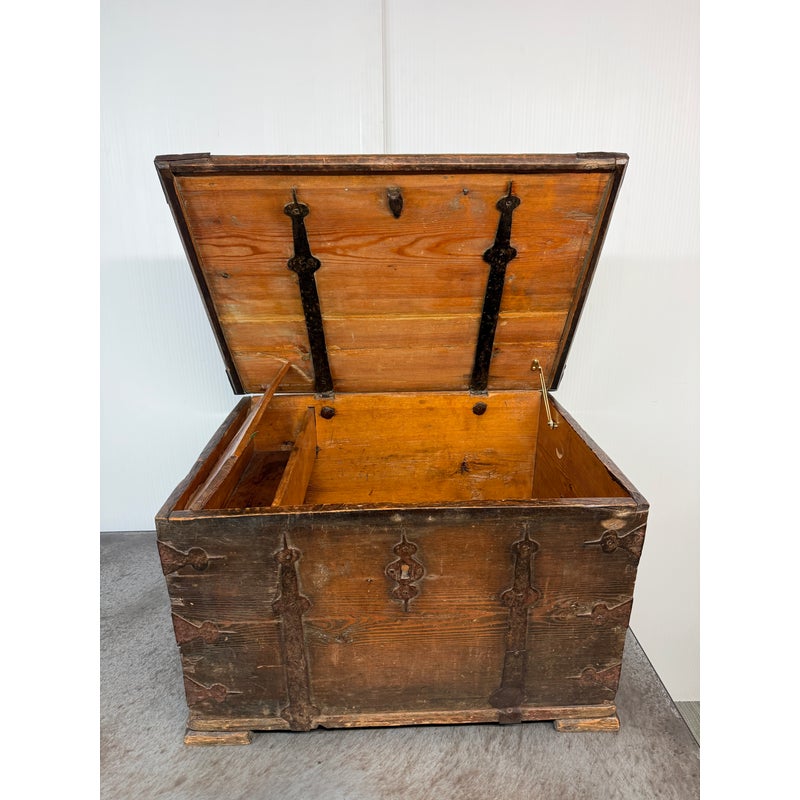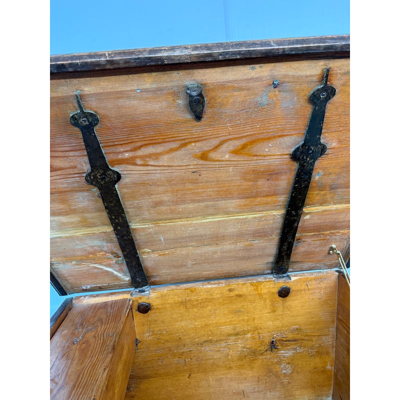 Design Plus Gallery presents an European Antique Wooden Chest. Crafted from solid woods and iron. In good antique condition, natural distress and visible and minimal wear from usage.